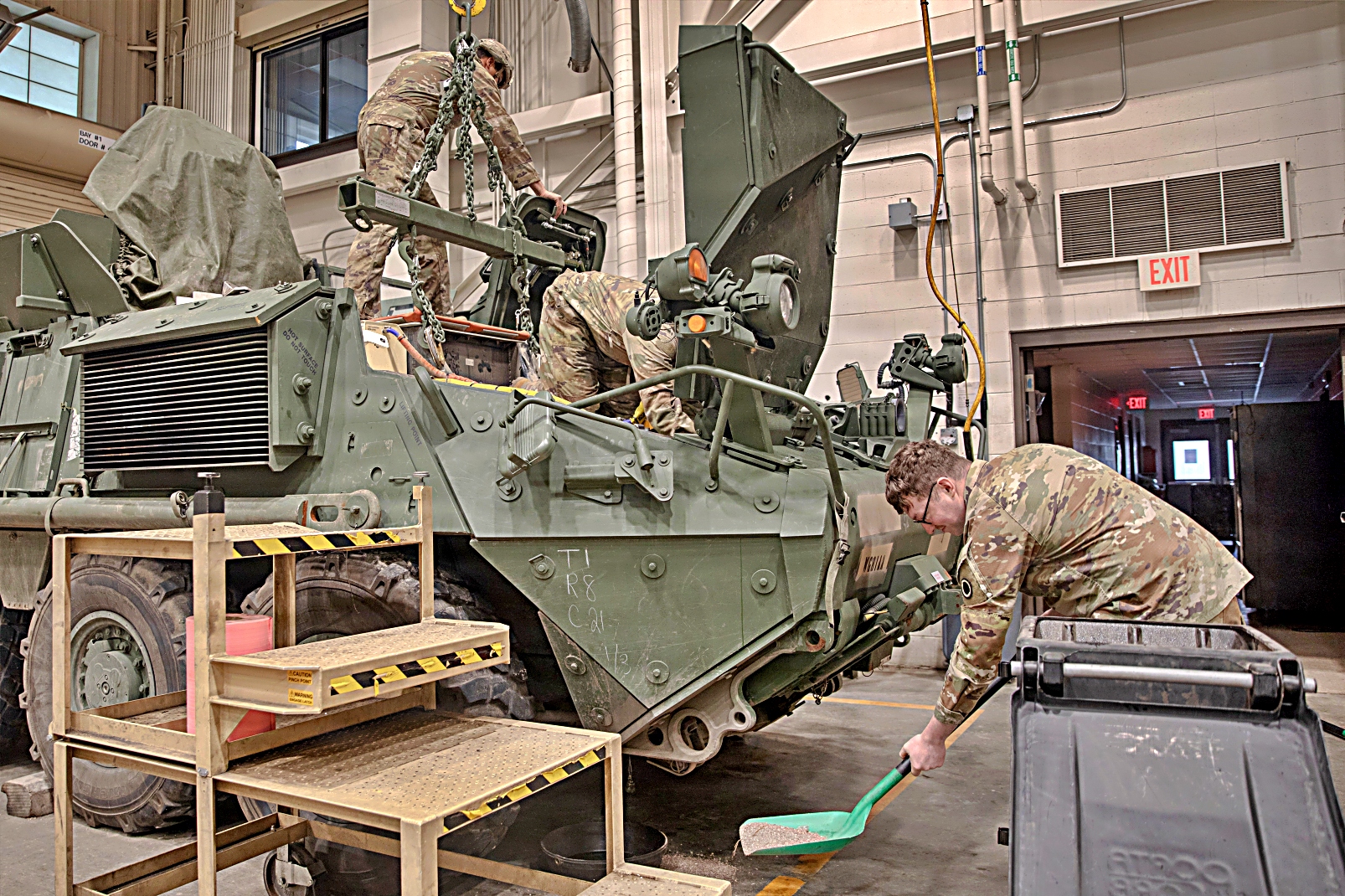 2026년 1월 12일, 워싱턴주 Lewis-McChord 합동기지(JBLM)의 제13전투지원대대 제542지원정비중대 차량정비소에서 미군 제35정비지원팀-스트라이커(35th Maintenance Surge Team–Stryker) 소속 장병들이 Stryker 장갑차에 대한 정기 점검을 실시하고 있다. 제593군단군수사령부 예하 제35정비지원팀-스트라이커는 JBLM 전역의 부대들을 위해 Stryker 장갑차를 정비하여 장비가 임무 수행 준비 태세를 유지하도록 지원하고 있으며, 최근에는 제2스트라이커여단전투팀(2nd Stryker Brigade Combat Team)의 제2차 한국 순환파견 배치를 앞두고 이러한 정비 작업을 진행했다.