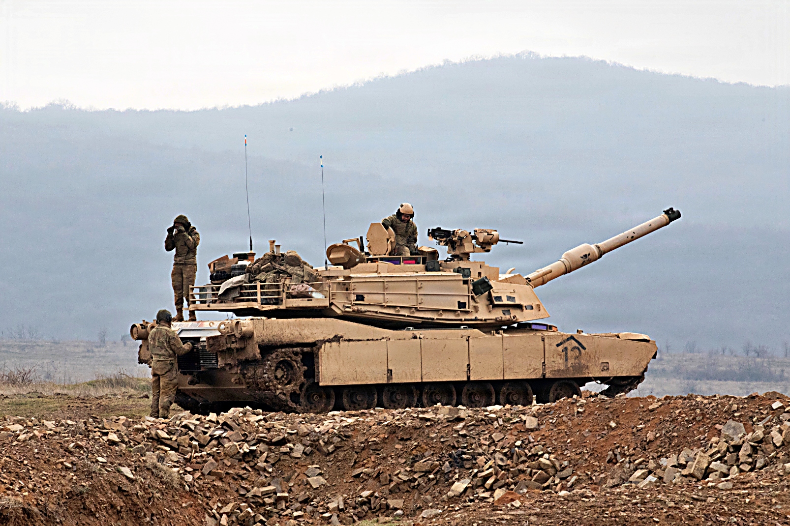 미 육군 제1보병사단 제1기갑여단전투팀 제16보병연대 제1대대 Charlie 중대 소속 병사들이 2026년 1월 23일 불가리아 Novo Selo 훈련장에서 M1A2 Abrams 주력 전차와 M2A3 Bradley Fighting Vehicle를 운용하며 합동 사격 훈련을 실시하고 있다.