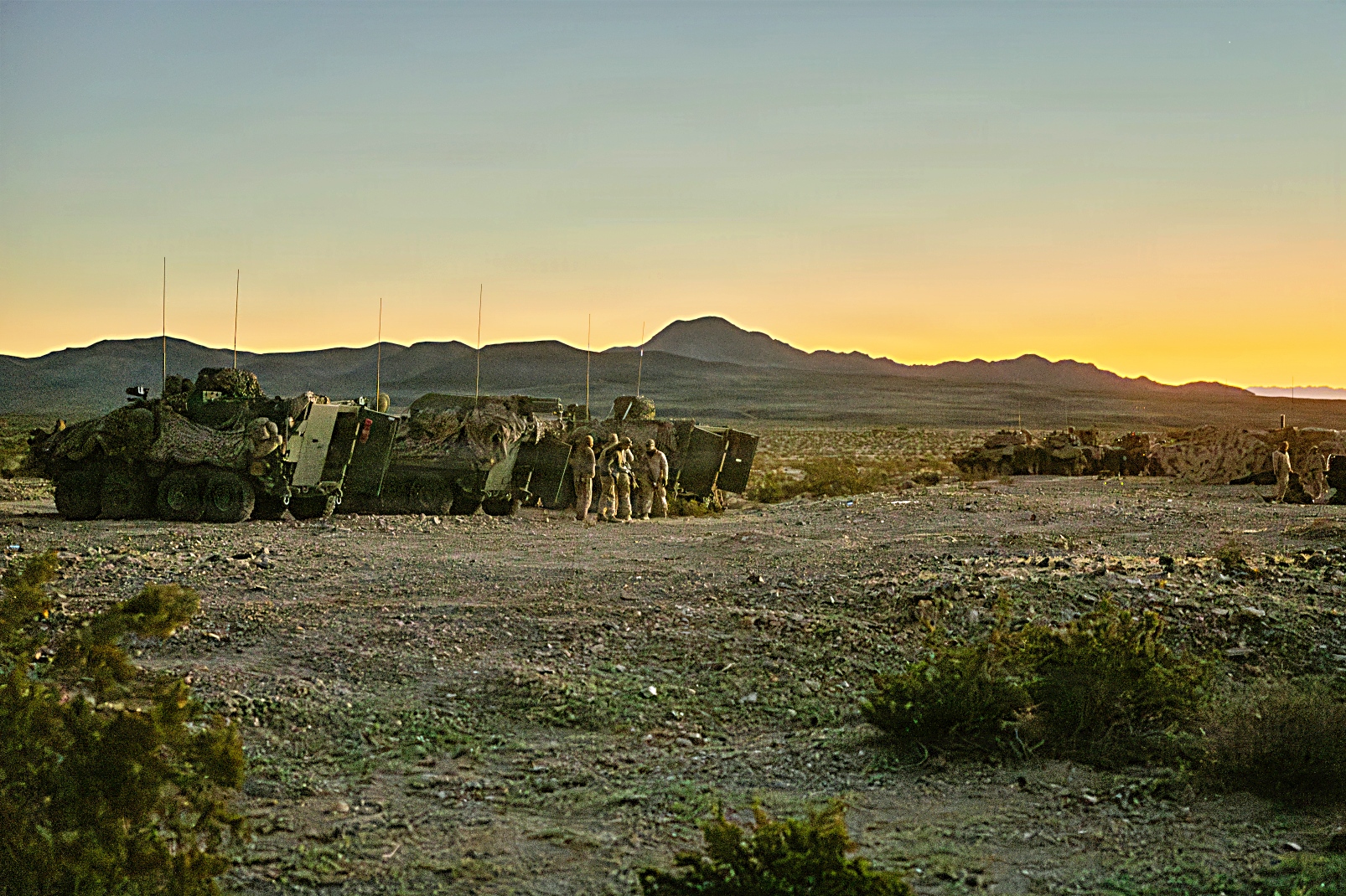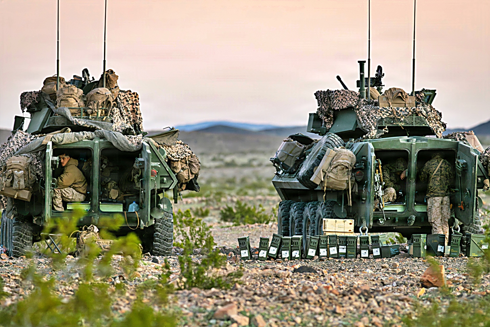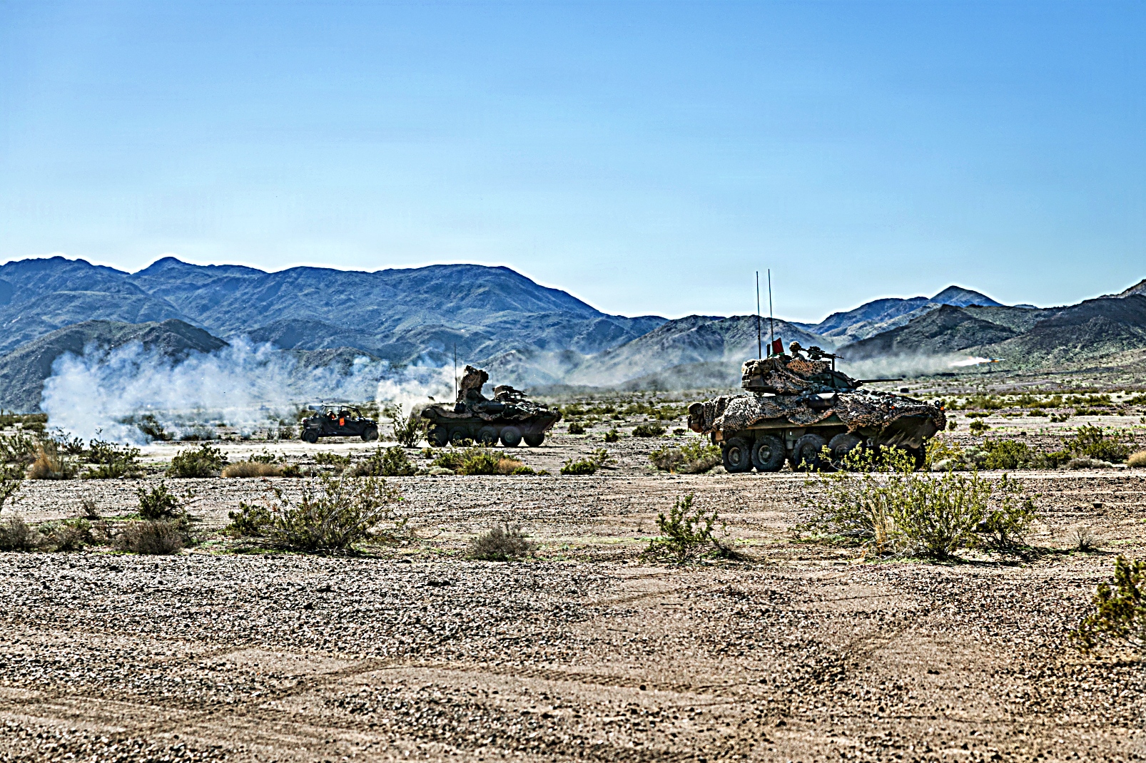 2026년 1월 16일, 캘리포니아주 Twentynine Palms 해병항공지상전투센터에서 실시된 Service Level Training Exercise 1-26 훈련의 일환으로, 제1해병사단 제1경장갑정찰대대 소속 미 해병대 경장갑차량이 LAR 소대 공격 훈련 중 TOW 유도 미사일을 발사하고 25mm 체인건을 사격하고 있다. LAR 소대 공격 훈련은 지원 화력 지원을 받으며 신속한 공격을 수행하는 능력을 평가하는 훈련으로, 지원 포병과의 기동 협조, 자체 정보, 감시 및 정찰 자산의 활용, 그리고 소형 무인항공기(UAS) 공격 운용을 연계하는 것을 목표로 한다.