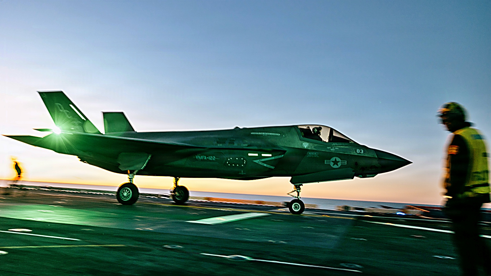 2026년 1월 26일, 태평양에서 미 해병대 제11해병원정군(MEU)에 배속된 VMFA-122 해병전투비행대대 "Werewolves" 소속 F-35B Lightning II 공격기가 Wasp급 상륙함 USS Boxer (LHD 4)의 비행갑판에서 이착함 훈련을 실시하고 있다.