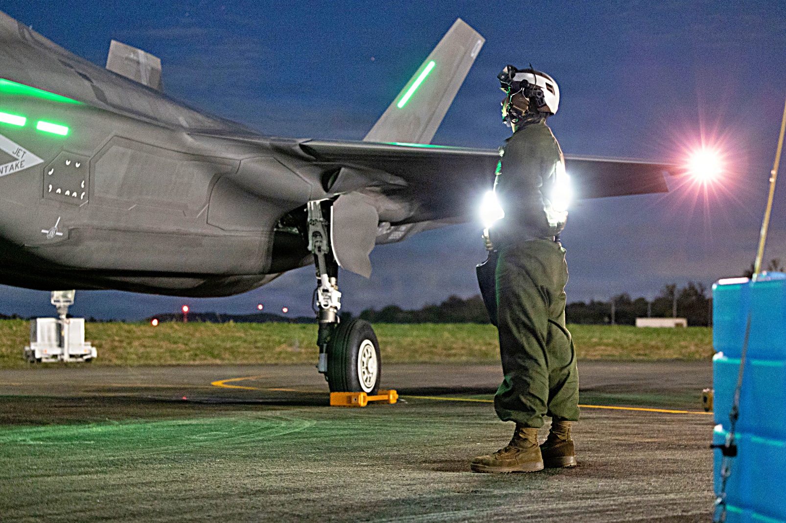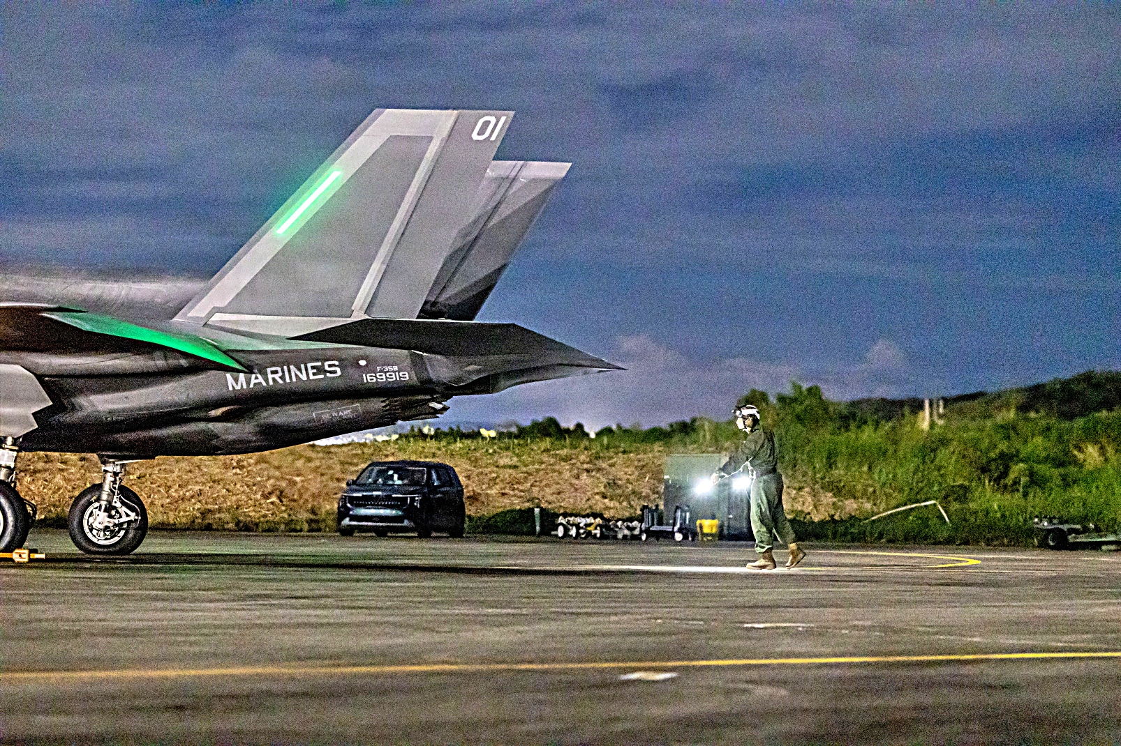 2026년 1월 1일, 새해 첫날 새벽부터 미 해병대 F-35B Lightning II 공격기가 푸에르토리코의 Jose Aponte de la Torre 공항에서 야간 비행작전을 위해 이륙 준비를 하고 있다. 미군은 미 남부사령부의 임무, 전쟁부 지시 작전, 그리고 마약 밀매 차단 및 국가 안보 보호라는 대통령의 우선순위를 지원하기 위해 카리브해 지역에 배치됐다.