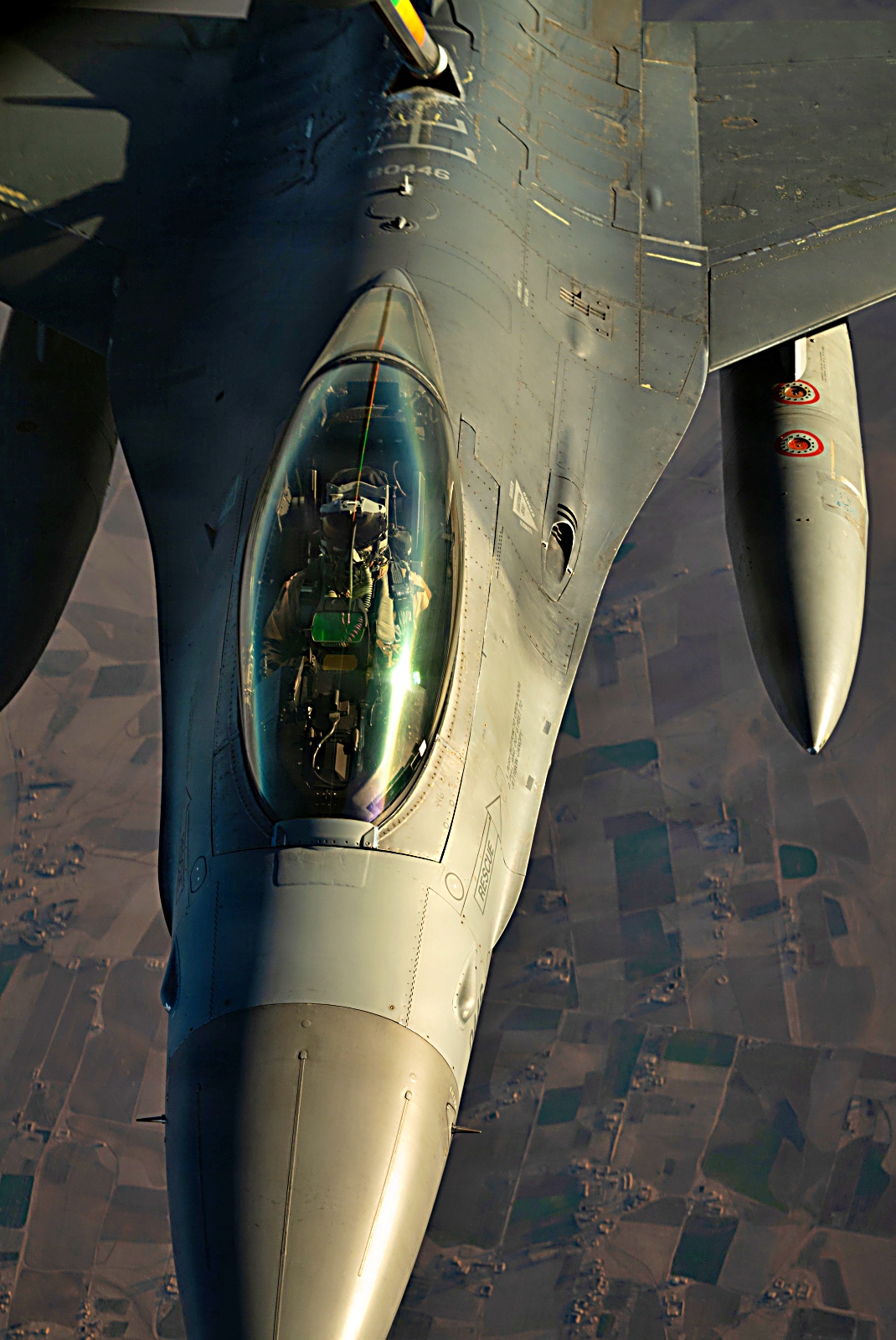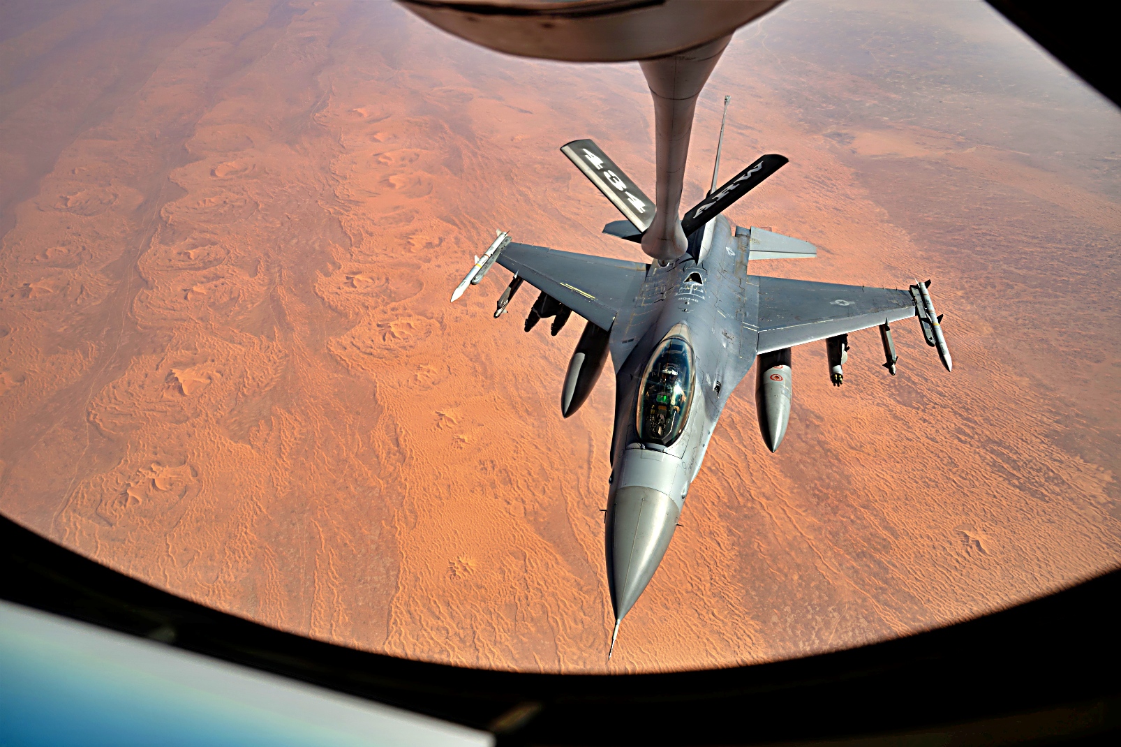 2026년 1월 4일, 미 중부사령부 작전책임지역 상공에서 미 공군 F-16 Fighting Falcon 전투기가 제74원정공중급유비행대대 소속 KC-135 Stratotanker 공중급유기로부터 공중급유를 받으며 임무 비행을 수행하고 있다.