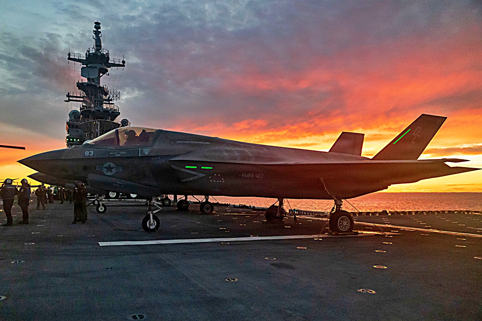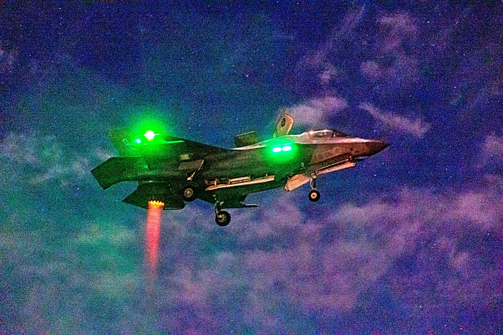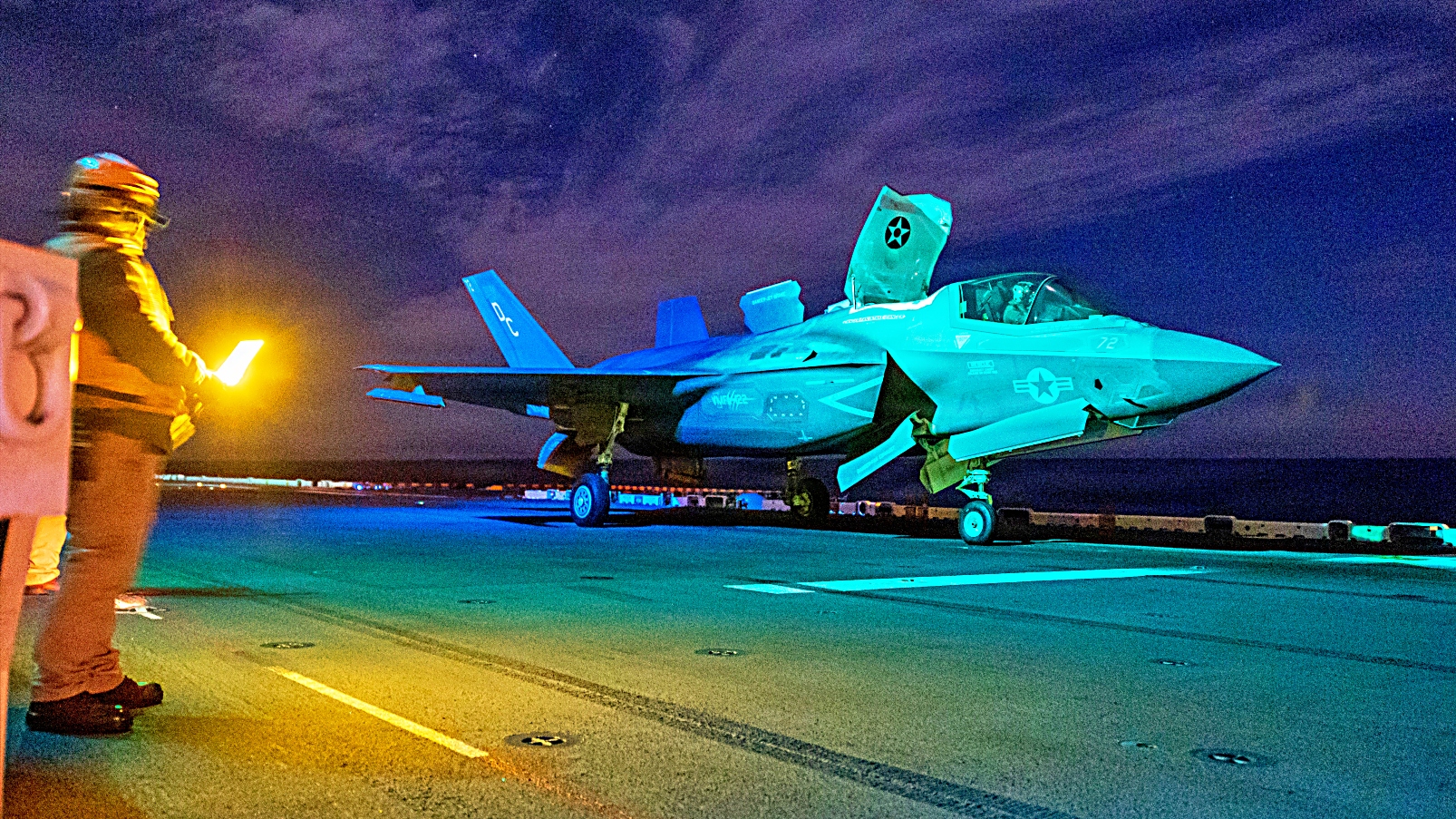 2026년 1월 27일, 태평양에서 미 해병대 제11해병원정군(MEU)에 배속된 VMFA-122 해병전투비행대대 "Werewolves" 소속 F-35B Lightning II 공격기가 Wasp급 상륙함 USS Boxer (LHD 4)의 비행갑판에서 야간 이착함 훈련을 하며 엔진에서 화염을 뿜고 있다.