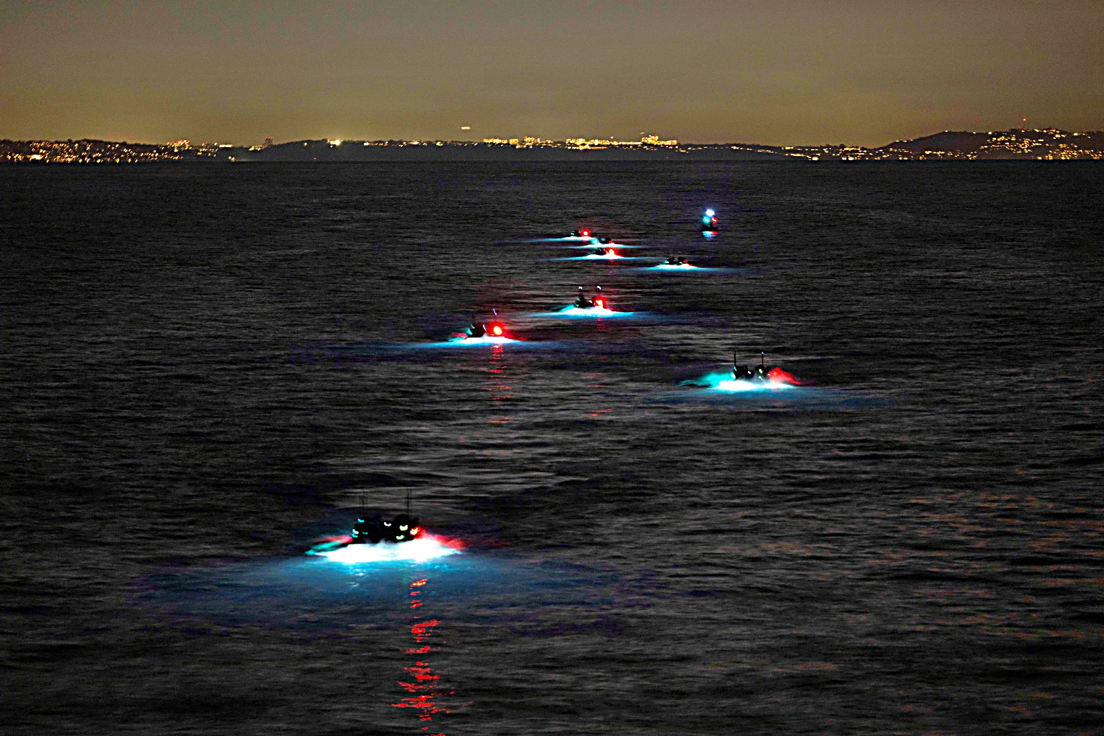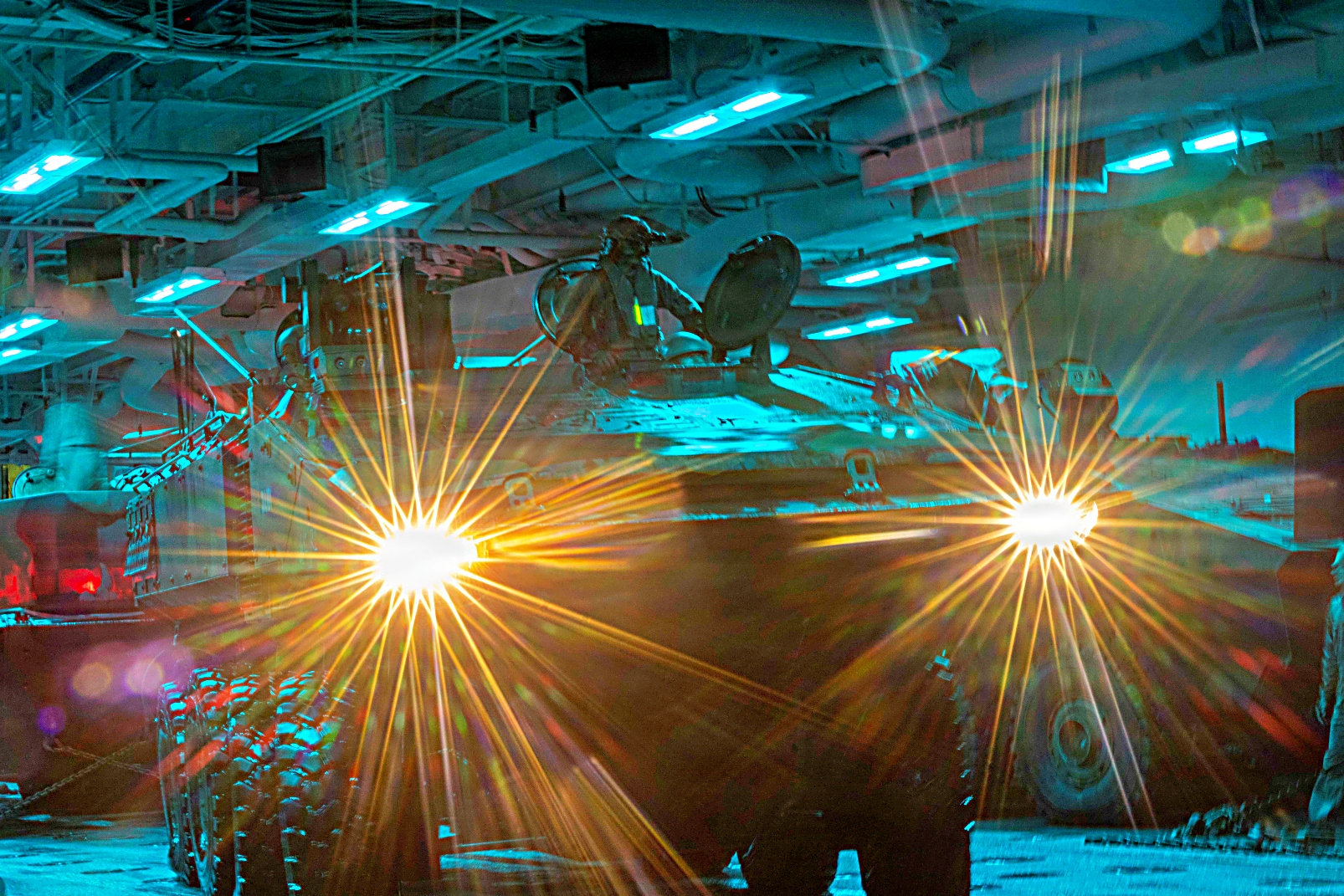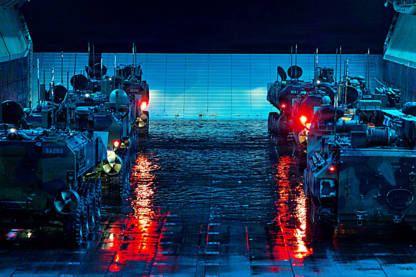2026년 1월 26일 캘리포니아 해안에서 실시된 분기별 해상 상륙 준비 훈련 26.2 (QUART : Quarterly Underway Amphibious Readiness Training 26.2)의 일환으로 Wasp급 상륙함 USS Makin Island (LHD 8)의 웰독에서 상륙전투차량 Amphibious Combat Vehicle이 해안으로 출격하고 다시 복귀하며 야간 강습 상륙 훈련을 수행하고 있다.