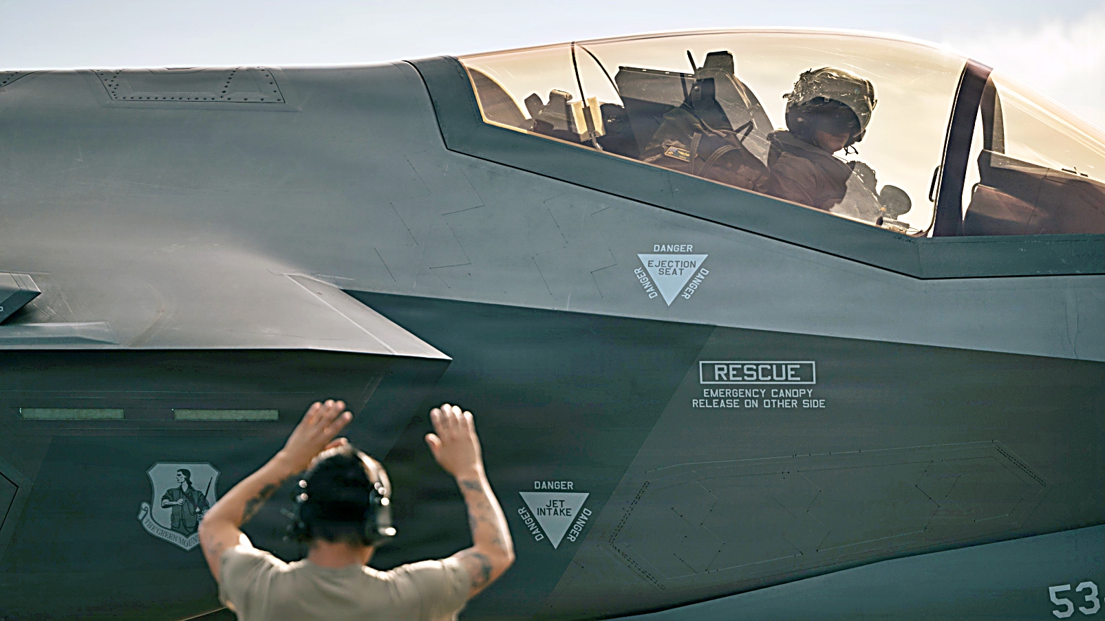 미 공군 F-35A Lightning II 공격기가 2025년 12월 20일 푸에르토리코 Ceiba에 처음 착륙후 주기장으로 택싱하고 있다. 미군은 남부사령부 임무, 전쟁부 지시 작전, 그리고 마약 밀매 차단 및 국가 안보 강화라는 대통령의 주요 정책 목표를 지원하기 위해 카리브해 지역에 배치되어 있다.