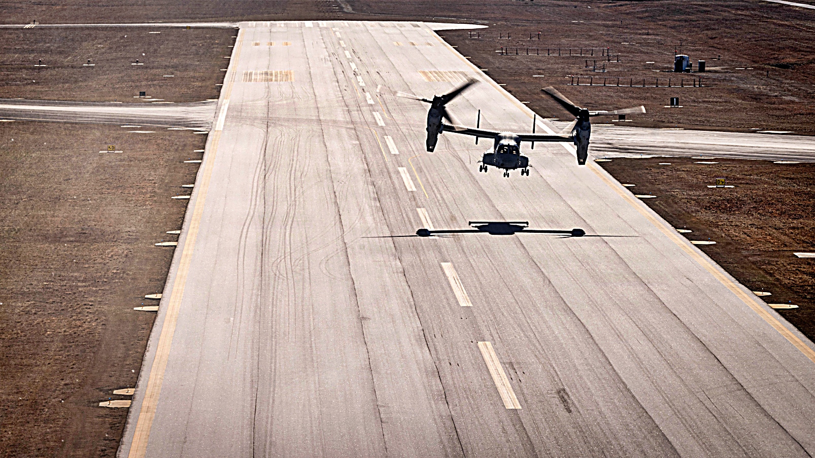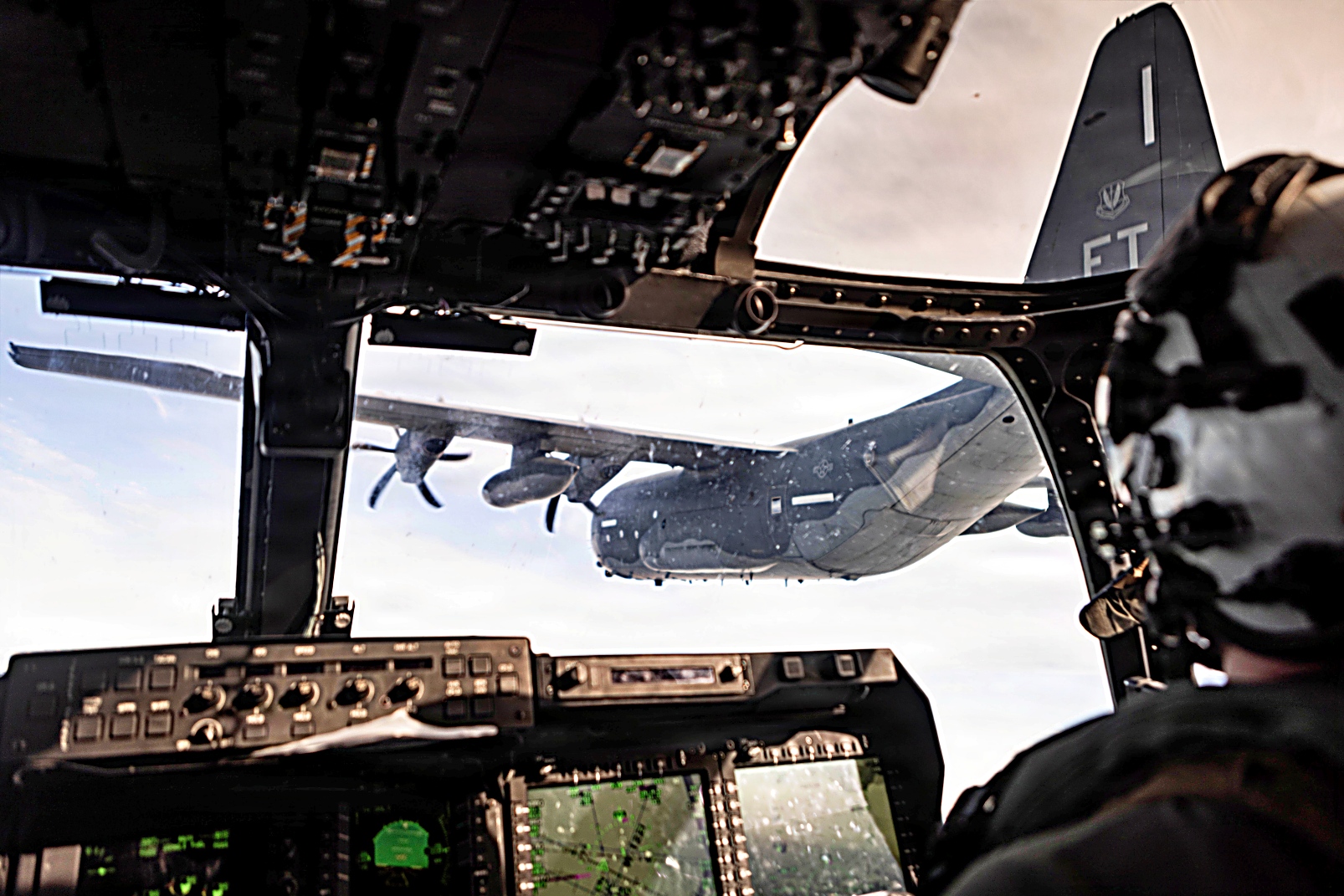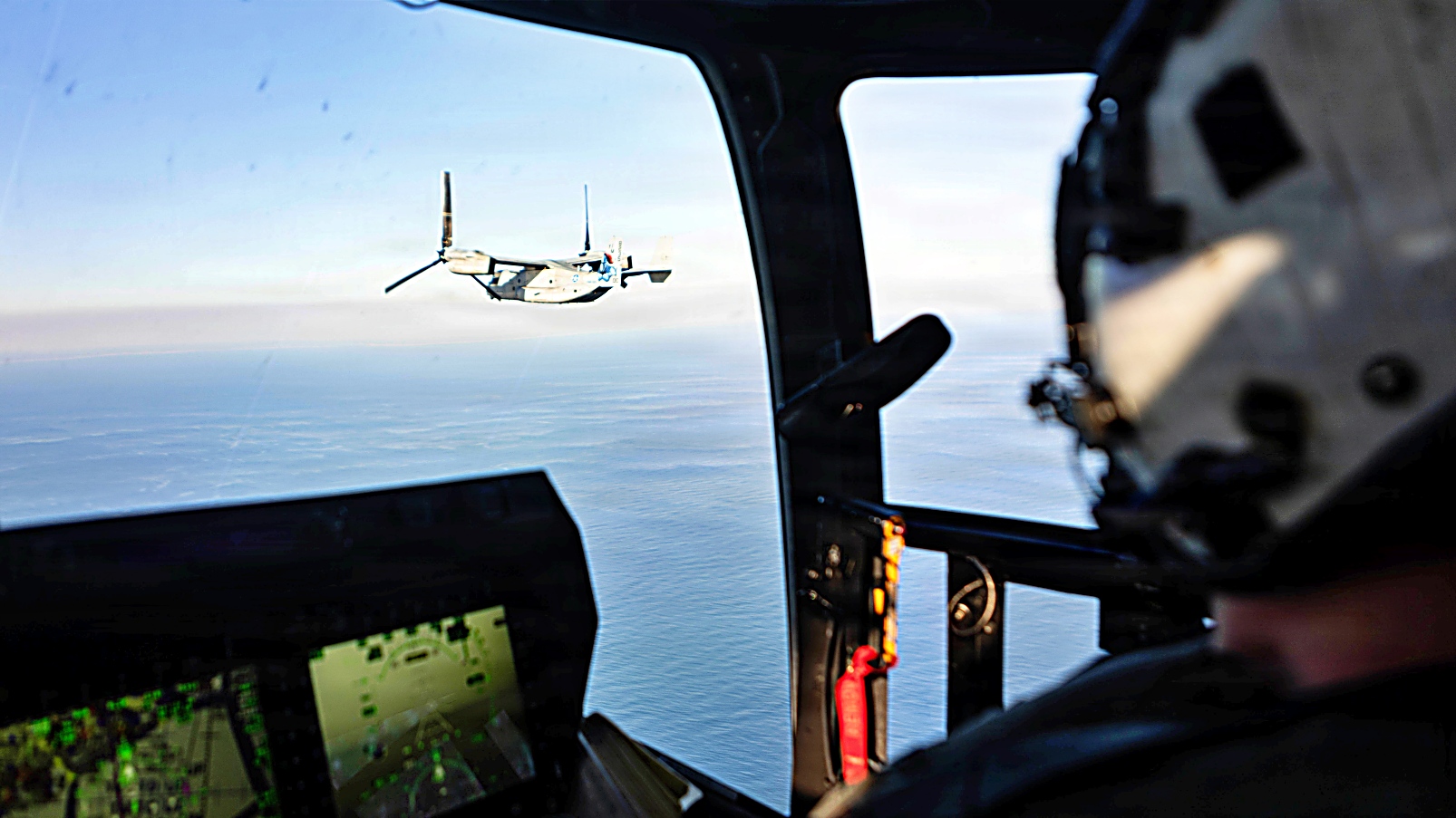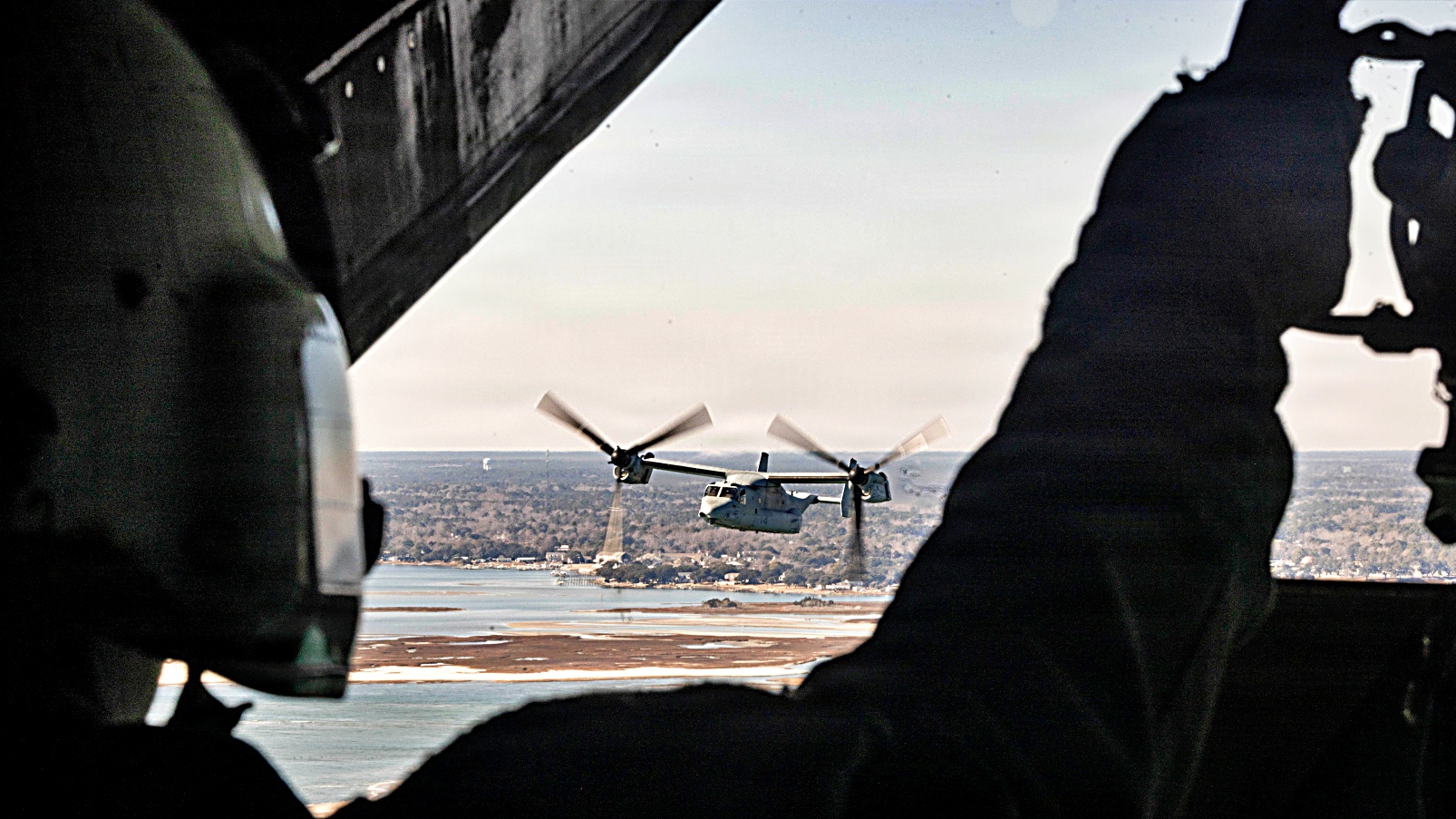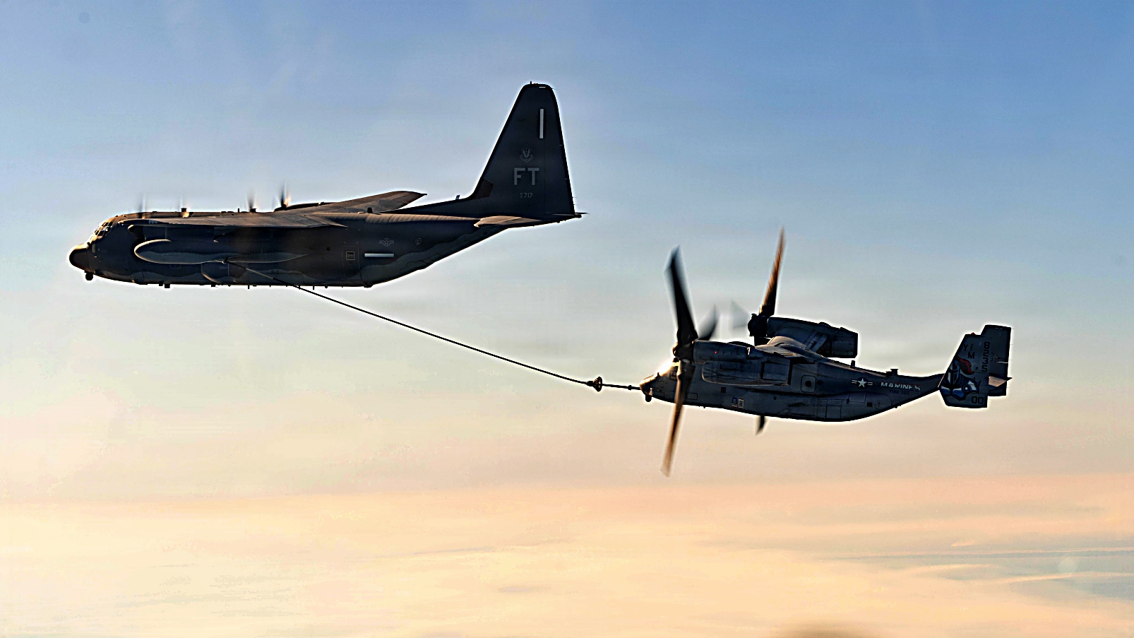 미 해병대 VMM-365 강화형 중형 틸트로터 비행대 소속 해병대원들과 제347구조비행단 소속 공군 장병들이 2026년 1월 28일 노스캐롤라이나주 New River 해병 항공기지에서 제347구조비행군 예하 제71구조비행대 소속 HC-130J Combat King II 특수작전급유수송기와 전술 공중 급유 훈련에 참가하고 있다. 전술 공중 급유 작전은 항공기의 유효 항속 거리를 늘리고 공중 작전 능력을 확장하는 데 도움이 된다. 제24해병원정군(MEU)는 어떤 기후와 장소에서도 국가의 부름에 응할 준비가 되어 있는 해병공지기동임무군(MAGTF)이다.