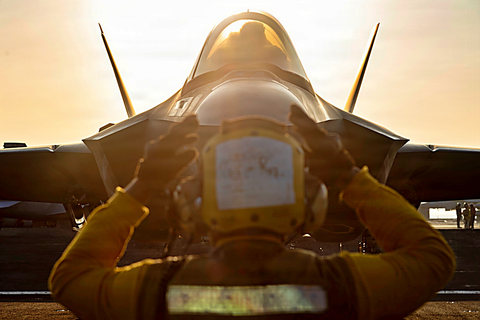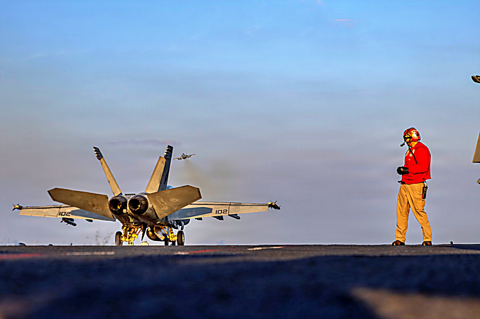 2026년 1월 29일, 아라비아해에 배치된 미해군 Nimitz급 항공모함 USS Abraham Lincoln (CVN 72)의 비행갑판에서 VFA 41 및 VFA-14 소속 F/A-18F Super Hornet 전투기가 이륙하고 VMFA-314 소속 F-35C 공격와 VAW 117 소속 E-2D Hawkeye 조기경보기가 이륙 준비를 하고 있다.