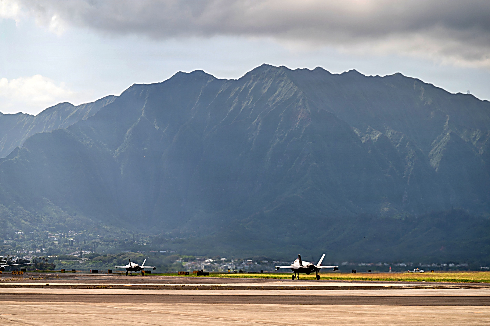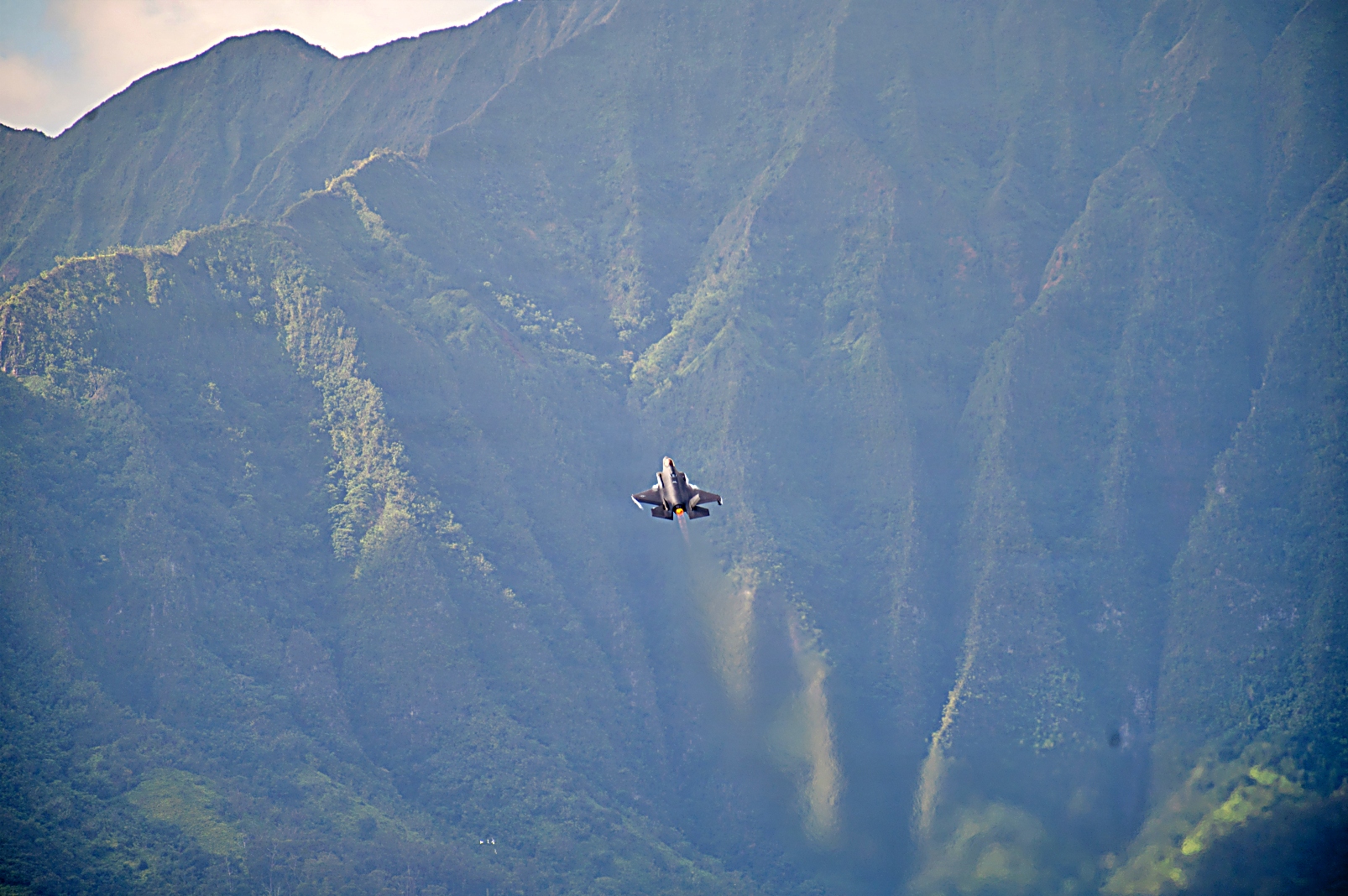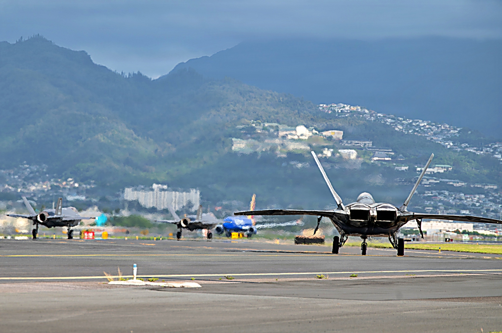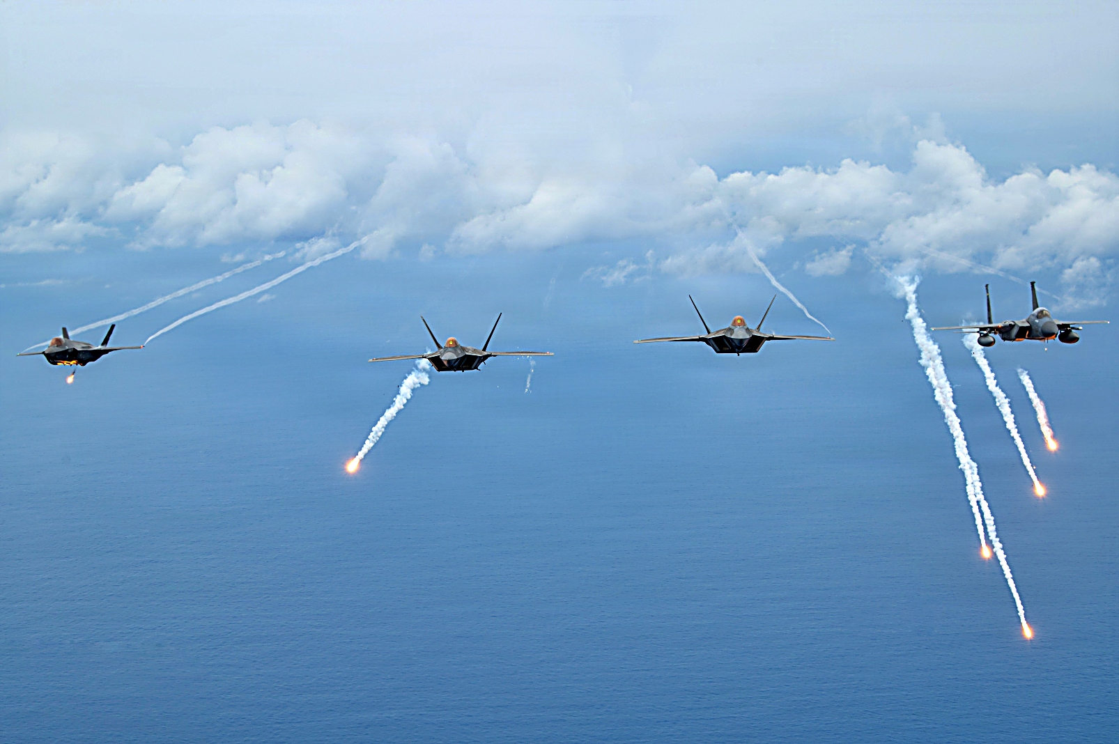 2026년 1월 20일, 태평양 상공에서 실시된 Sentry Aloha 26-1 훈련 중, 위스콘신 주방위군 제115전투비행단 소속 F-35A Lightning II 공격기, 하와이 주방위군 제199전투비행대 소속 F-22A Raptor 전투기, 그리고 루이지애나 주방위군 제159전투비행단 소속 F-15C/D Eagle 전투기가 플레어를 발사하고 있다. Sentry Aloha 훈련은 서로 다른 성능을 가진 항공기들을 상대로 전투 시나리오를 수행하는 이종 기종 공중전 훈련 (Dissimilar Air Combat Training)을 중심으로 구성되어 있다.