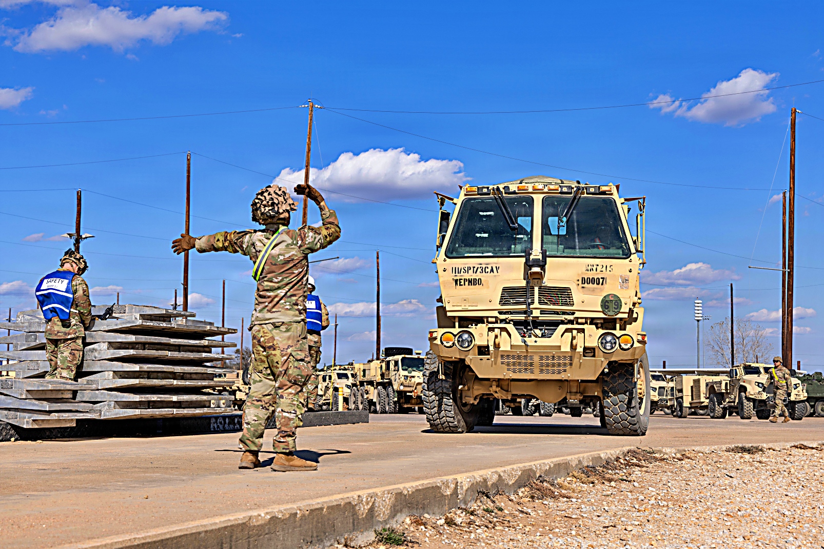 2026년 2월 3일, 텍사스주 Fort Hood에서 제1기병사단 제3기병연대 소속 차량들이 철도 수송 작업을 위해 적재되고 있다.