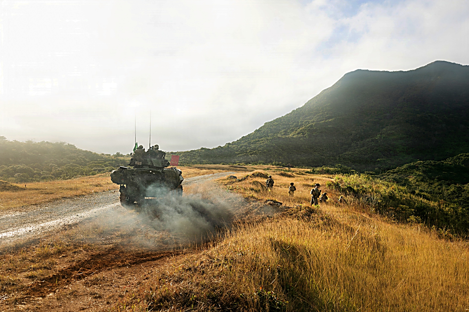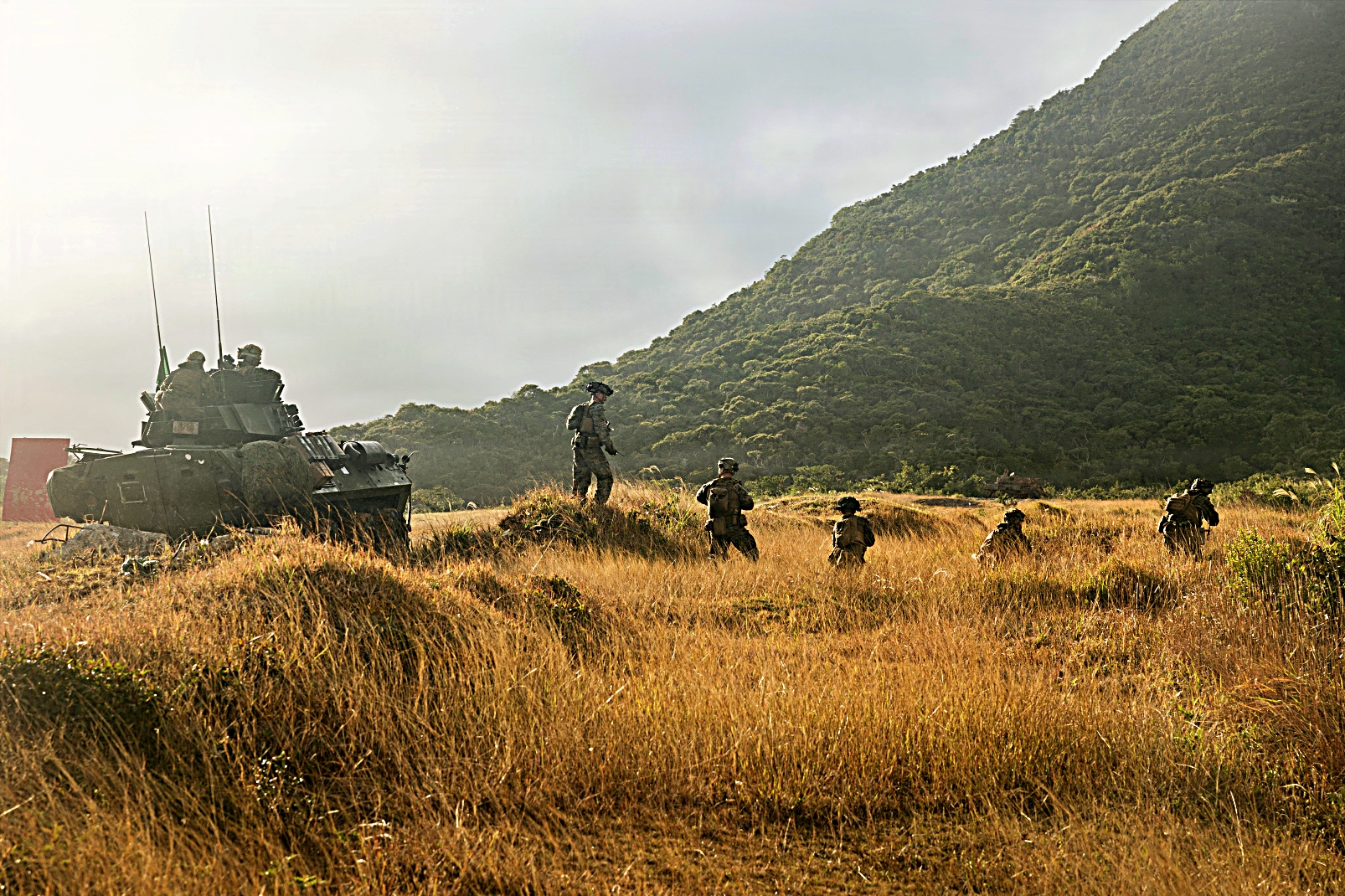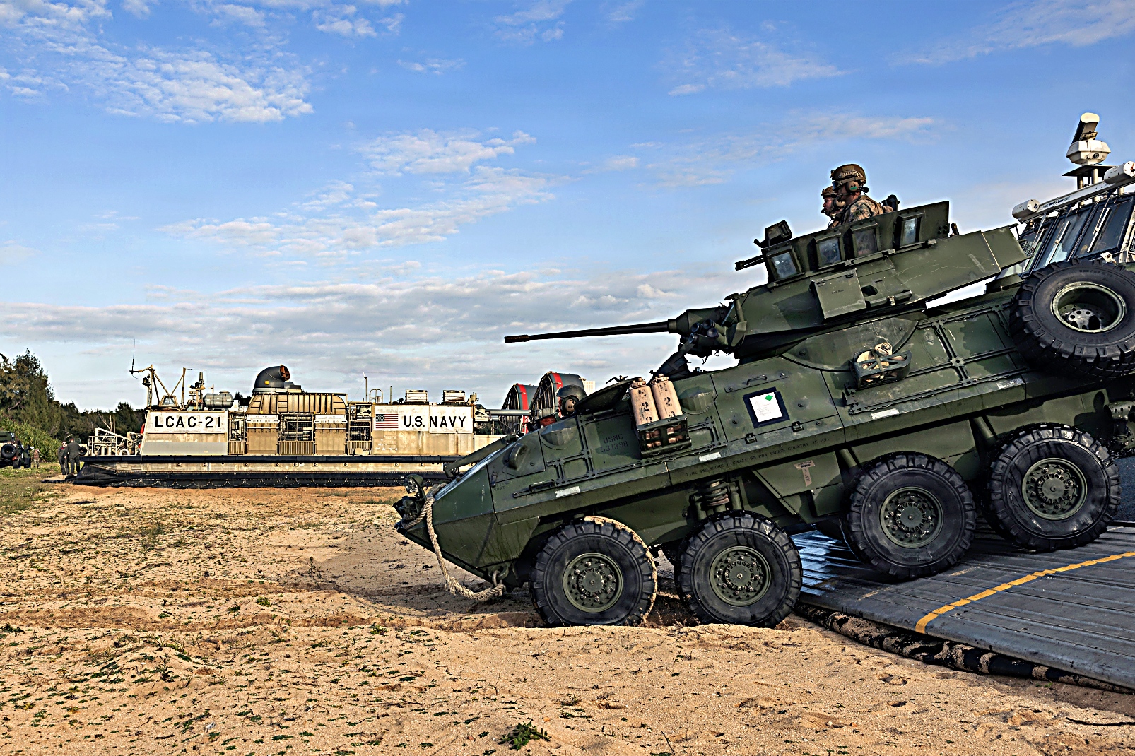 2026년 2월 1일, 일본 오키나와 Camp Schwab에서 미 해병대 제31해병원정군 제1해병연대 제3대대 륙팀 무기중대 소속 합동경전술차량(JLTV)이 통합 공격 훈련 중 경계 태세를 갖추고 있는 가운데 Kin Blue Beach 훈련장에서 통합 훈련의 일환으로 함정에서 해안으로 이동하는LAV 장갑차를 하역하고 있다. 이 훈련은 경장갑 정찰(LRR Light Armored Reconnaissance)과 합동대전차팀(CAT Combined Anti-Armor Team) 차량 탑재 사격과 도보 기동을 통합하여, 제3대대 상륙팀의 수상 임무 수행 능력과 항공기 인원 전술 구조 능력을 향상시켰다. 제31해병원정군은 미 제7함대 작전구역 내 Tripoli Amphibious Ready Group 소속 함정들을 운용하는 지속적이고 전투력이 뛰어난 전력으로, 동맹국 및 파트너 국가들과 정기적으로 협력 및 작전을 수행하며 인도태평양 지역의 억지력, 안보, 위기 대응 및 전투 작전에 기여하고 있다.