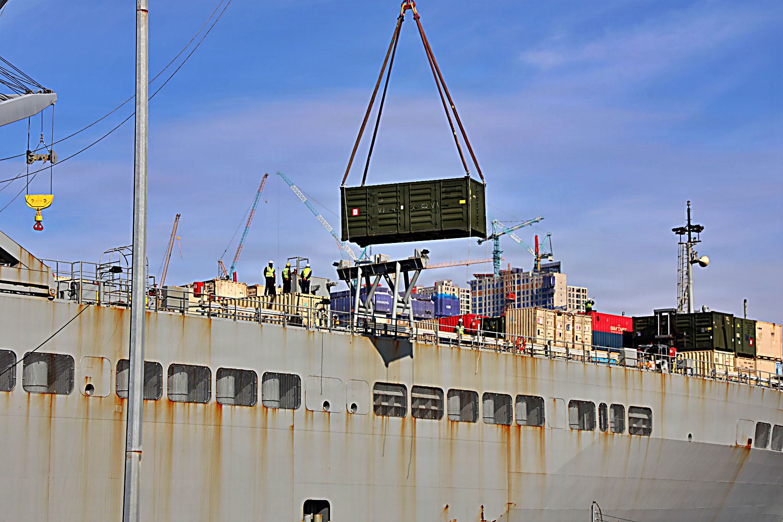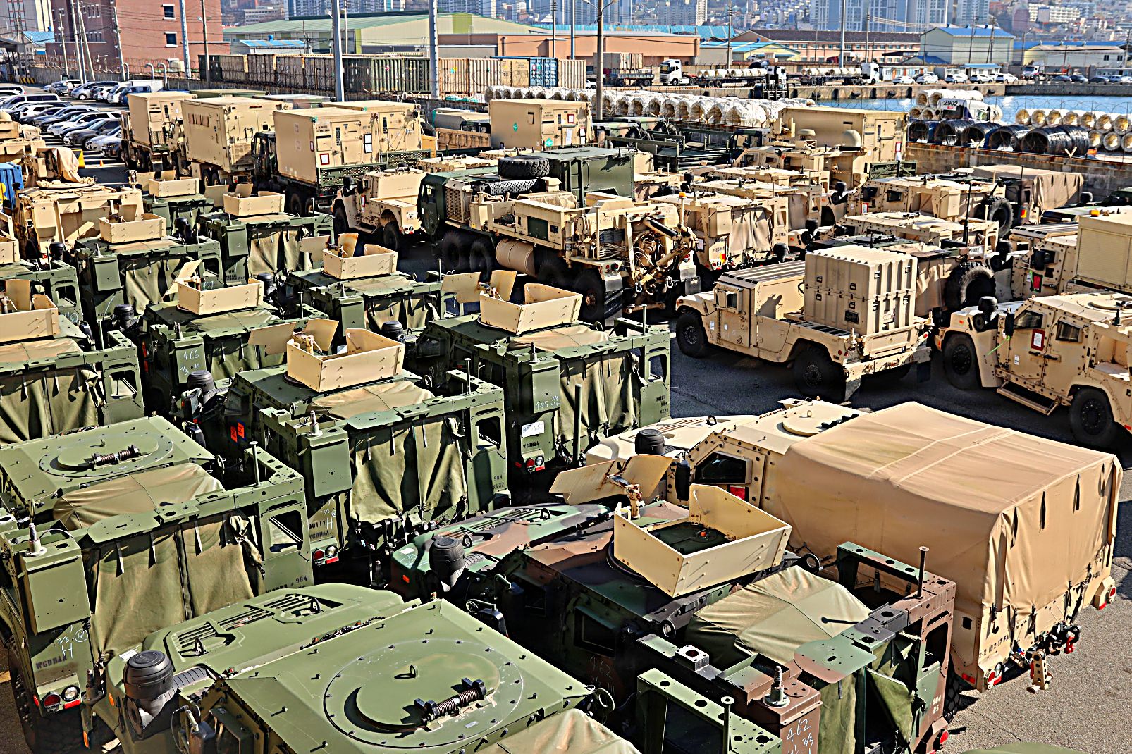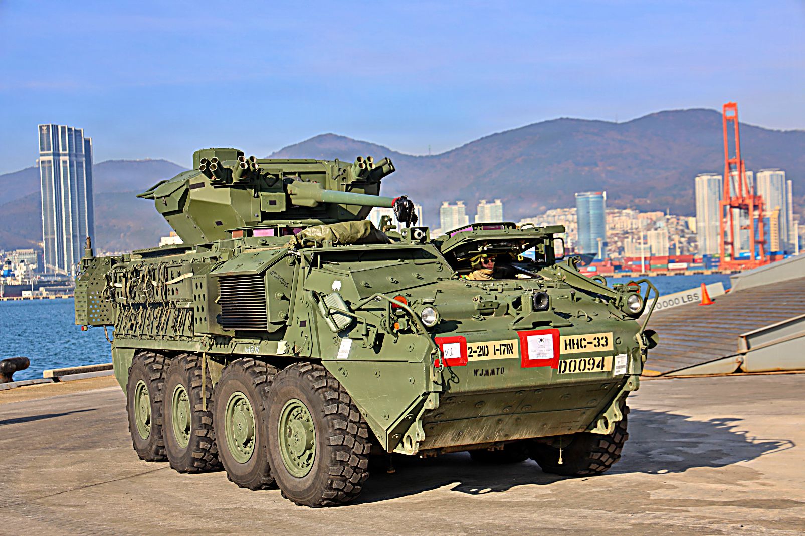 한국에 두번째로 순환배치되는 제7보병사단 제2스트라이커여단전투팀(2nd Stryker Brigade Combat Team)의 Stryker 장갑차와 각종 지원 장비들을 적재한 미 해군 USNS Watkins (T-AKR-315)함이 2월 4일 부산항 8번 부두에 입항하여 장비들을 하역하고 있다. 한국에 순환 배치되는 스트라이커여단전투팀은 9개월간 한반도에 주둔하며 한국 및 파트너 국가들과 함께 연합전투준비태세 및 상호운용성을 지원하며 임무를 완수한 부대는 본국으로 복귀하게 된다.