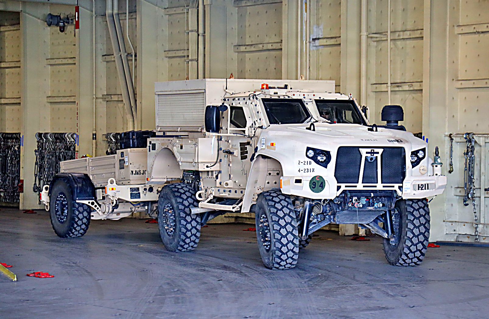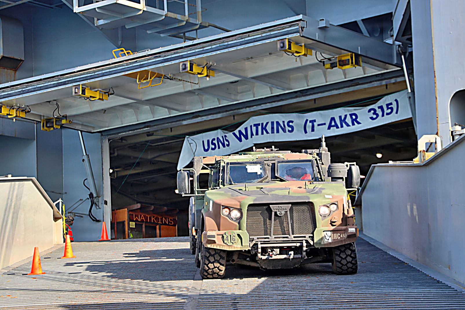 2 SBCT의 장비들을 수송한 USNS Watkins (T-AKR-315)함은 미해군 군수송사령부(MSCOM) 소속 19척의 대형 중속 롤온/롤오프함정 중 하나이자, 사전배치 프로그램에 참여하는 33척의 함정 중 하나로 Watson급 차량 수송함이다.