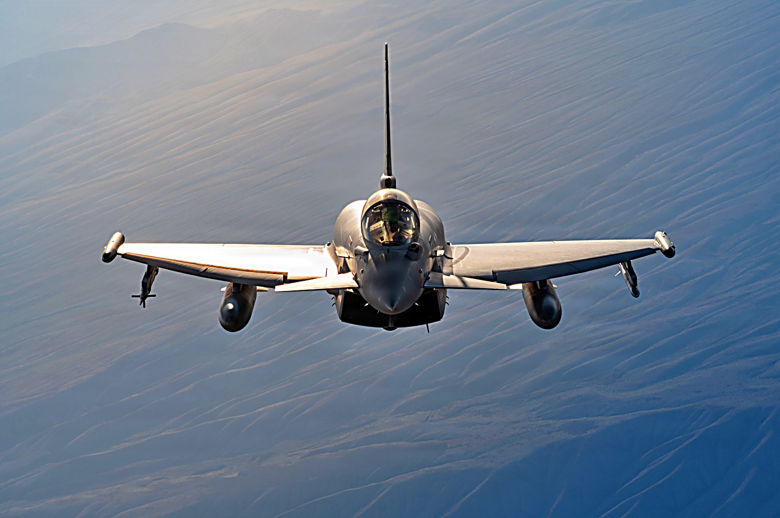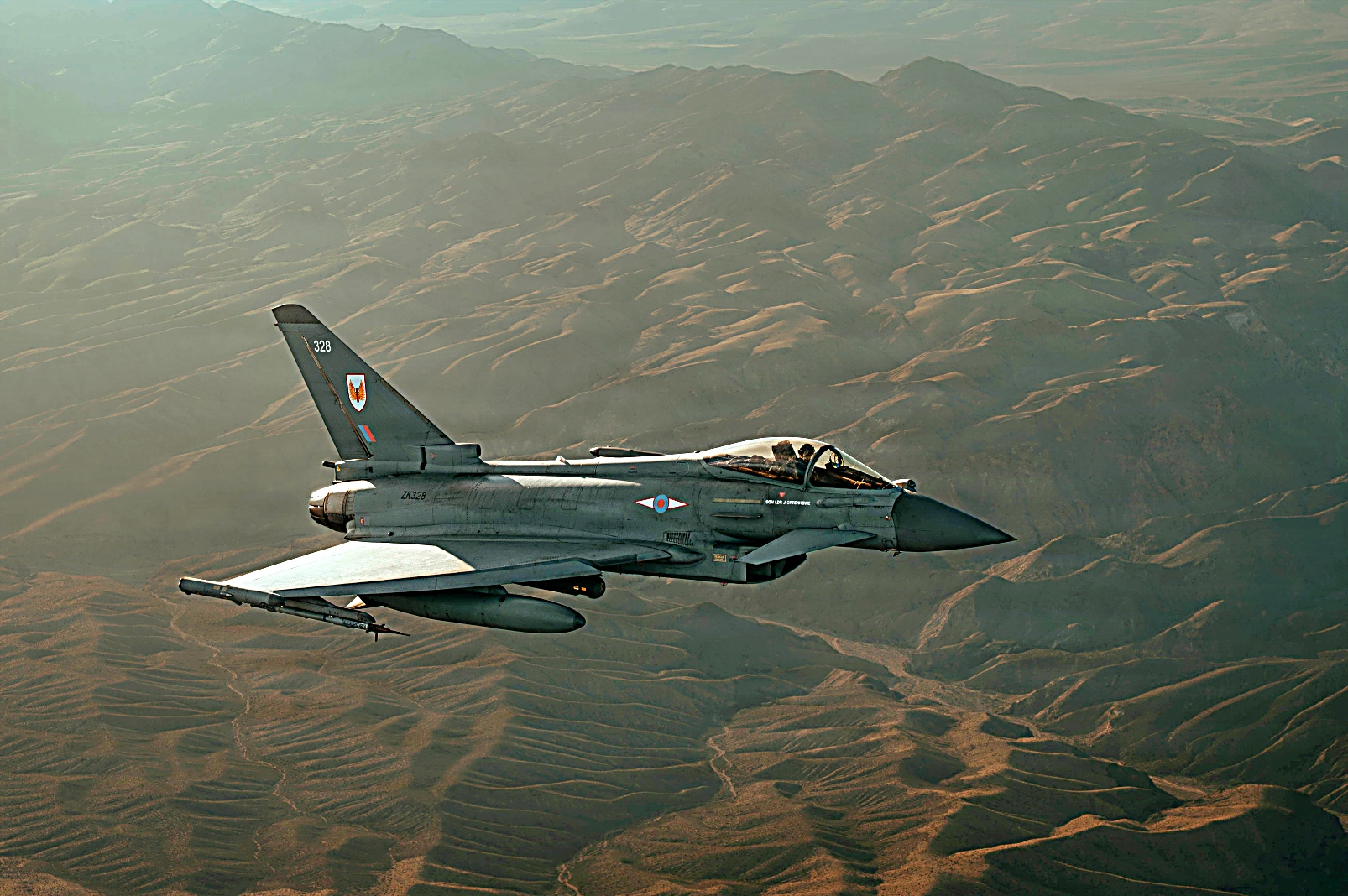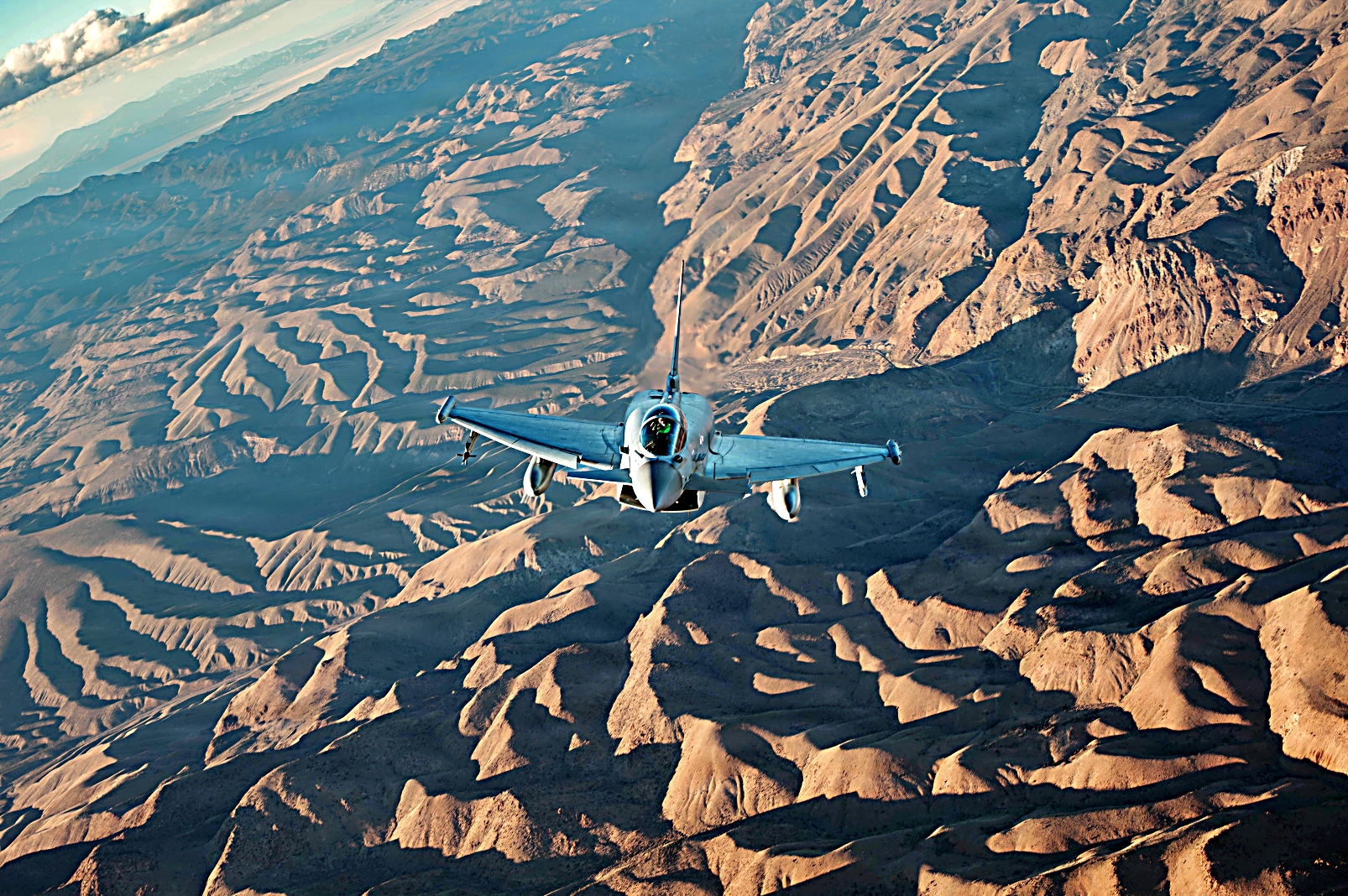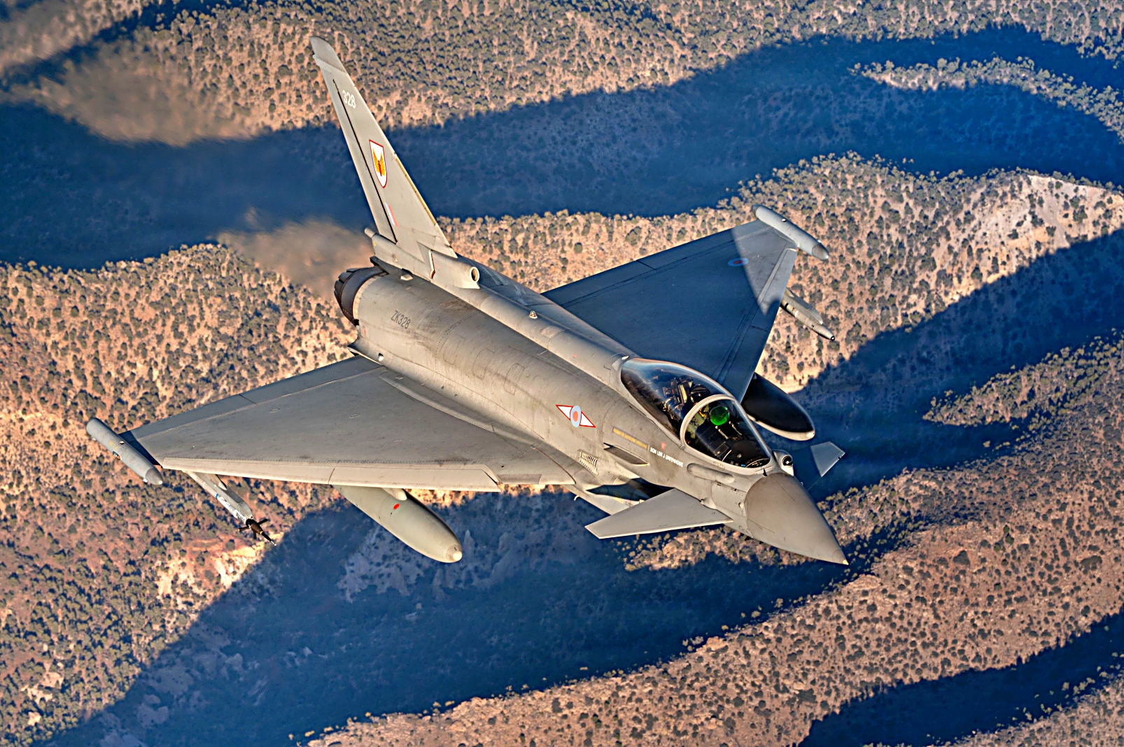 Red Flag-Nellis 26-1훈련에 참가하고 있는 왕립 공군 Eurofighter Typhoon 전투기와 플로리다주 Homestead 예비군기지에 배치되어 있는 예비공군 제482전투비행단 예하 제93전투비행대 소속 F-16C Fighting Falcon전투기가 2026년 2월 6일 네바다주 상공에서 임무비행을 펼치고 있다.