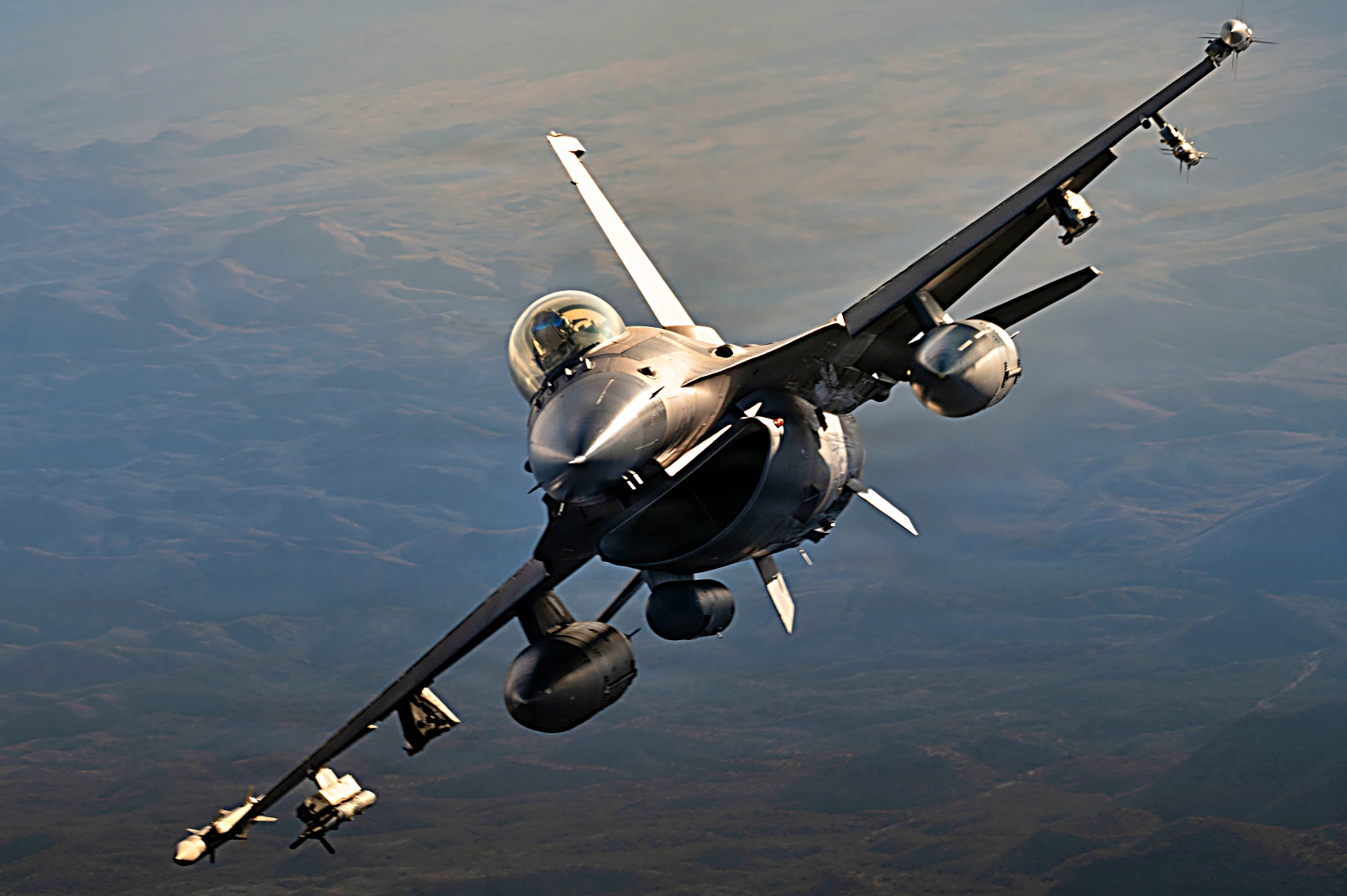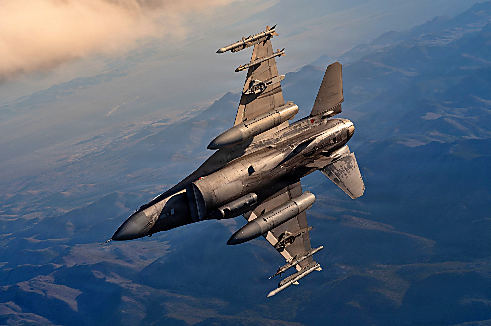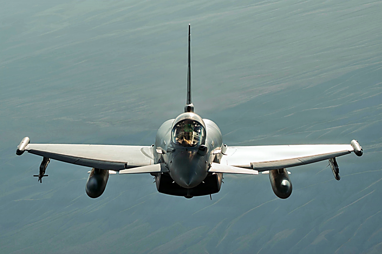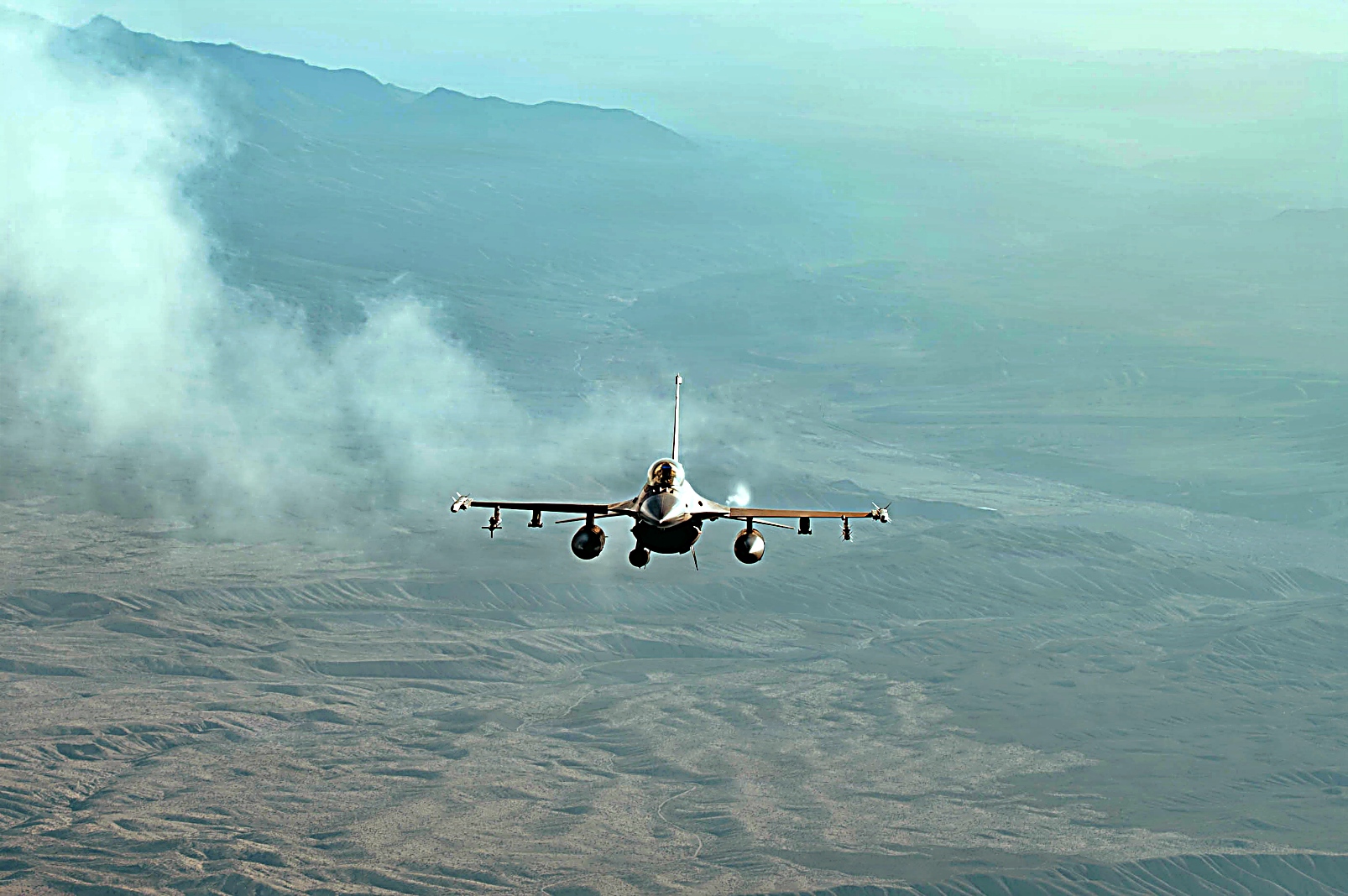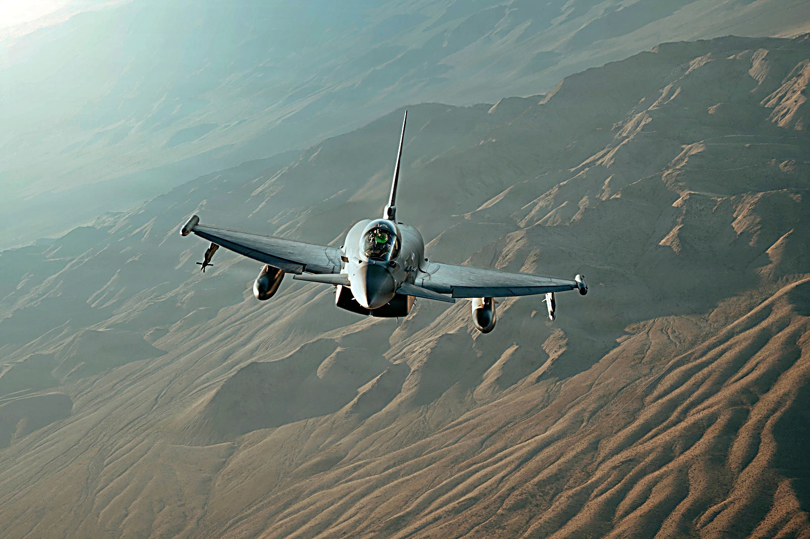 Red Flag-Nellis 26-1훈련에 참가하고 있는 왕립 공군 Eurofighter Typhoon 전투기와 플로리다주 Homestead 예비군기지에 배치되어 있는 예비공군 제482전투비행단 예하 제93전투비행대 소속 F-16C Fighting Falcon전투기가 2026년 2월 6일 네바다주 상공에서 임무비행을 펼치고 있다.