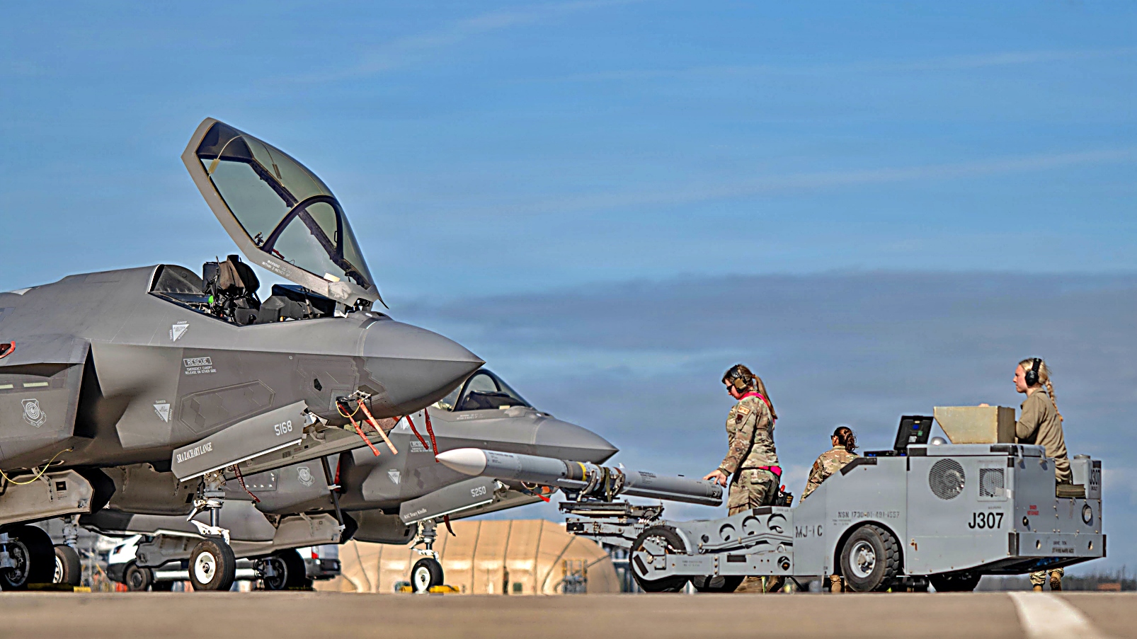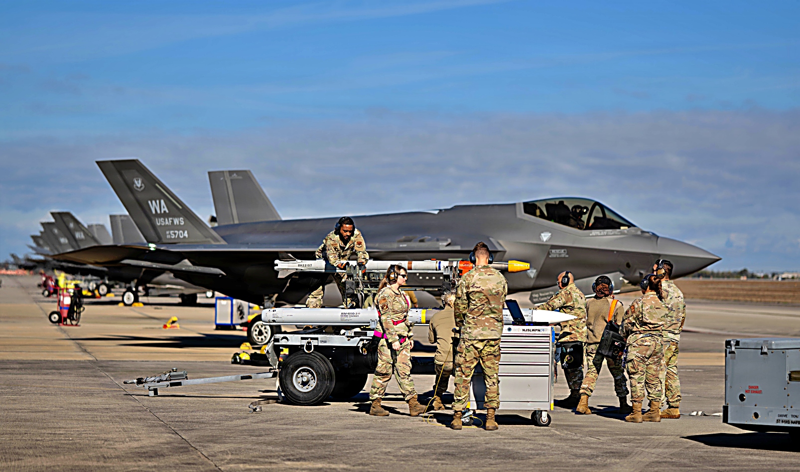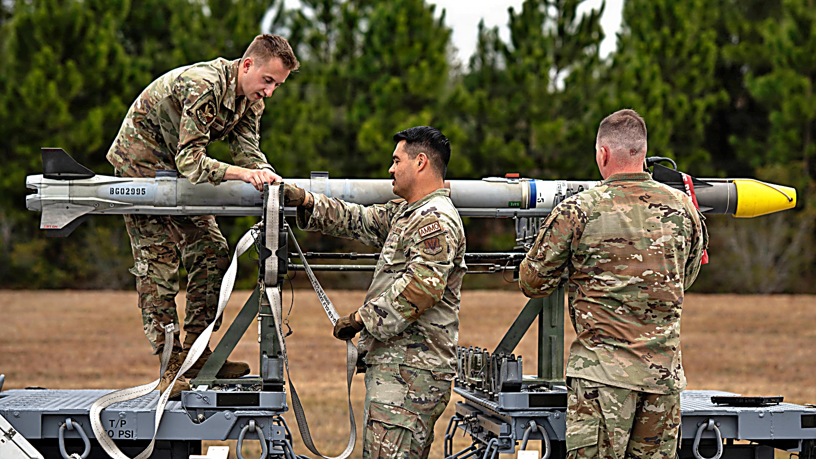 2026년 2월 10일, 플로리다주 Tyndall 공군기지에서 미 공군 제57항공기정비대대 소속 공군 장병들이 미사일 장전을 준비하고 있다. Weapons System Evaluation Program East와 Combat Archer 26.02 훈련 동안, 무기 운용 요원들은 통제된 환경에서 실탄 장전 작업을 수행하여 전투 준비 태세 요건을 충족하는지 확인한다.