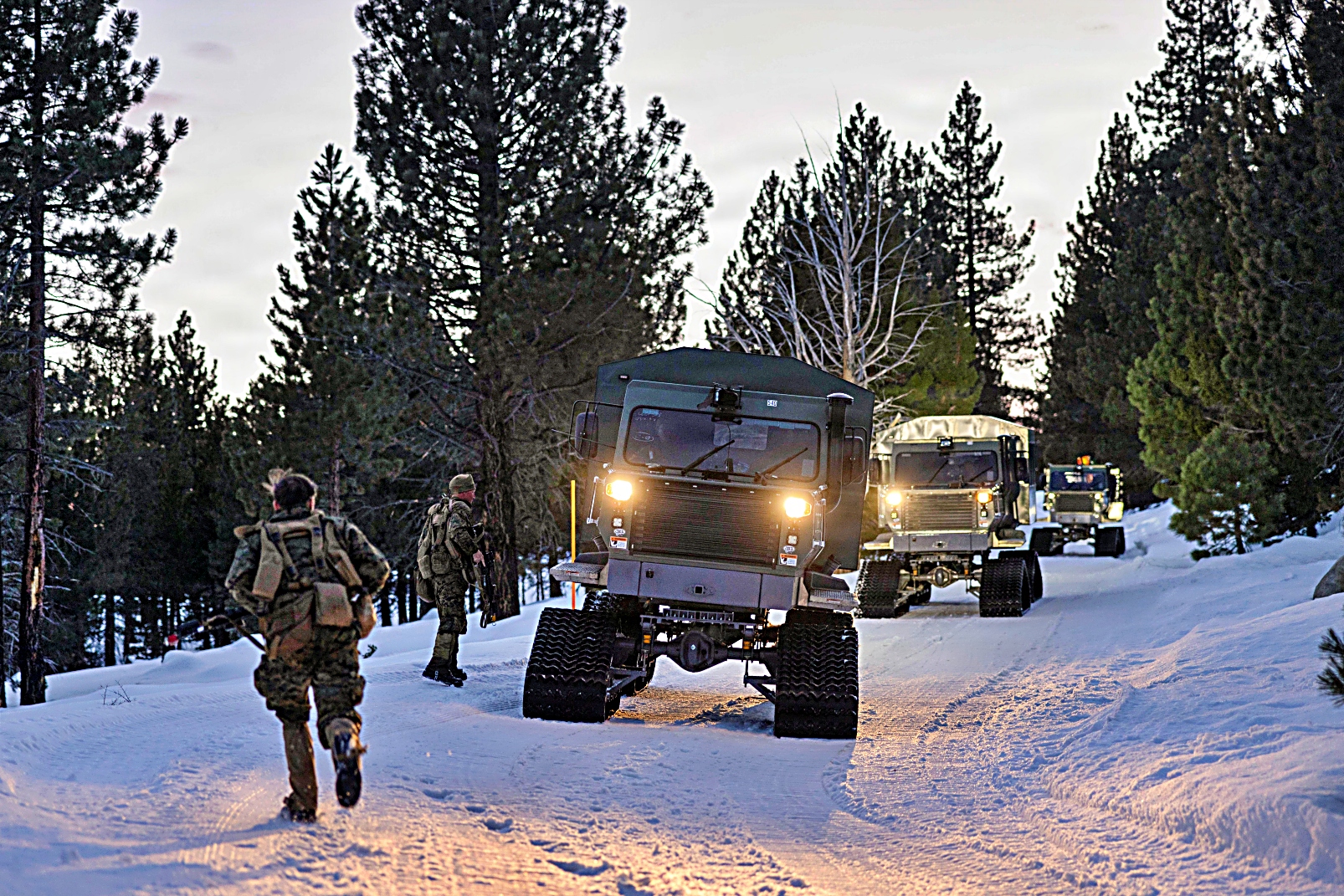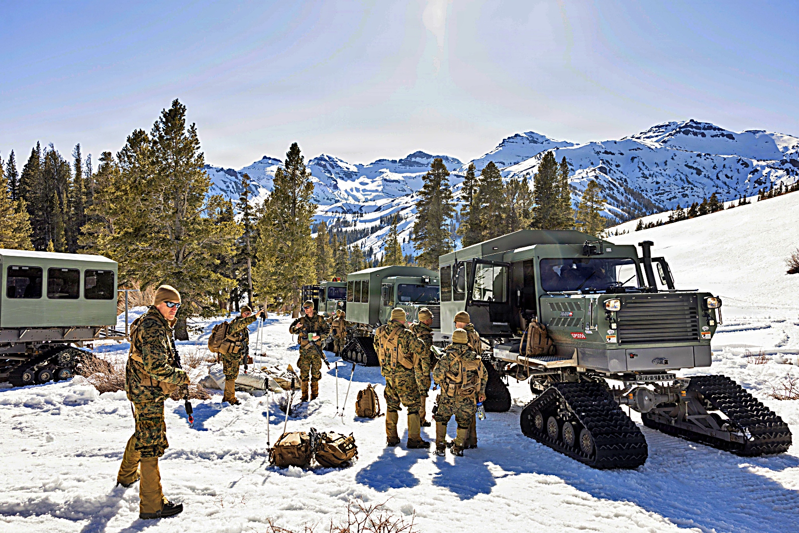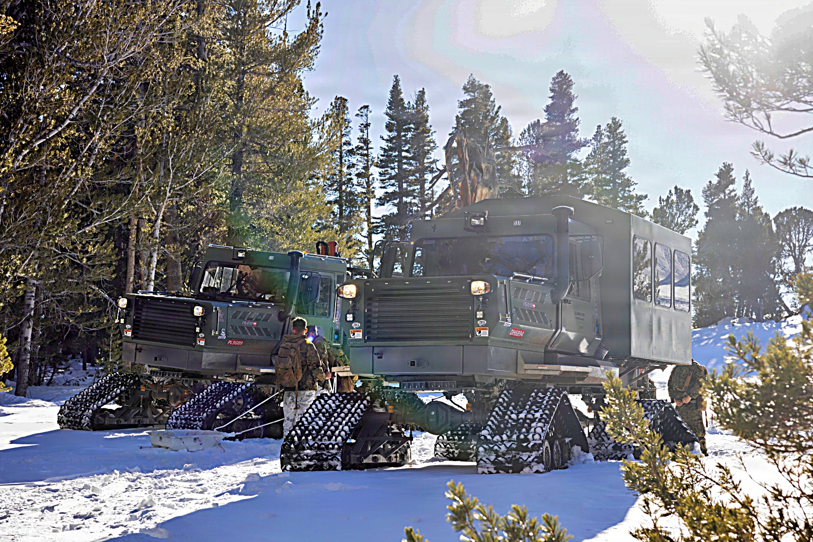 2026년 2월 4일부터 9일 사이, 캘리포니아주 Bridgeport에 위치한 해병대 산악전 훈련센터(MCMWTC)에서 열린 Mountain Training Exercise 1-26의 최종 훈련 중, 제2해병병참군 제27 전투병참연대, 제24 전투병참대대(CLB-24) 소속 미 해병대원과 해군 장병들이 호송 및 보급 임무를 위해 배치된 Terra Tucker 1600 Sno-Cats을 이용하고 있다.