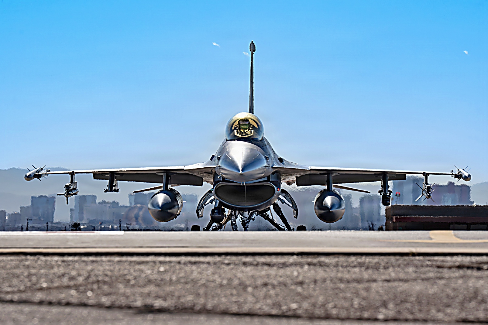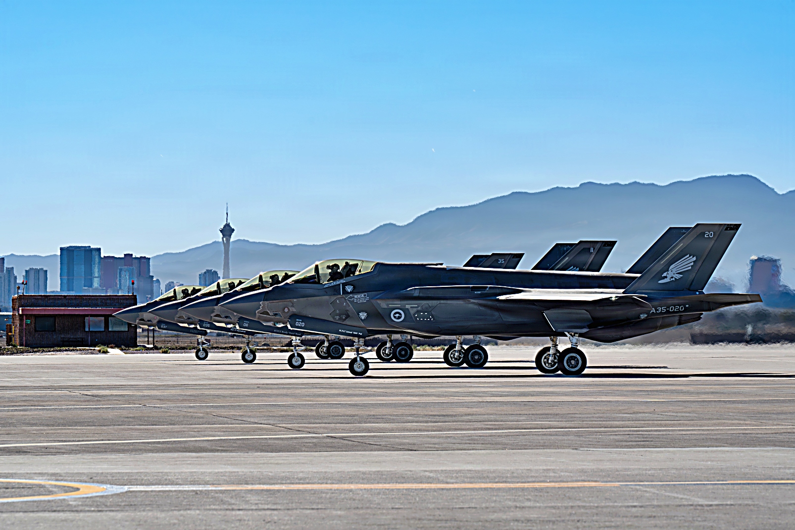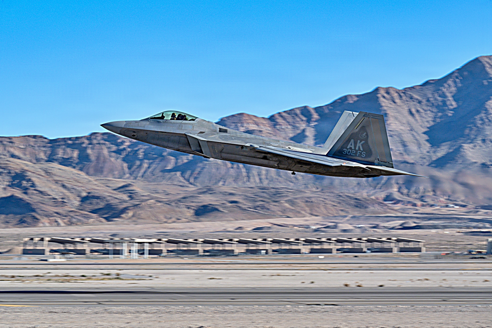 2026년 2월 4일, 네바다주 넬리스 공군기지에서 열린 Red Flag-Nellis 26-1 훈련 중, 플로리다주 Homestead 공군 예비기지 제482비행단 소속 미 공군 F-16 Fighting Falcon 전투기, 플로리다주 Tyndall 공군기지 제325전투비행단 소속 미 공군 F-35A Lightning II 공격기, 알래스카주 엘멘도르프-리처드슨 합동기지 제3전투비행단 소속 미 공군 F-22 Raptor 전투기, 미 공군 제64가상적기비행대대 소속 F-16 Fighting Falcon 전투기 및 제65가상적기비행대대 소속 F-35A Lightning II 공격기가 임무 수행을 위해이륙하고 있다.
