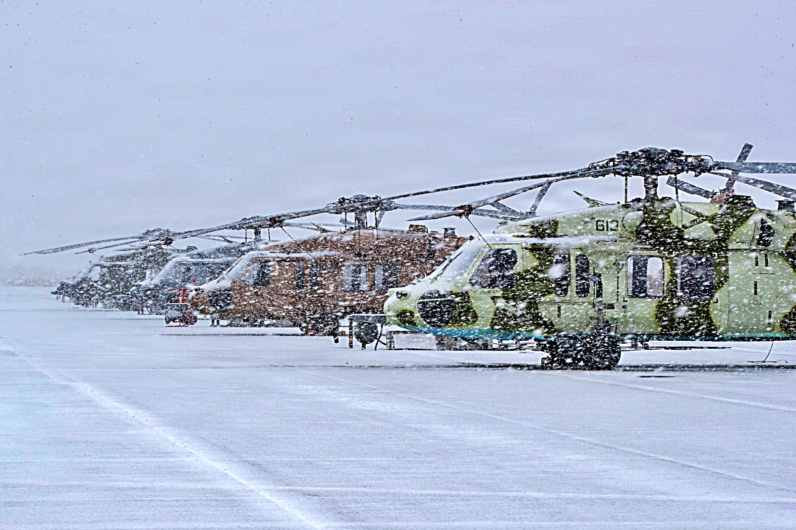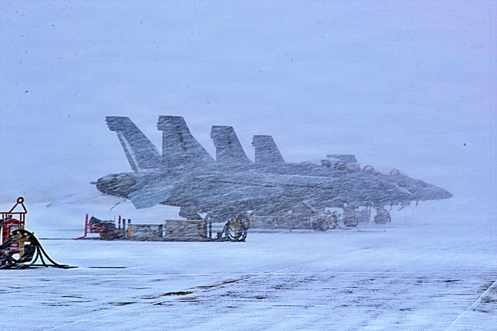2026년 2월 19일, 네바다주 북부에 눈이 내리는 가운데 Fallon 해군 항공기지(NASSF) 활주로에 주기되어 있는 항공기들의 모습.