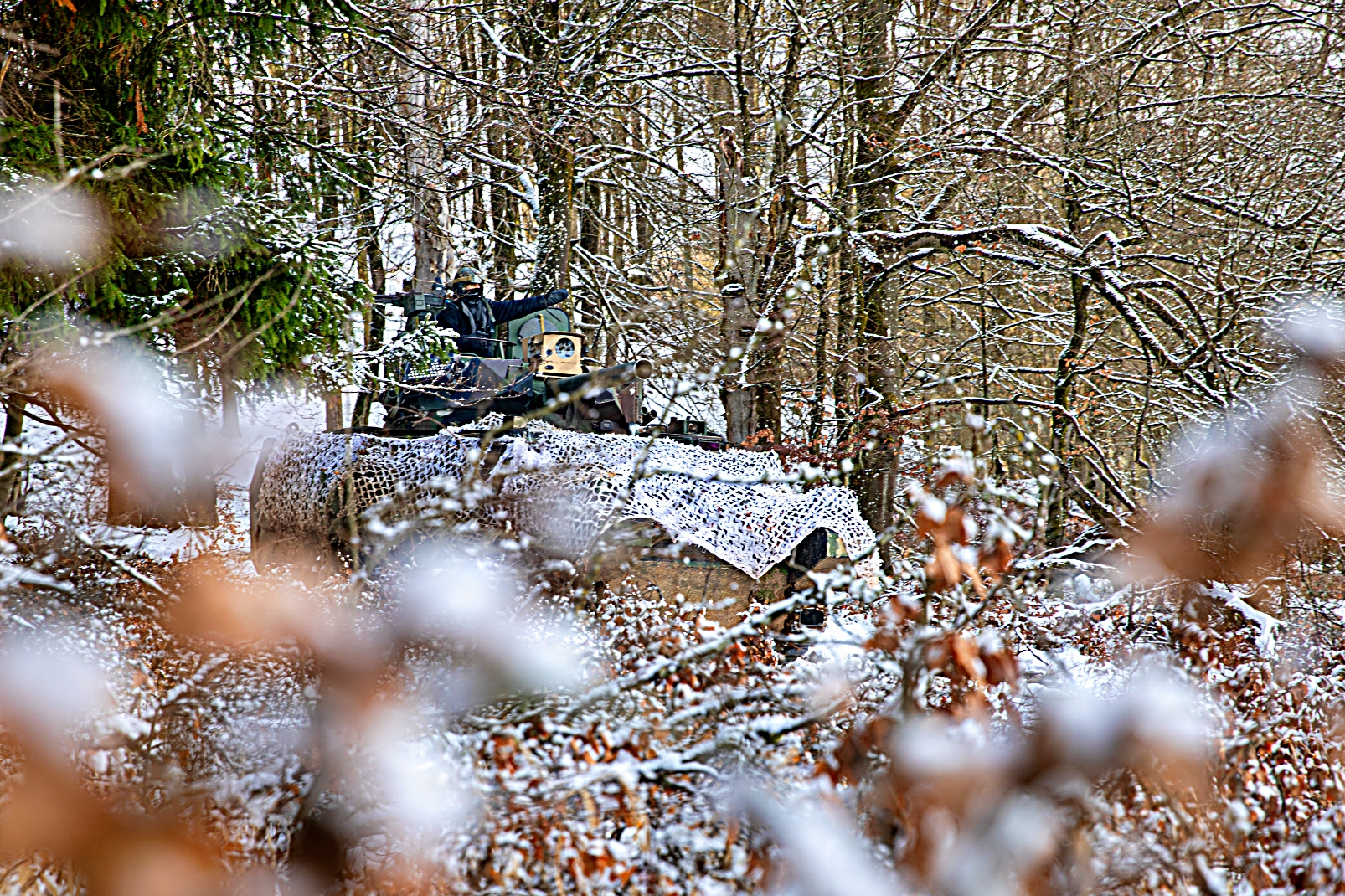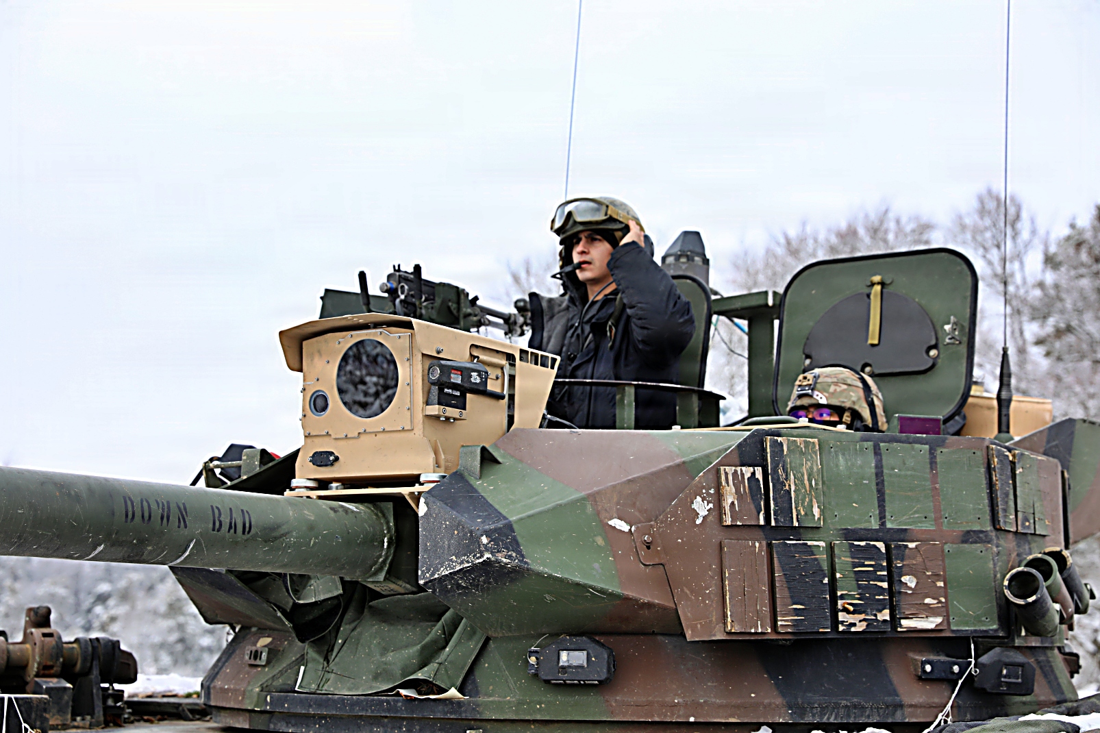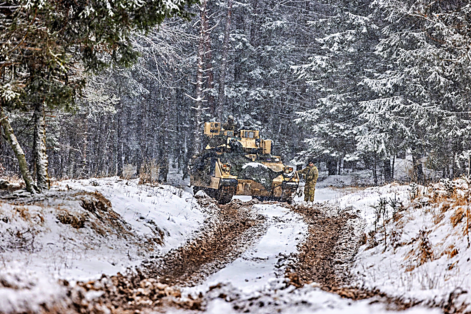 2026년 2월 20일 독일 Hohenfels 합동다국적준비센터 훈련장에서 실시된 합동훈련 26-05(Combined Resolve 26-05) 중 미 육군 제1보병사단 제1기갑여단전투팀 소속 M1A2 Abrams 전차와 M2A3 보병전투장갑차 등이 진지를 구축하고 경계임무를 수행하는 가운데 제4보병연대 제1대대소속 M113A3 가상 전차가 교전을 펼치고 있다.