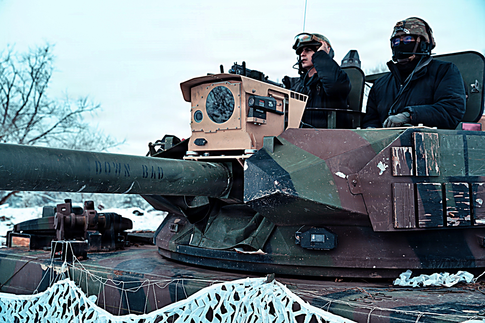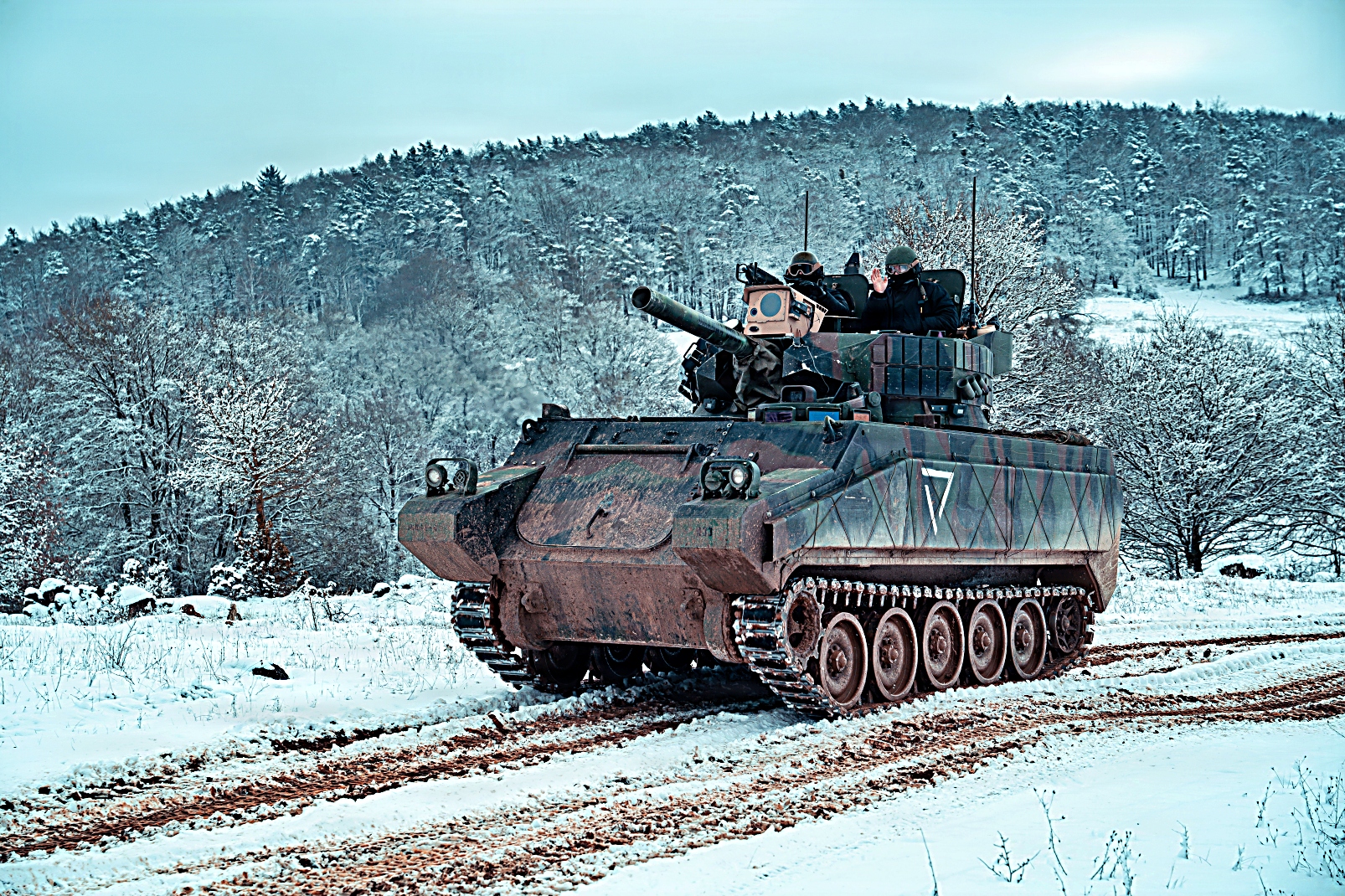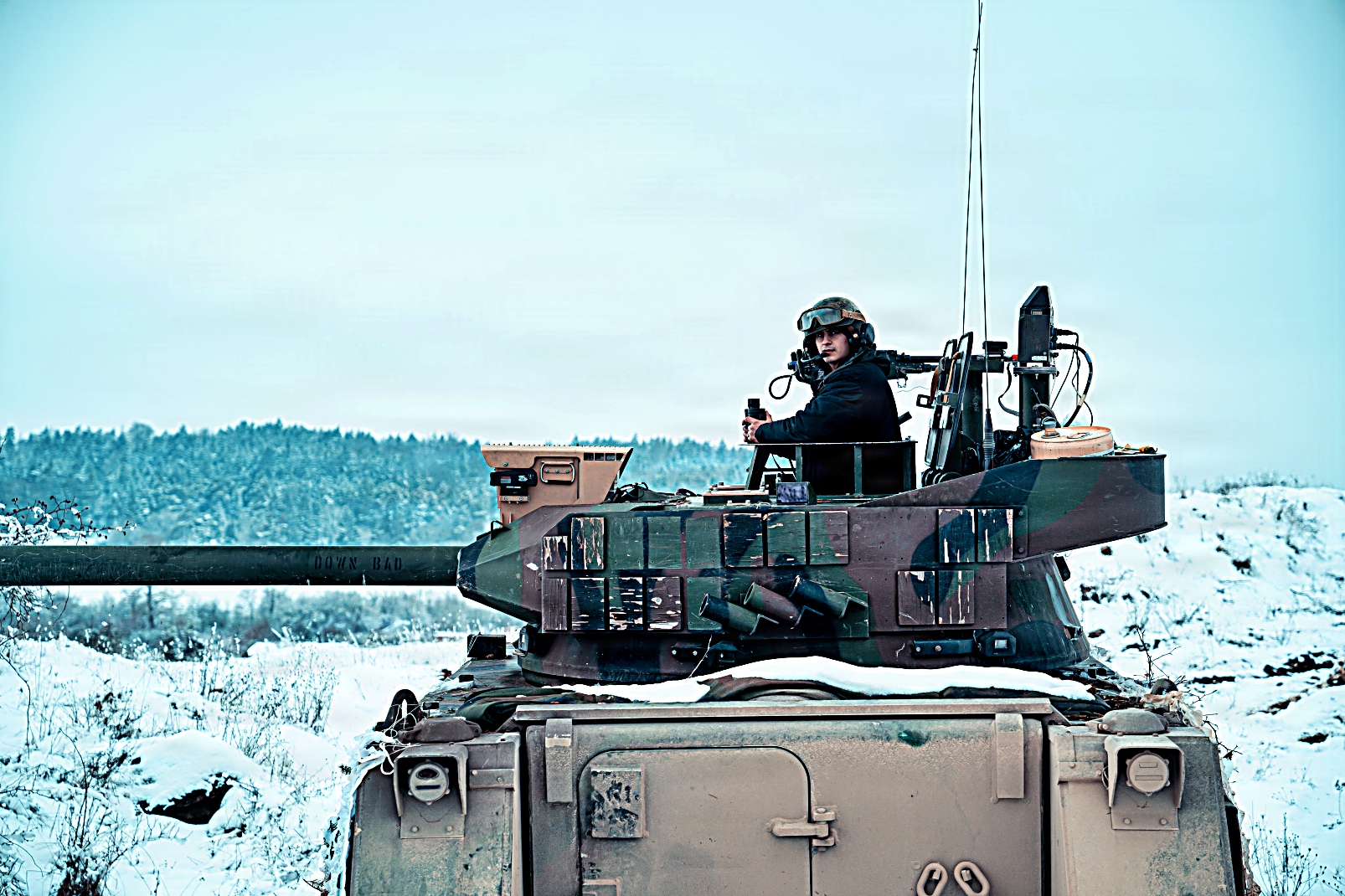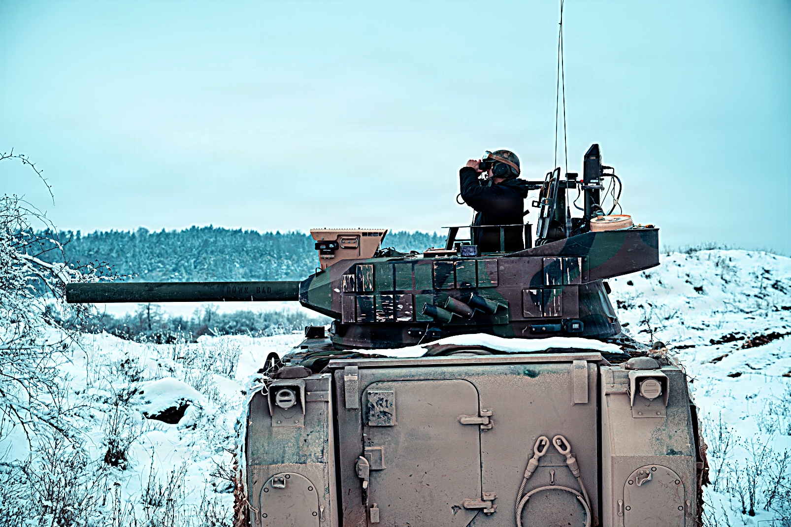 2026년 2월 20일, 독일 Hohenfels 합동다국적준비센터(JMRC) 훈련장에서 실시된 합동 리졸브 26-05 훈련 중, 제4보병연대 제1대대 소속 M113A3 가상 전차가 작전 구역을 정찰하는 가운데 제1보병사단 제1기갑여단 전투팀 소속 M1A2 전차와 M2A3 장갑차가 전술적 위치를 유지하고 있다.