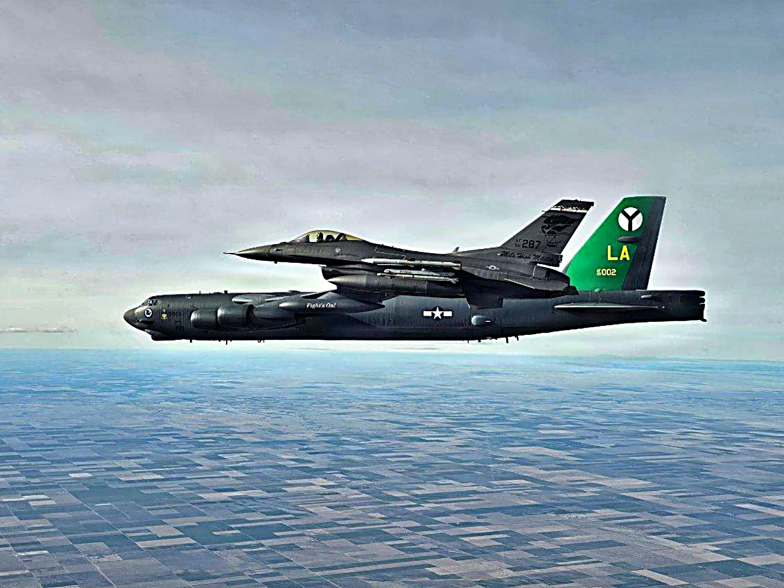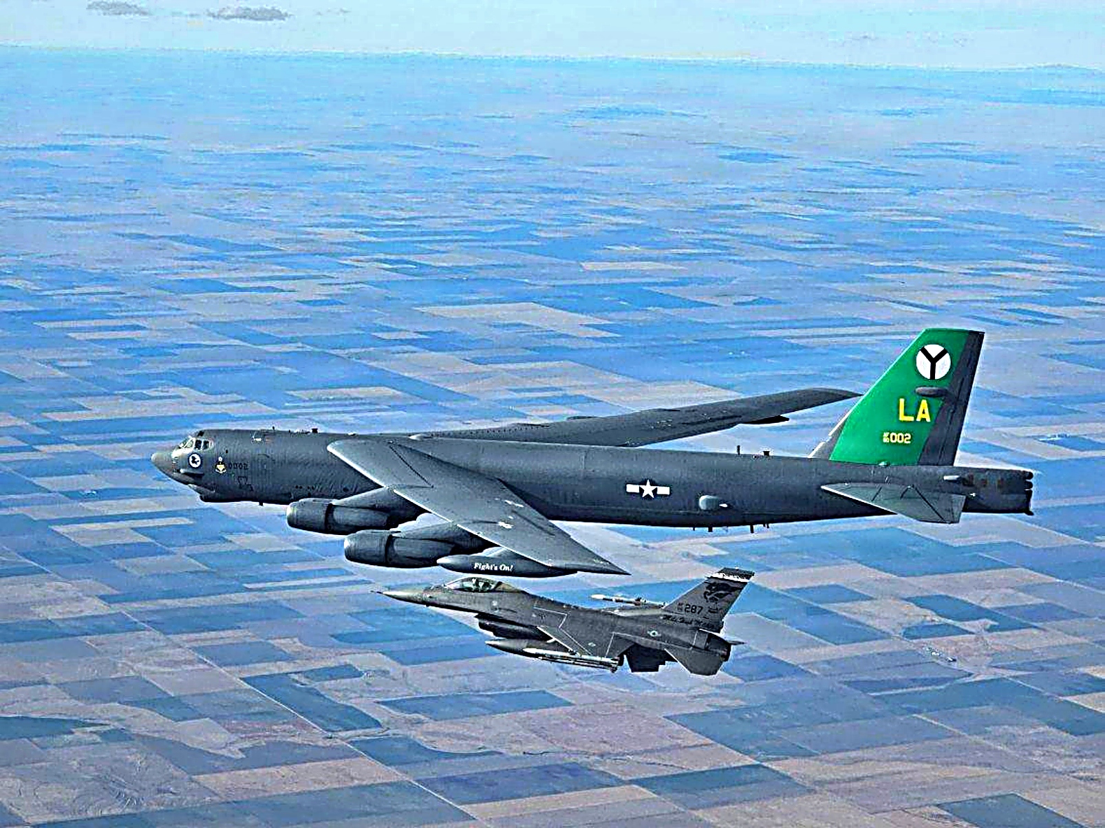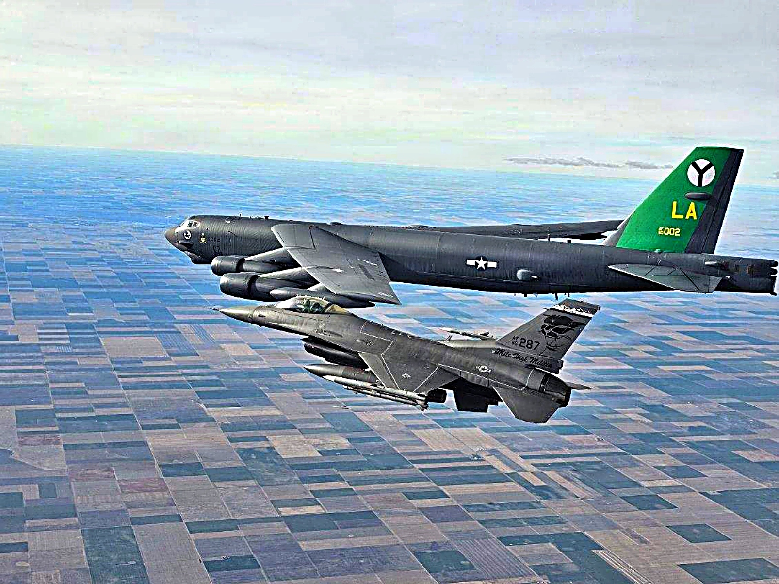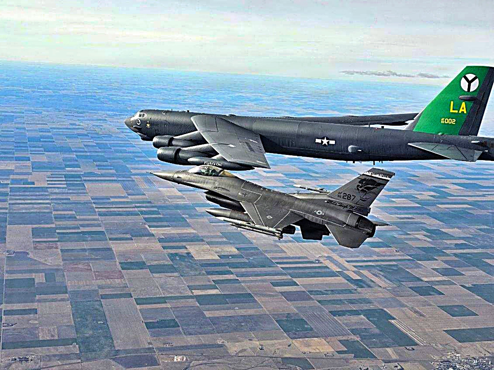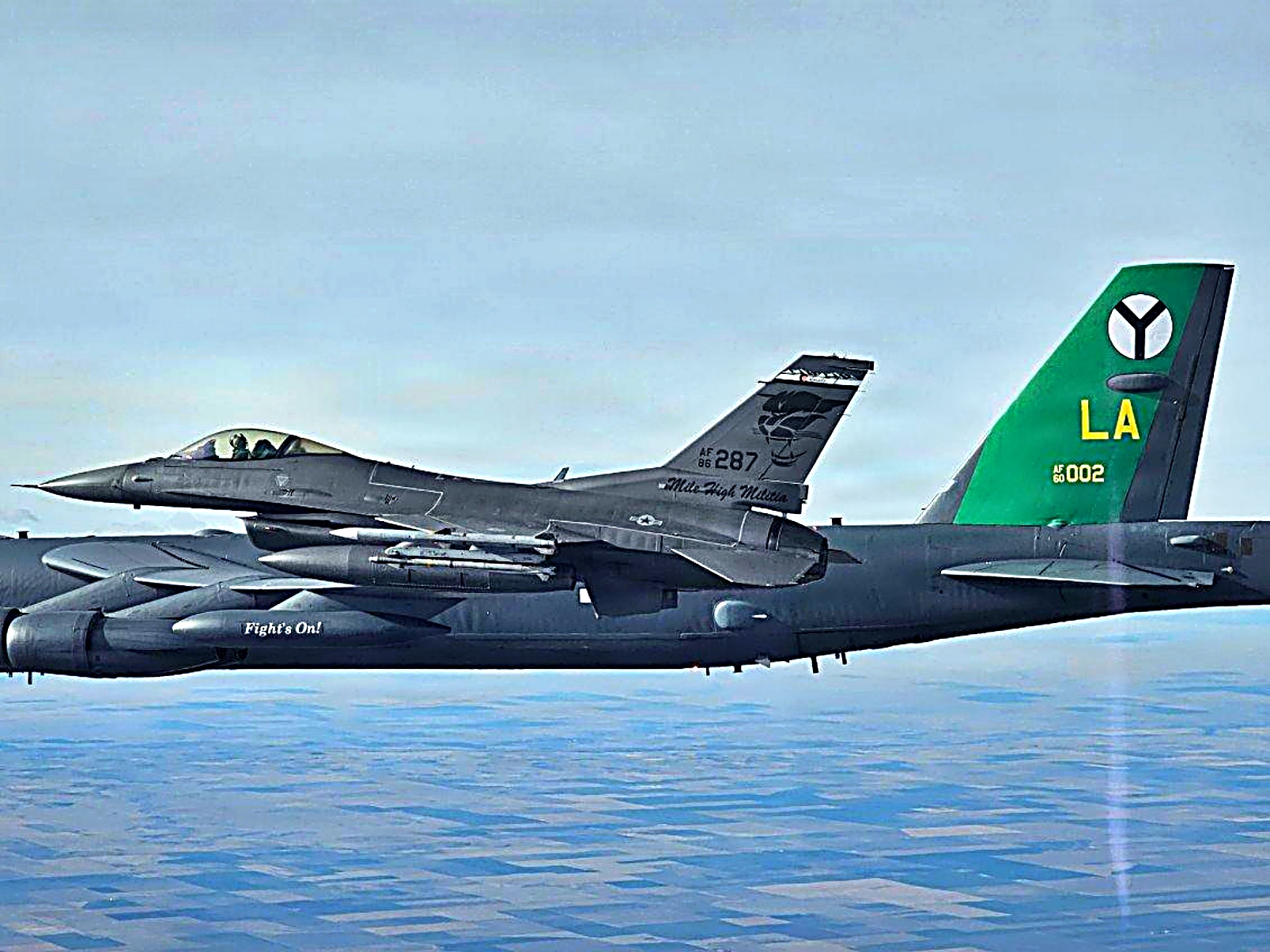 2026년 2월 24일, Global Guardian 작전의 일환으로 콜로라도 주 방위군 제120전투비행단 소속 북미항공우주방위사령부(NORAD) F-16C 전투기가 콜로라도 북부 영공에서 미 전략사령부 소속 B-52 폭격기를 요격하고 있다.