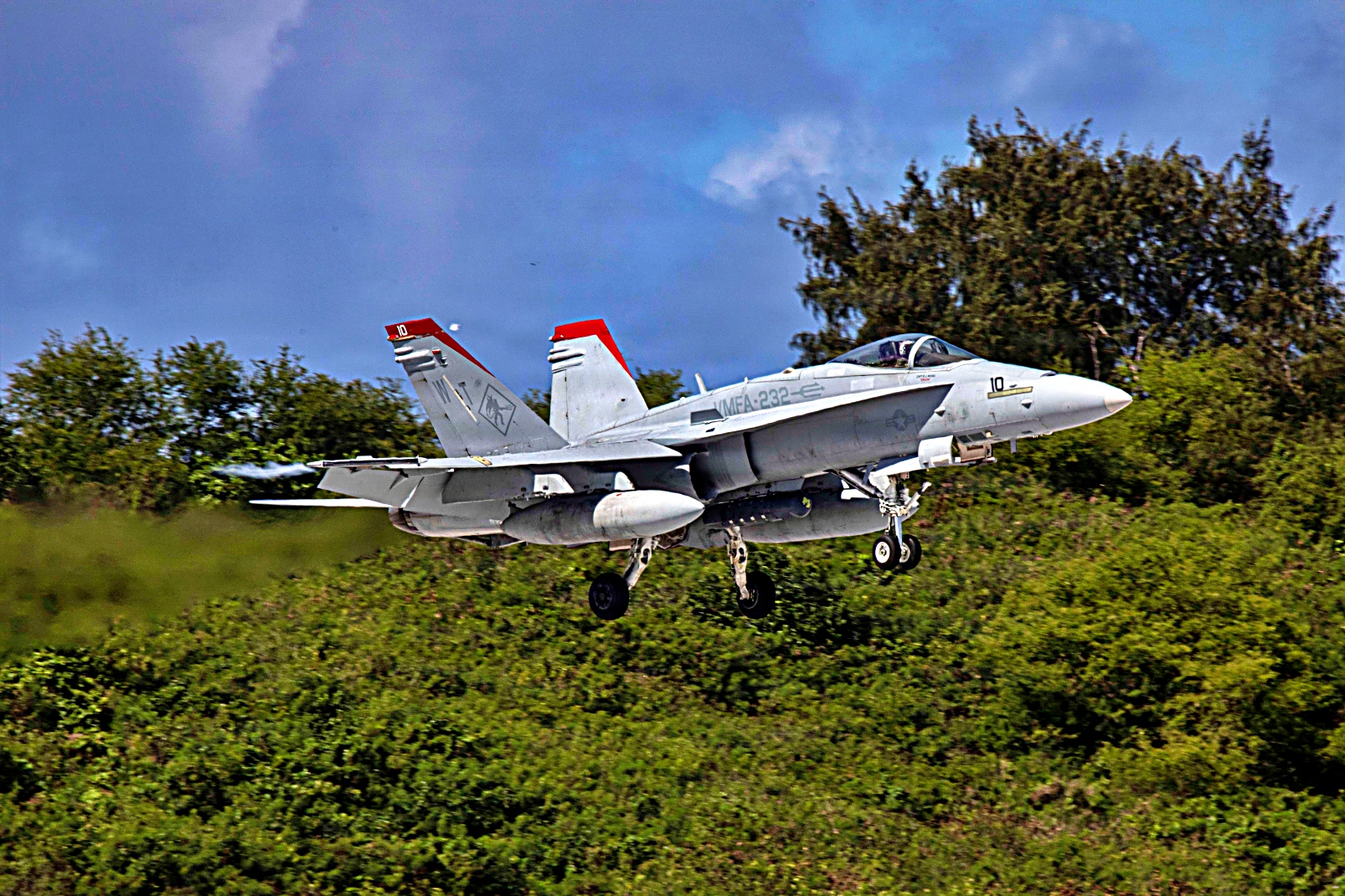 2026년 1월 28일부터 30일까지, 북마리아나 제도 Tinian에서 진행된 Aviation Training Relocation 프로그램의 일환으로, 제1해병항공단 제12해병항공전단 VMFA-232 해병전투공격비행대대 소속 F/A-18C Hornet 전투기가 재급유, 재무장후 이륙을 준비하고 있다.