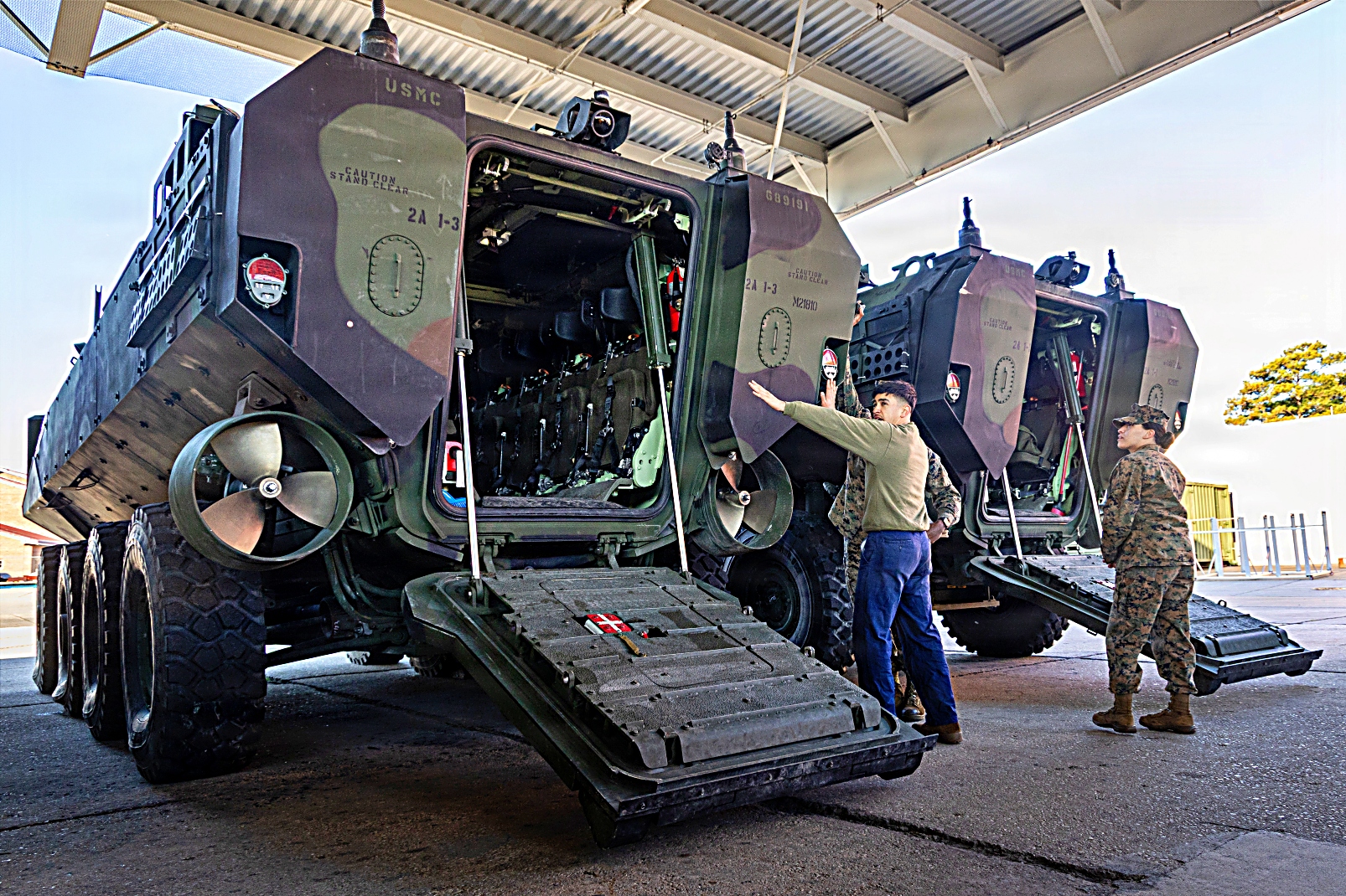 2026년 2월 27일, 제2해병사단 제2강습상륙대대 소속 미 해병대원들이 노스캐롤라이나주 Camp Lejeune 해병기지에서 미 해병대와 해군 간의 기동성과 통합을 강화하는 데 중점을 둔 제26.1형 상륙훈련(Type Commander’s Amphibious Training 26.1)의 일환으로 상륙전투차 Amphibious Combat Vehicle의 점검과 기동을 실시하고 있다.