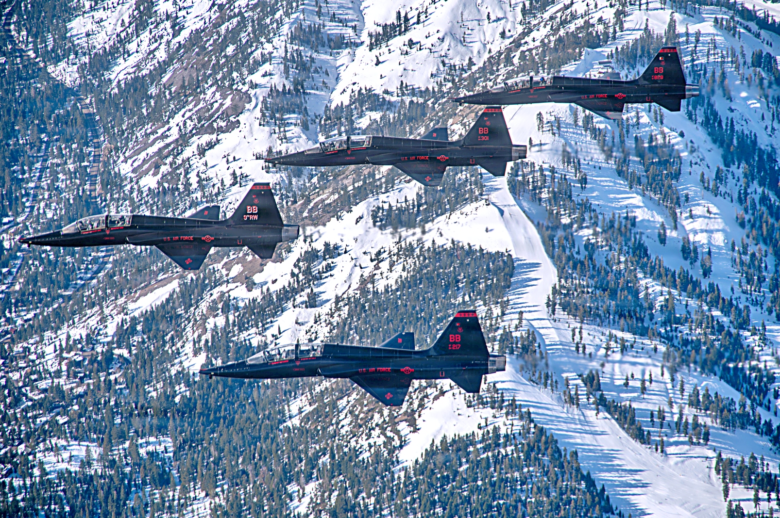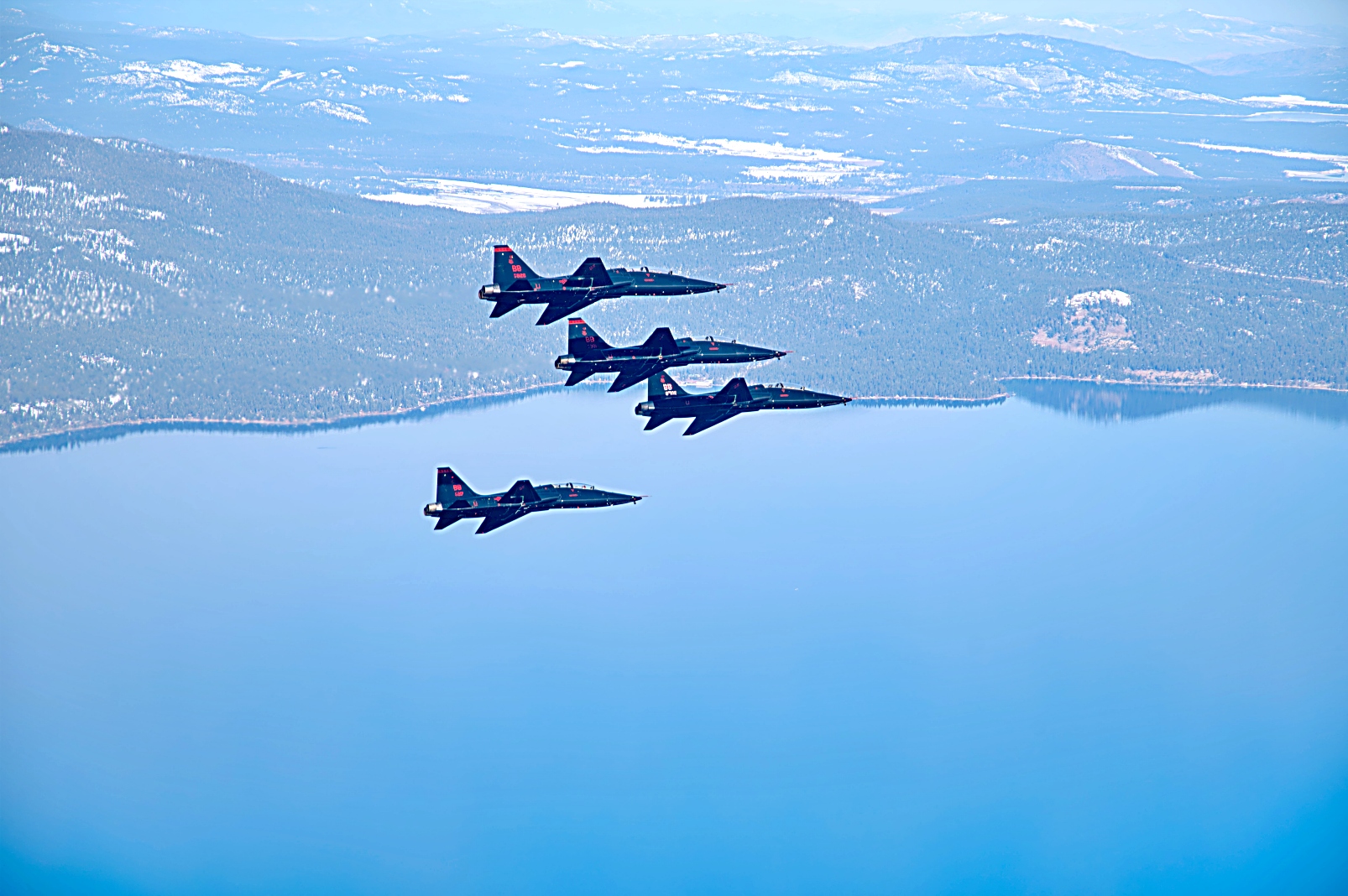 미 공군 제1정찰비행대대 소속 T-38 Talon 훈련기들이 2026년 1월 30일 캘리포니아 상공에서 4대 편대 비행을 하고 있다. T-38은 쌍발 엔진 고고도 초음속 제트 훈련기로, 경제적인 운용, 손쉬운 정비, 고성능 및 탁월한 안전 기록 덕분에 다양한 임무에 활용되고 있다.