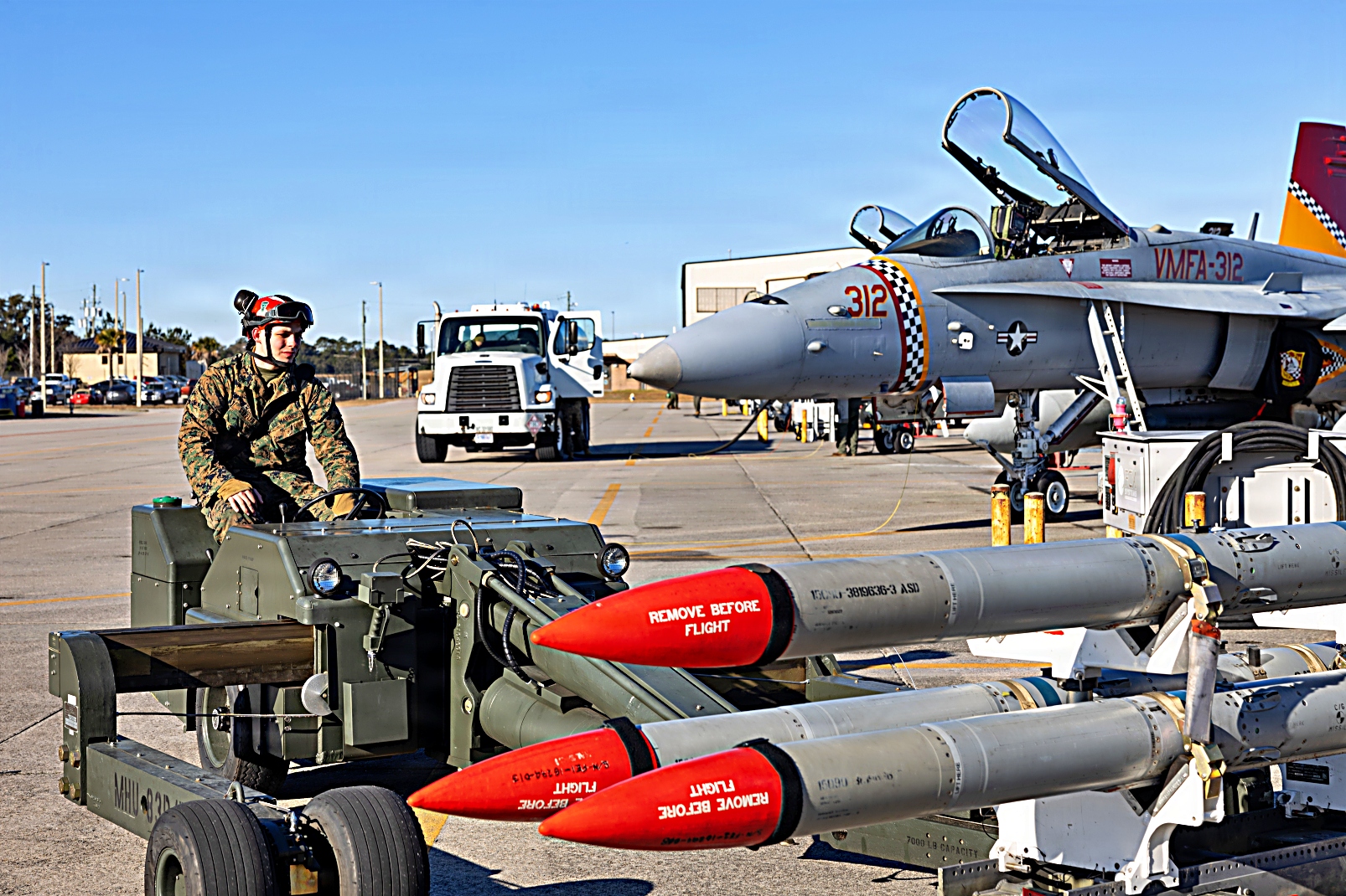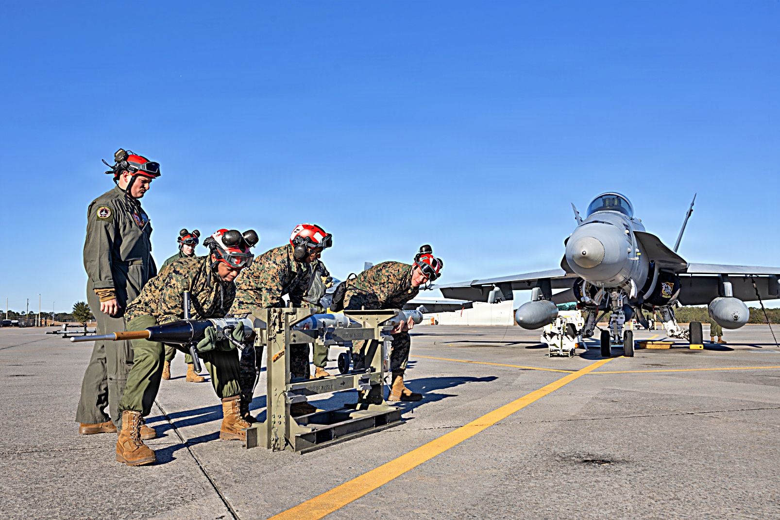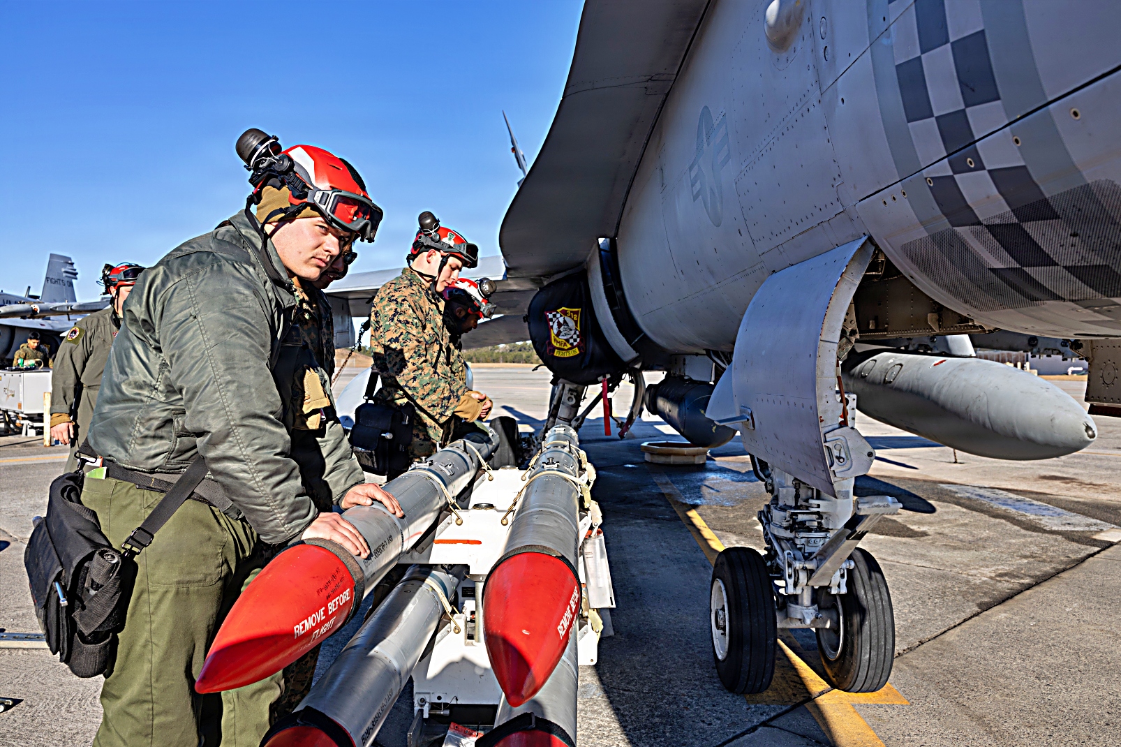 2026년 1월 27일, 사우스캐롤라이나주 Beaufort 해병 항공기지에서 제2해병항공단 제31해병항공군 VMFA-312 해병전투비행대대에 배치되어 있는 F/A-18C Hornet 전폭기에 미 해병대원들이 무기를 적재하고 이륙 전 출격 점검을 수행하고 있다. 항공 무기 시스템 기술병의 주요 임무는 항공 무기 장비 및 무장 취급 장비의 관리, 적재, 분해, 시험, 정비, 조립 및 운송을 포함한다.