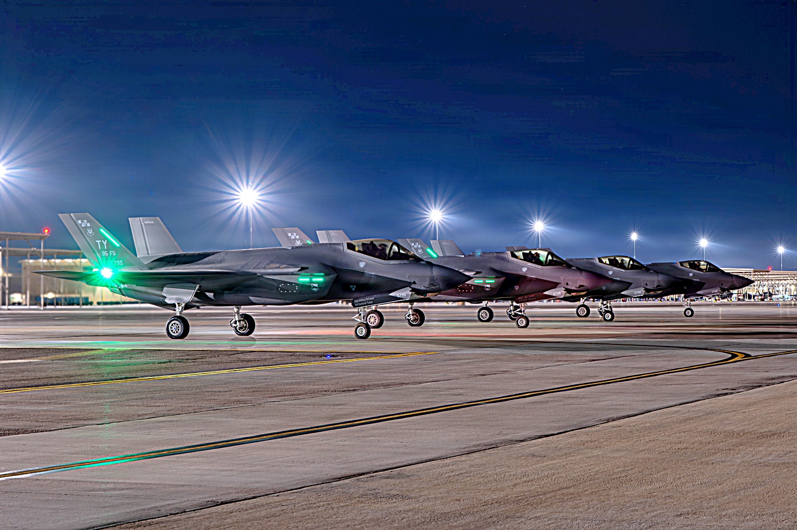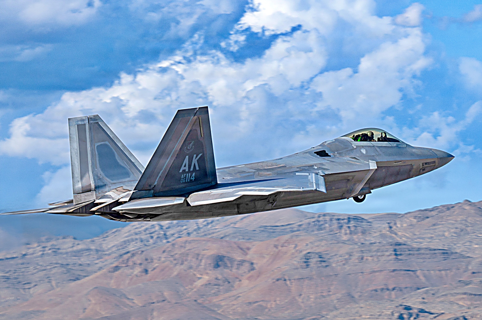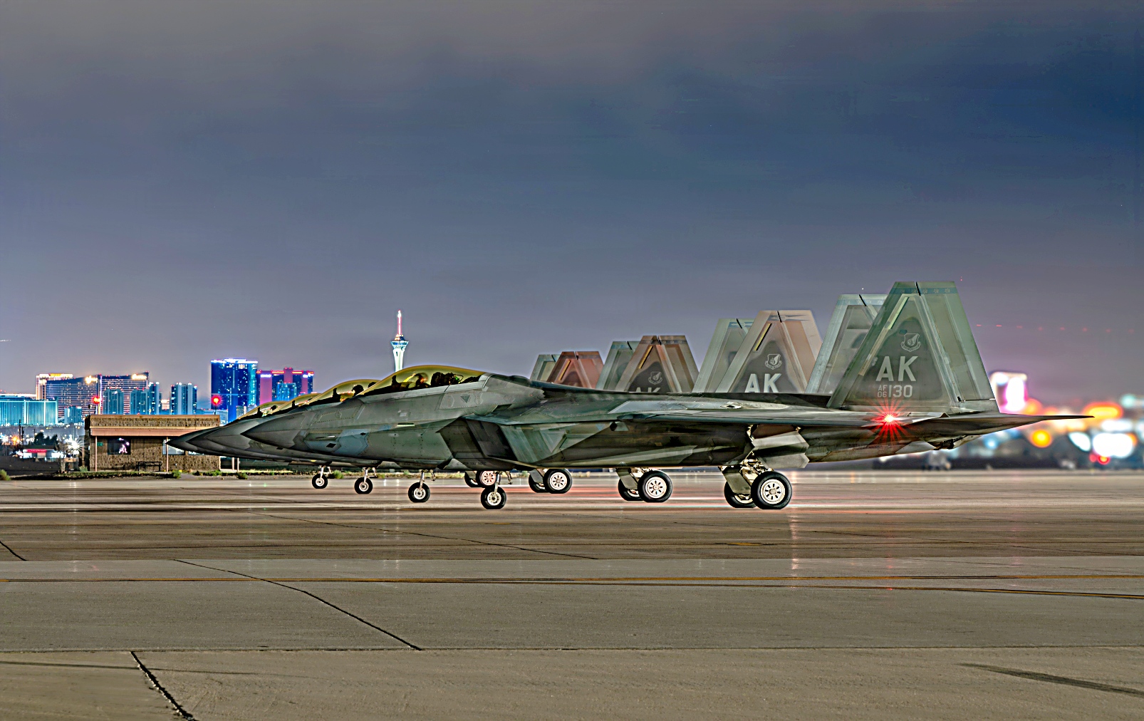 2026년 2월 5월부터 12일 사이, 네바다주 넬리스 공군기지에서 열린 Red Flag-Nellis 26-1 훈련 중, 훈련에 참가한 다양한 전투기들이 임무 수행을 위해 출격하고 있다.