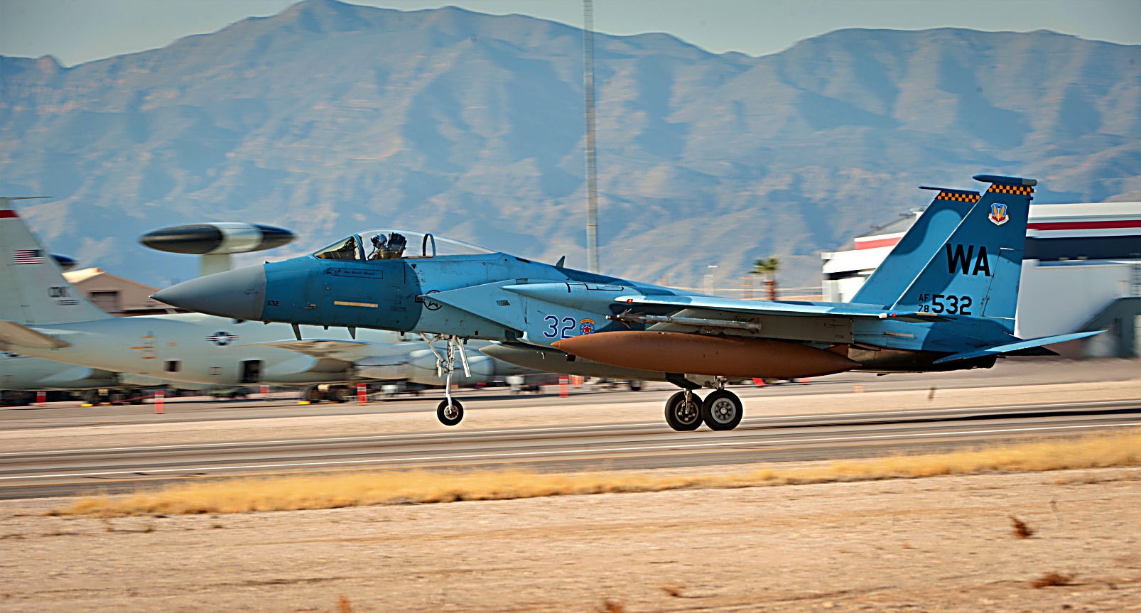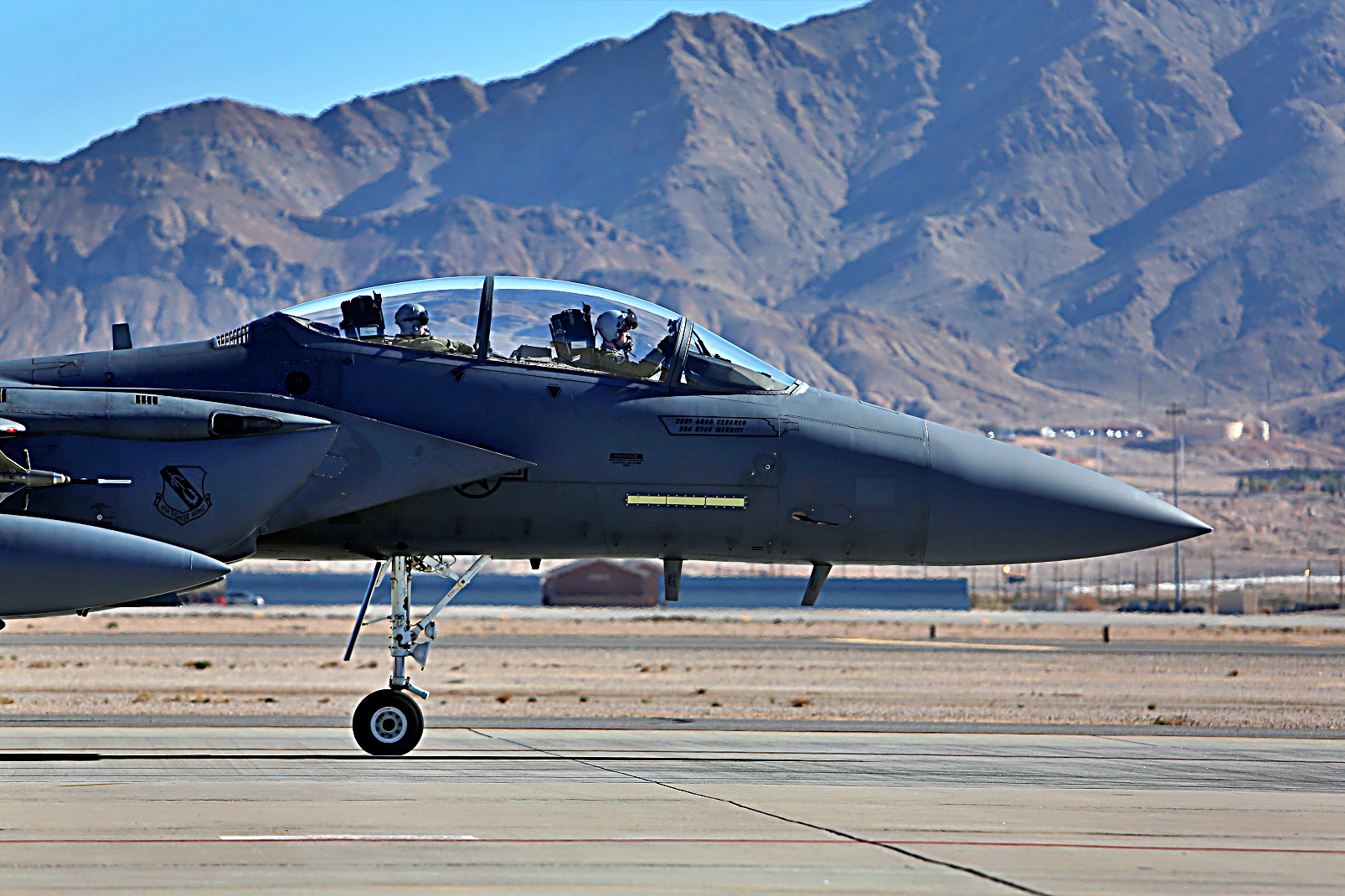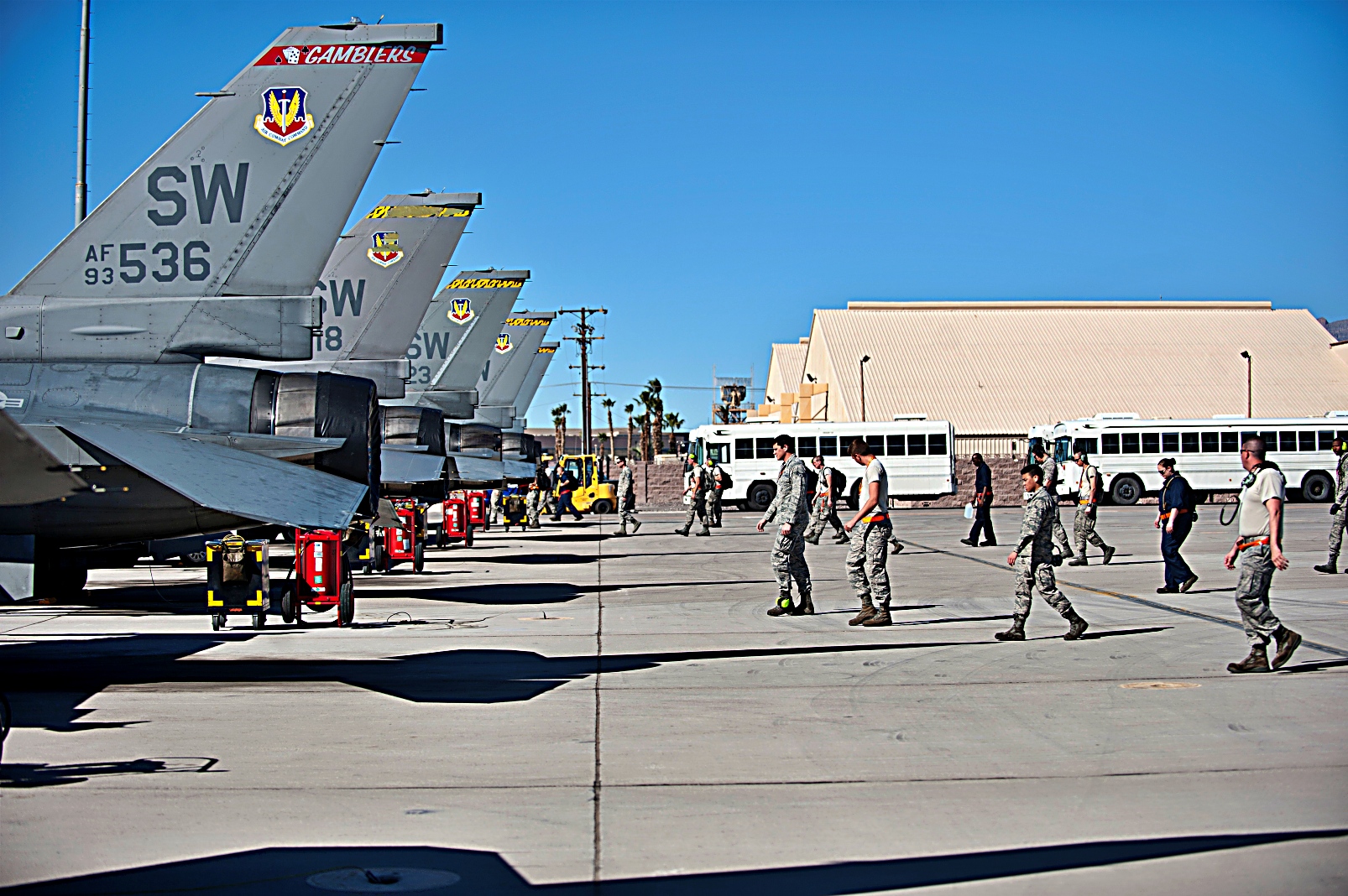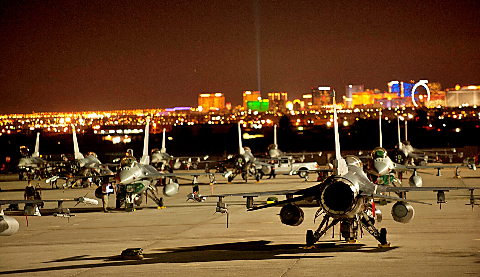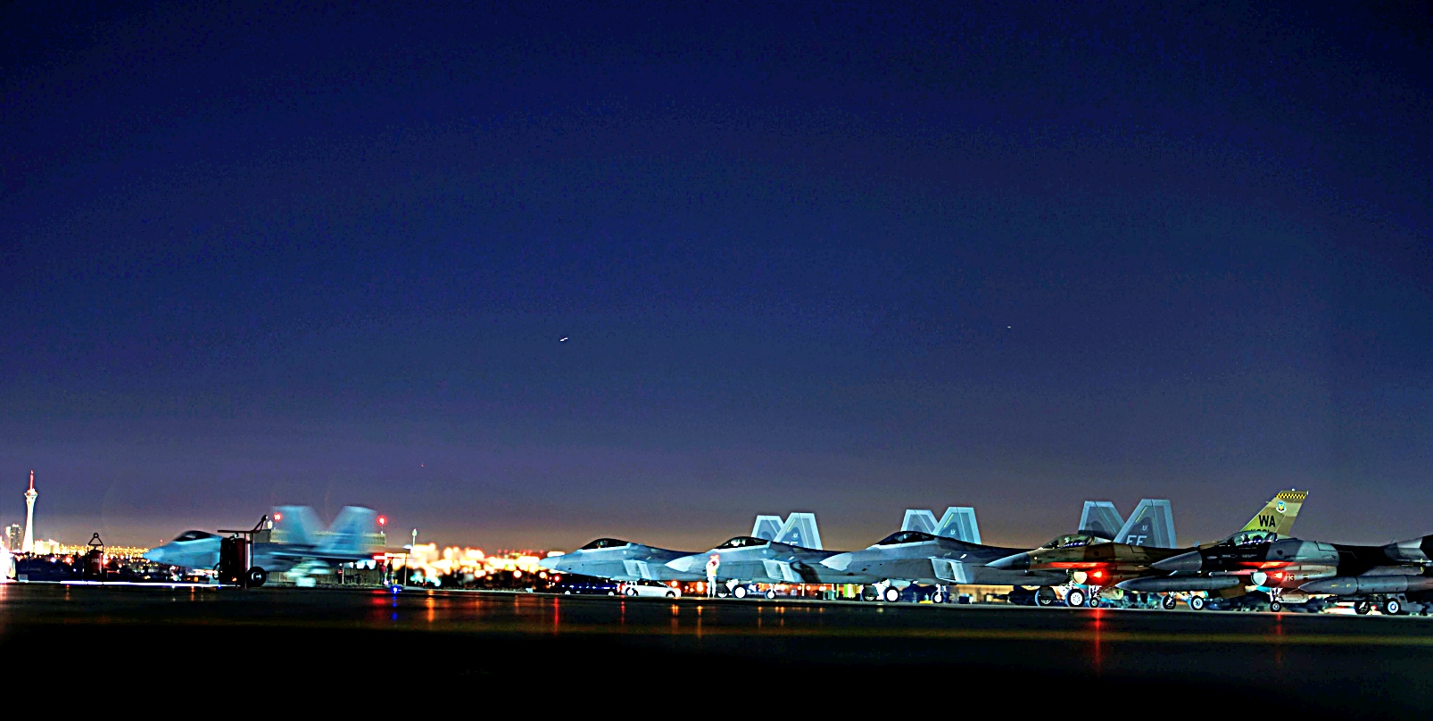 2015년 2월 5일, 네바다주 넬리스 공군기지에서 열린 Red Flag 15-1 훈련에 참가한 각 비행단의 전술기들이 이착륙하며 비행작전을 수행하고 있다. Red Flag 훈련은 290만 에이커 규모의 네바다 시험 및 훈련장에서 1,900개의 표적, 실제와 유사한 위협 시스템, 그리고 제64 가상적기비행대대의 공격기를 포함한 다양한 적군을 대상으로 진행된다.