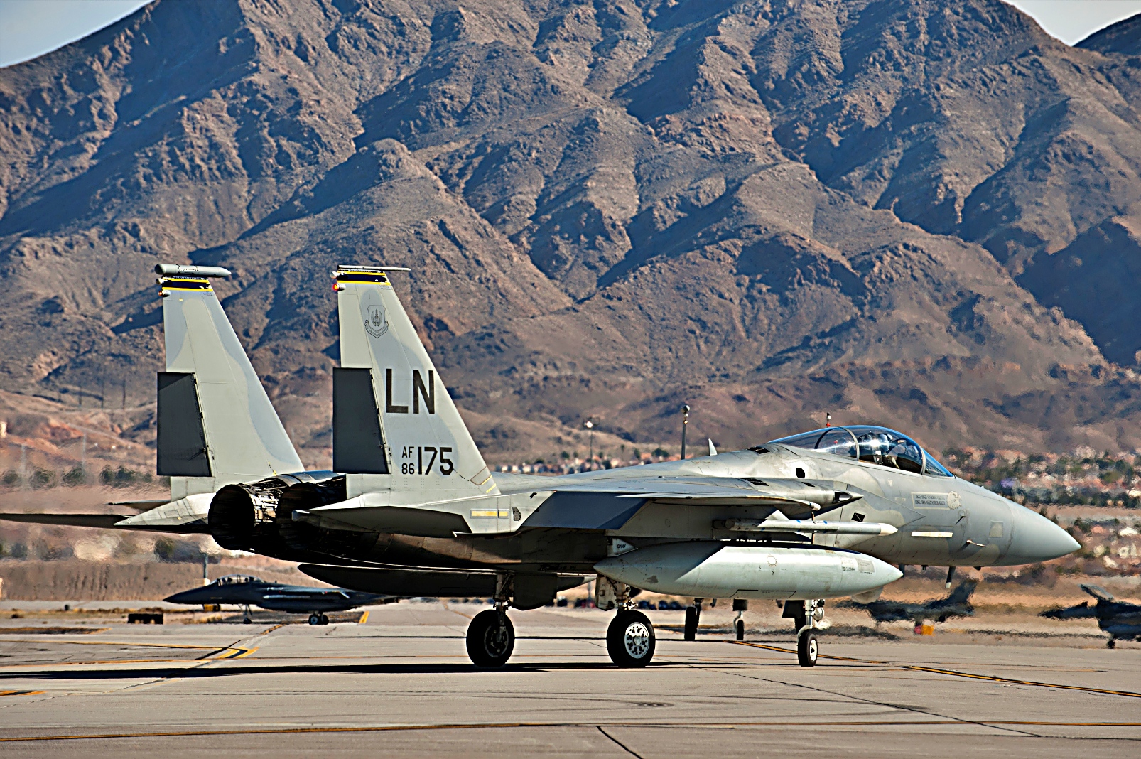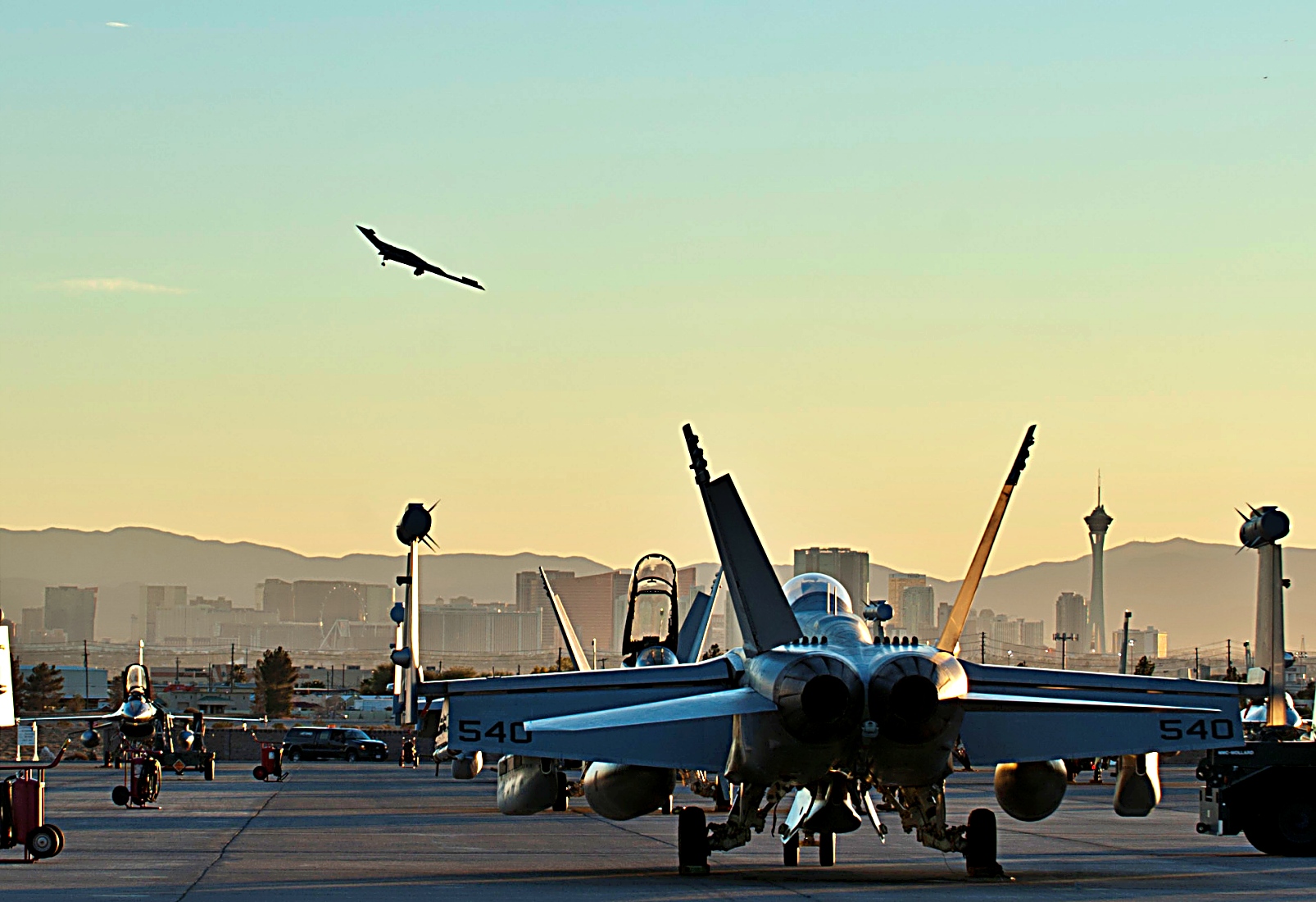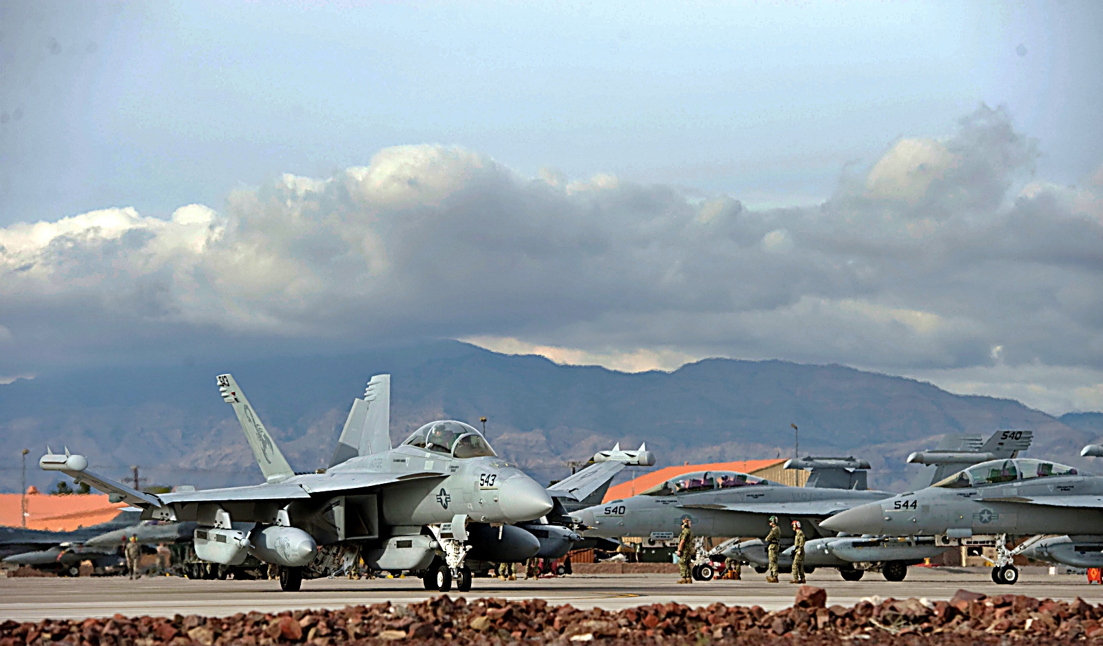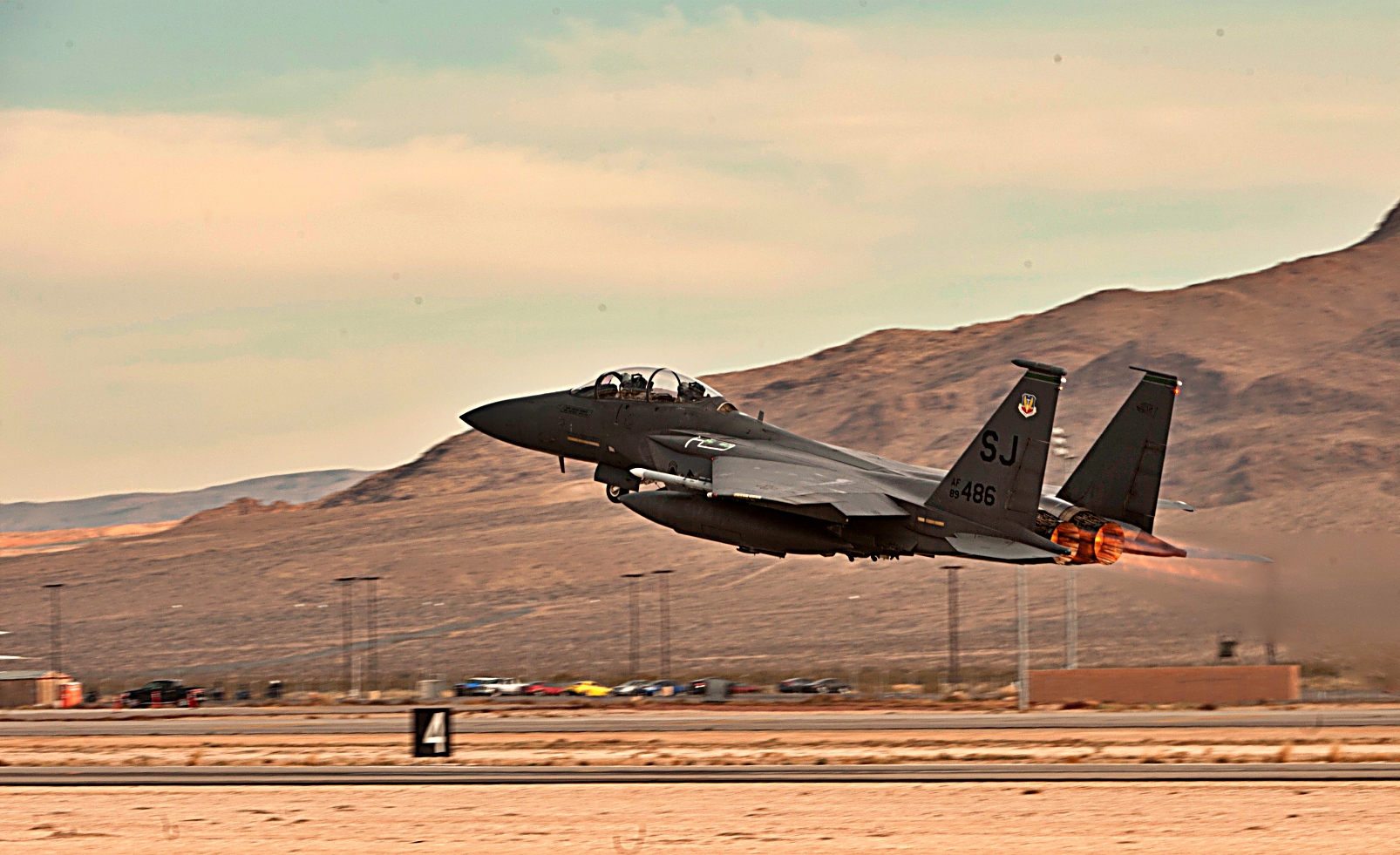 2015년 2월 5일, 네바다주 넬리스 공군기지에서 열린 Red Flag 15-1 훈련에 참가한 각 비행단의 전술기들이 이착륙하며 비행작전을 수행하고 있다. Red Flag 훈련은 290만 에이커 규모의 네바다 시험 및 훈련장에서 1,900개의 표적, 실제와 유사한 위협 시스템, 그리고 제64 가상적기비행대대의 공격기를 포함한 다양한 적군을 대상으로 진행된다.