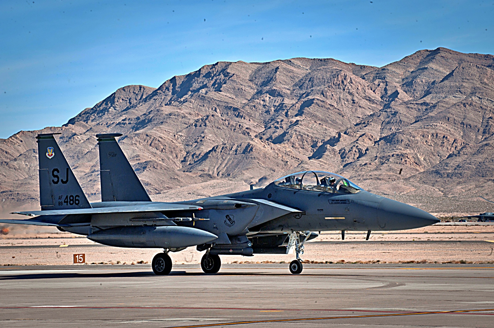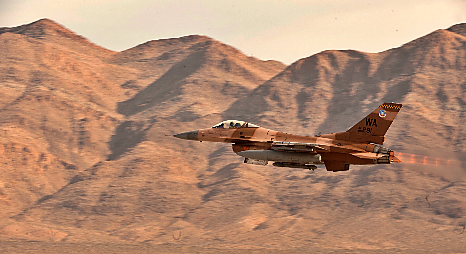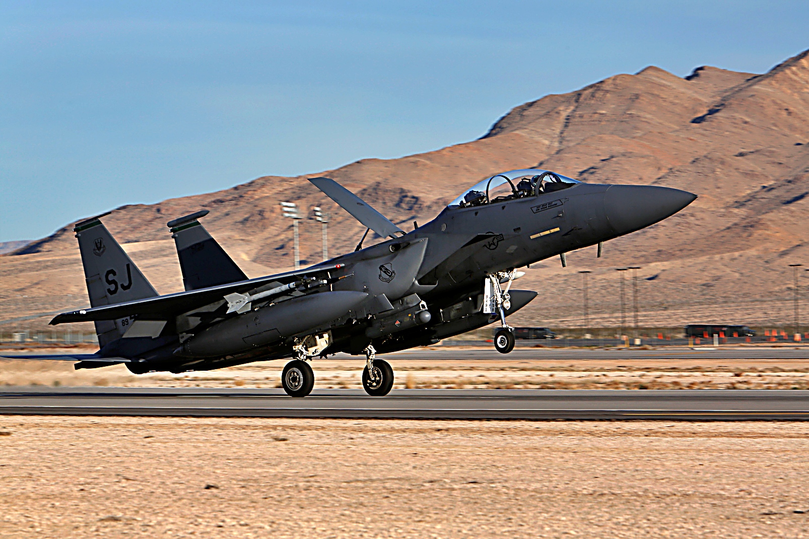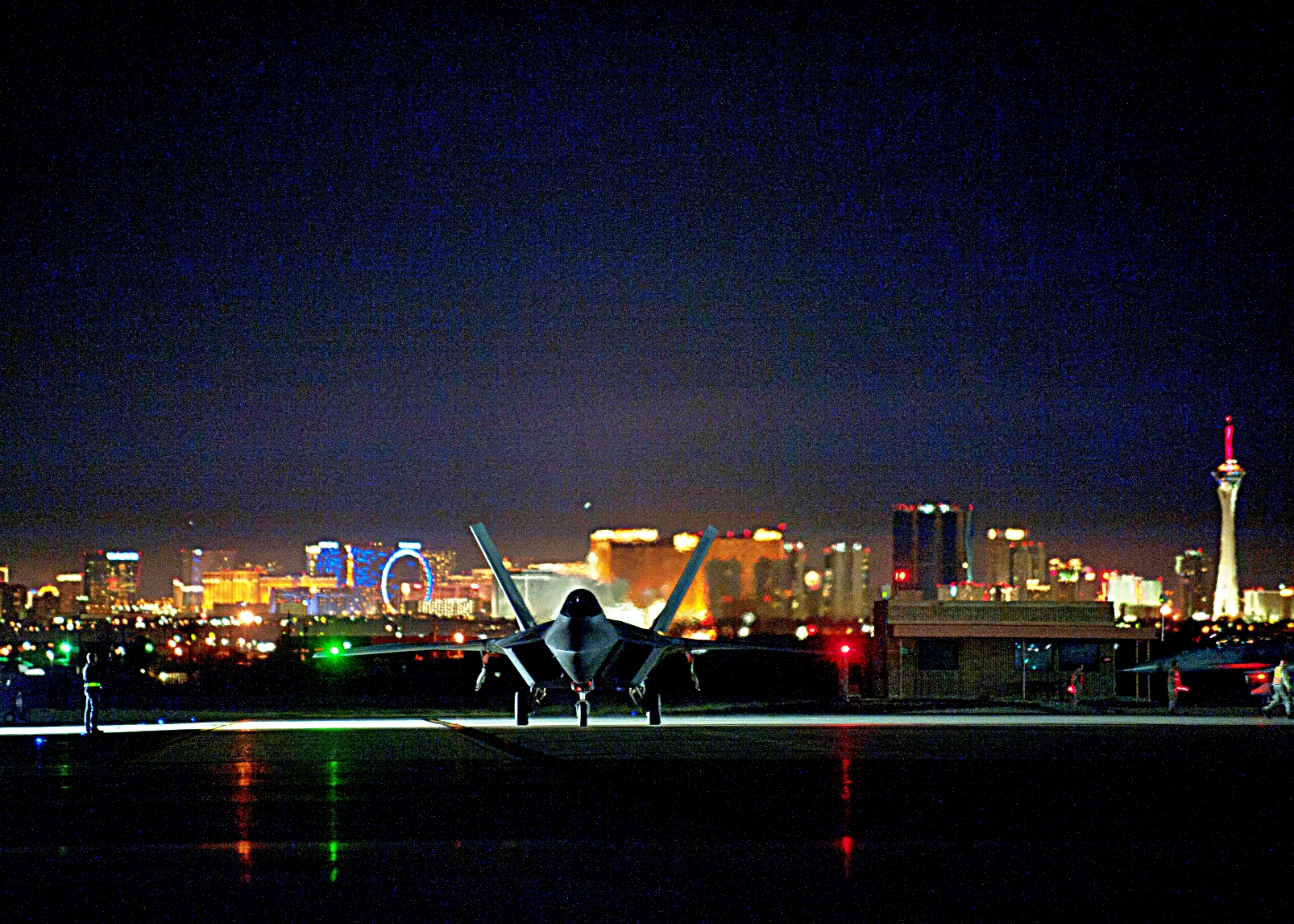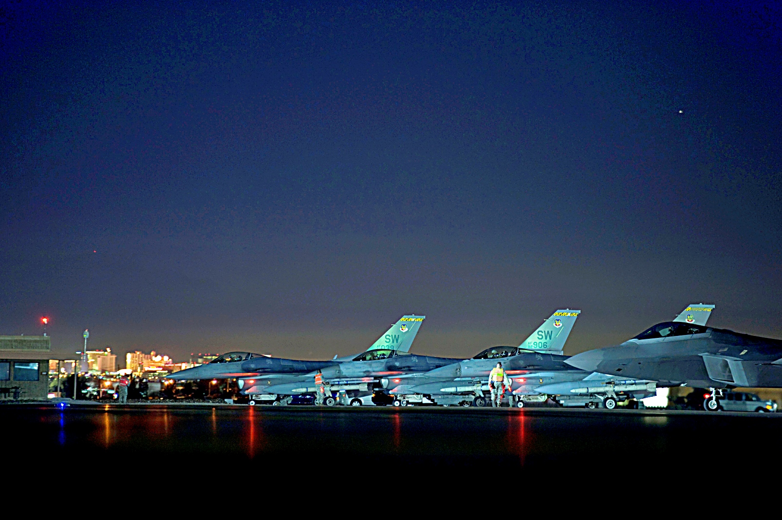 2015년 2월 5일, 네바다주 넬리스 공군기지에서 열린 Red Flag 15-1 훈련에 참가한 각 비행단의 전술기들이 이착륙하며 비행작전을 수행하고 있다. Red Flag 훈련은 290만 에이커 규모의 네바다 시험 및 훈련장에서 1,900개의 표적, 실제와 유사한 위협 시스템, 그리고 제64 가상적기비행대대의 공격기를 포함한 다양한 적군을 대상으로 진행된다.