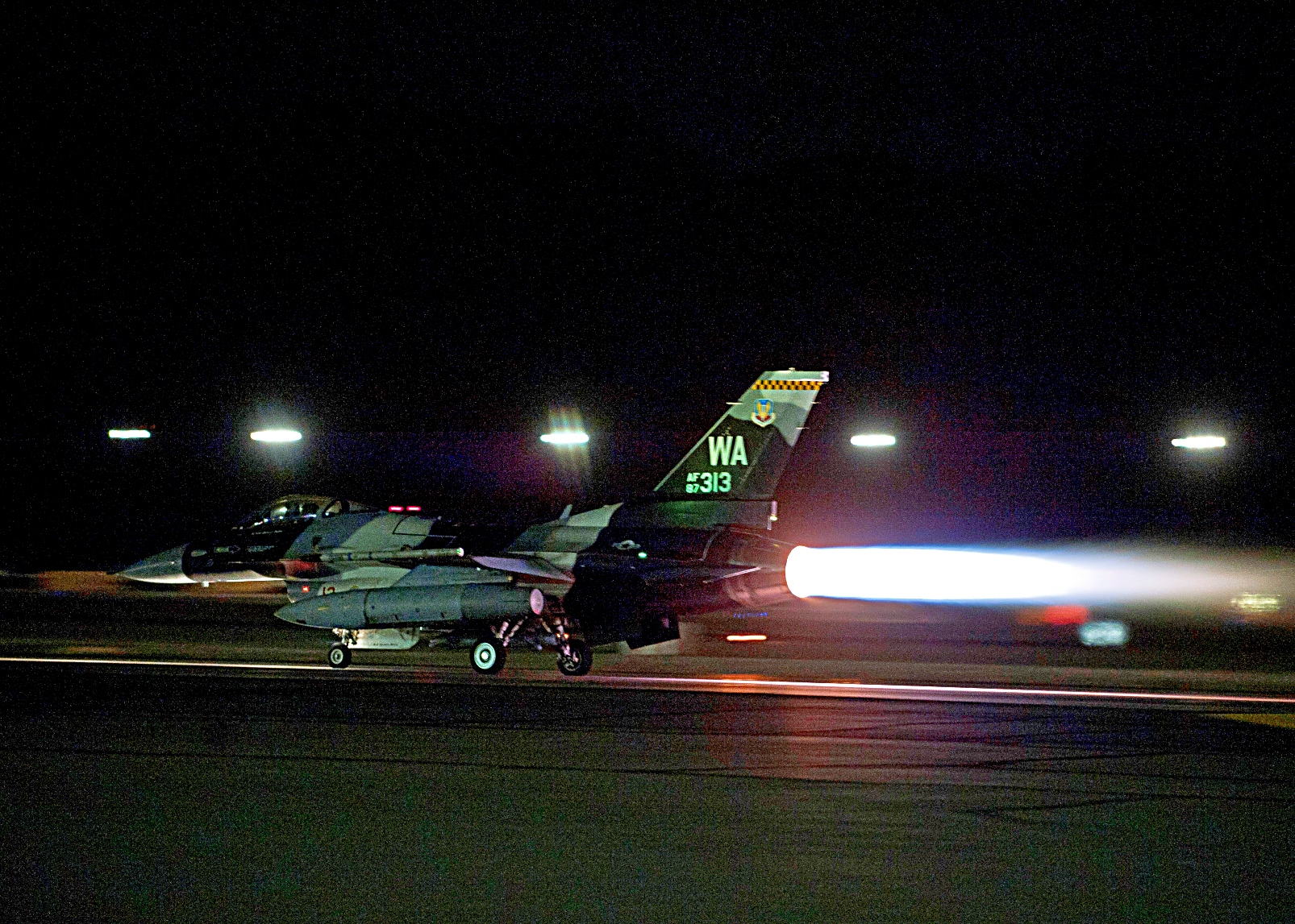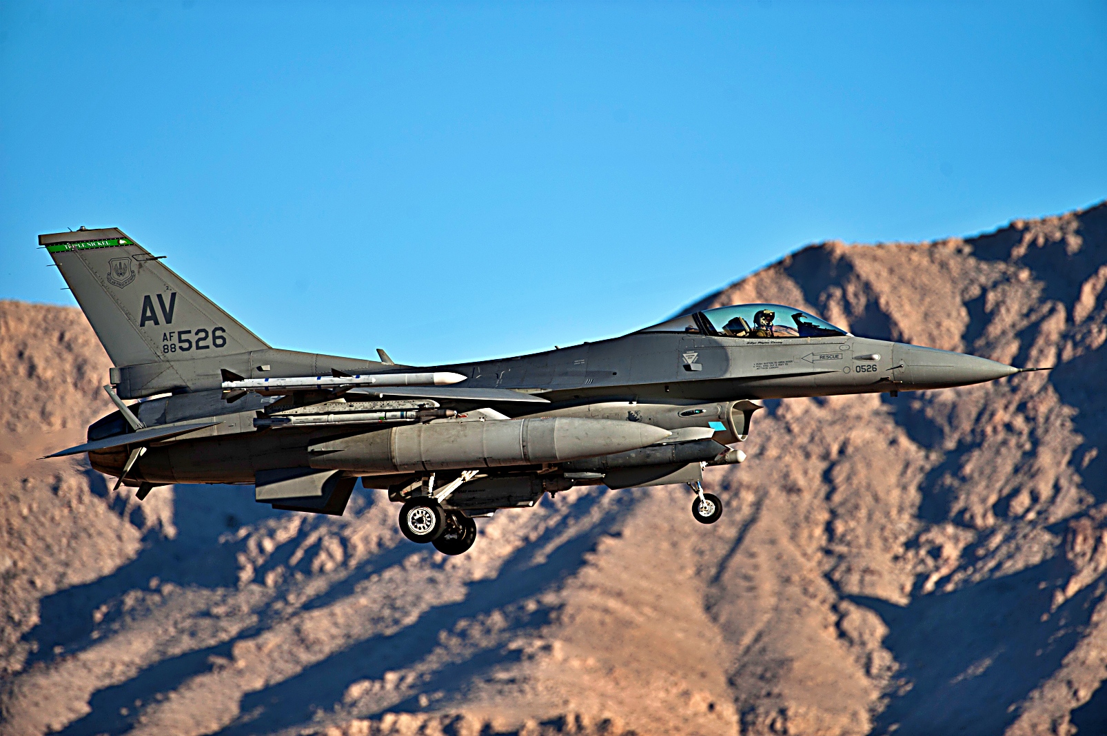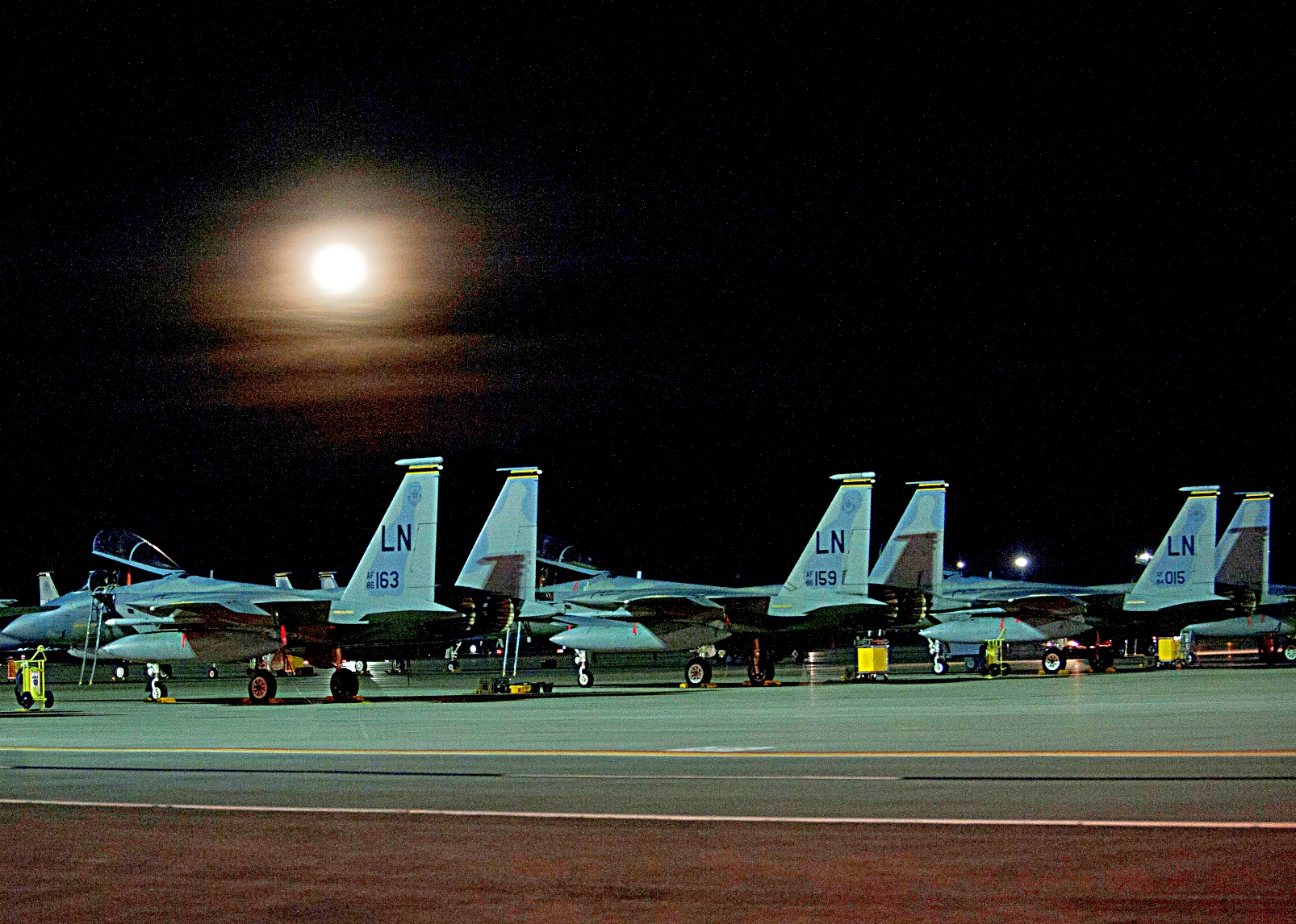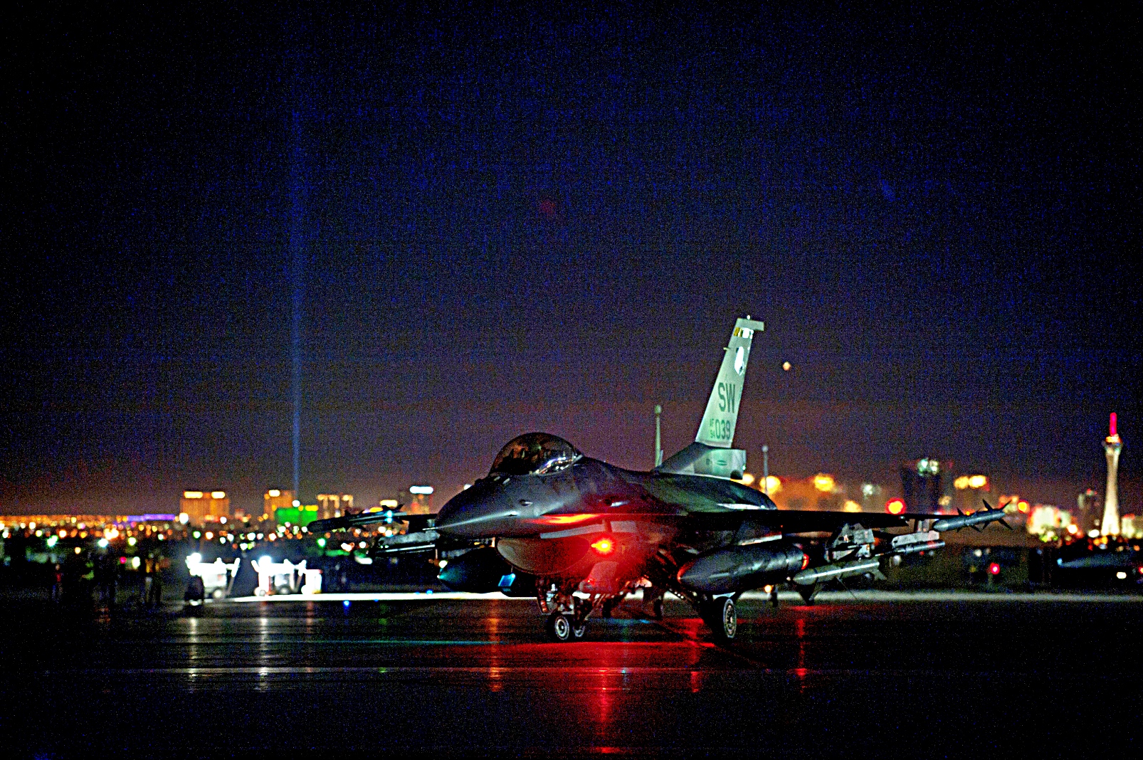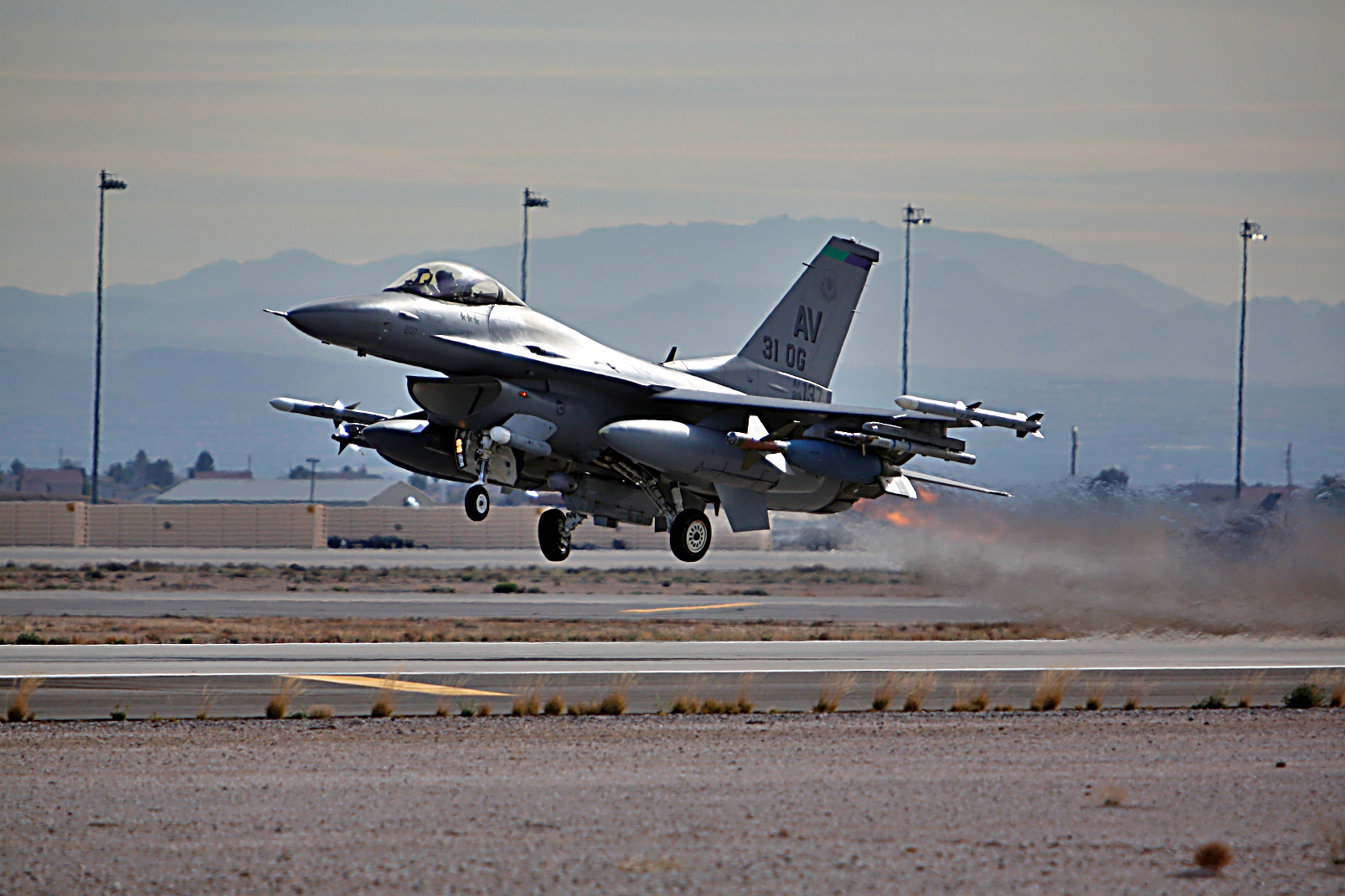 2015년 2월 5일, 네바다주 넬리스 공군기지에서 열린 Red Flag 15-1 훈련에 참가한 각 비행단의 전술기들이 이착륙하며 비행작전을 수행하고 있다. Red Flag 훈련은 290만 에이커 규모의 네바다 시험 및 훈련장에서 1,900개의 표적, 실제와 유사한 위협 시스템, 그리고 제64 가상적기비행대대의 공격기를 포함한 다양한 적군을 대상으로 진행된다.