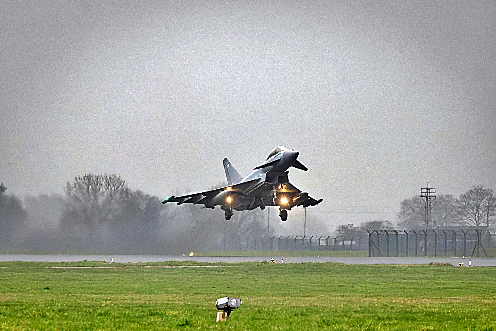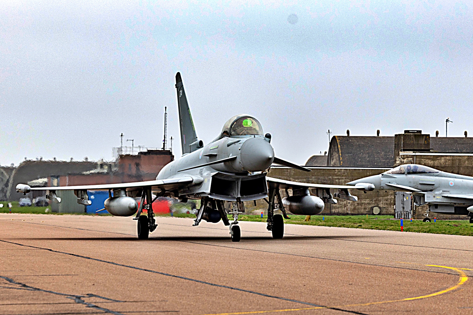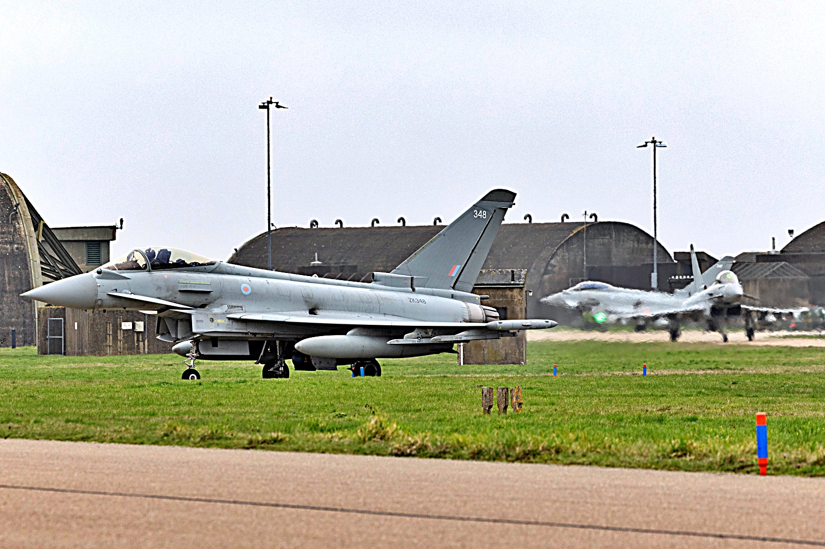 2026년 3월 6일 영국 Coningsby 공군기지에서 제3비행대대 소속의 Eurofighter Typhoon FGR4 전투기가 카타르로 전개하기 위해 준비하고 있다.