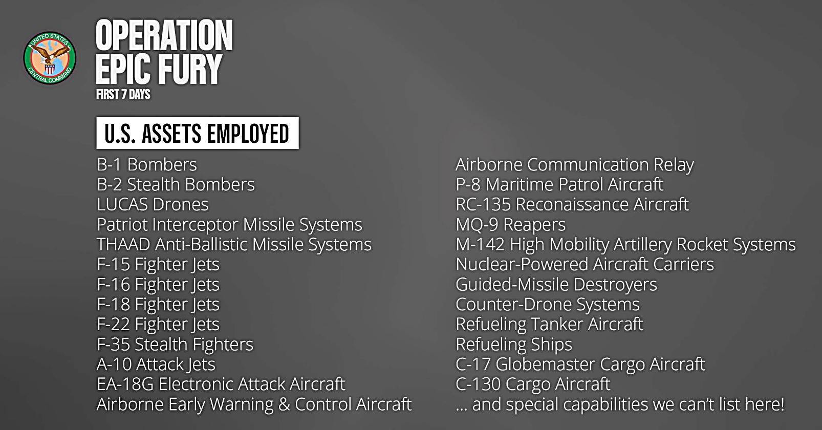 미국 중부사령부는 'Epic Fury 작전'을 통해 개전 후 첫 주 동안 이란 내 3,000개 이상의 목표물을 공격했다고 밝혔다. 공격 목표는 이란의 지휘본부, 방공 시스템, 미사일 기지, 해군 자산 등 군사 기반 시설이었다.