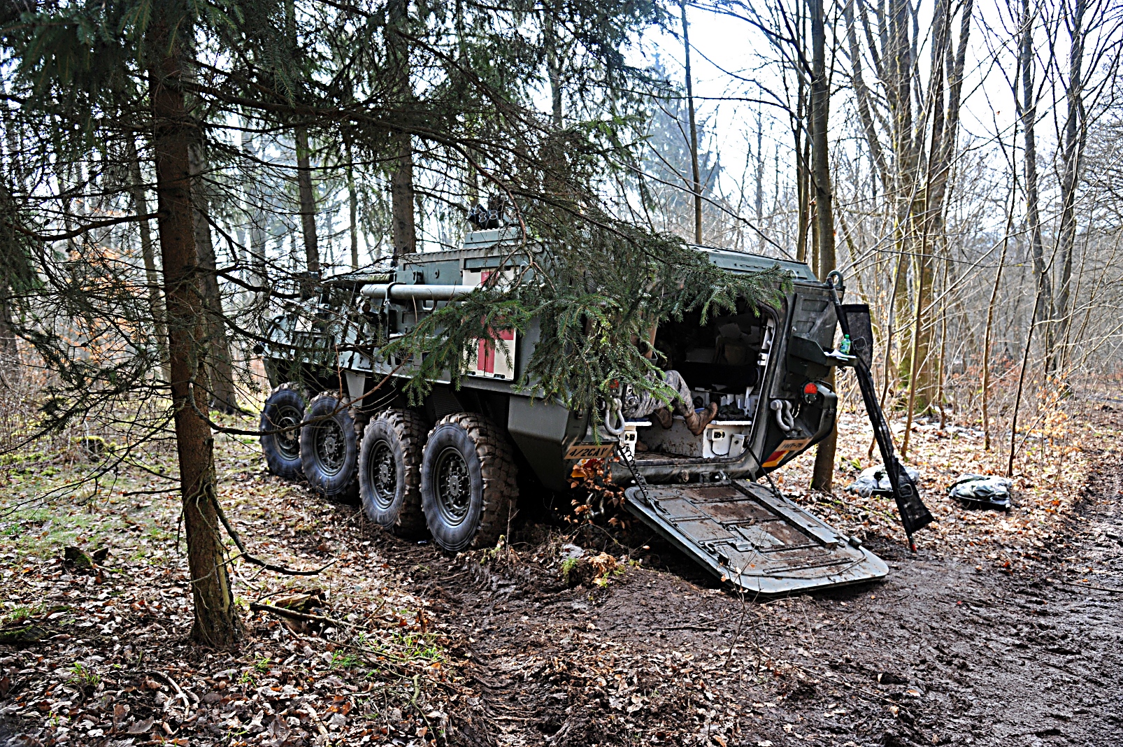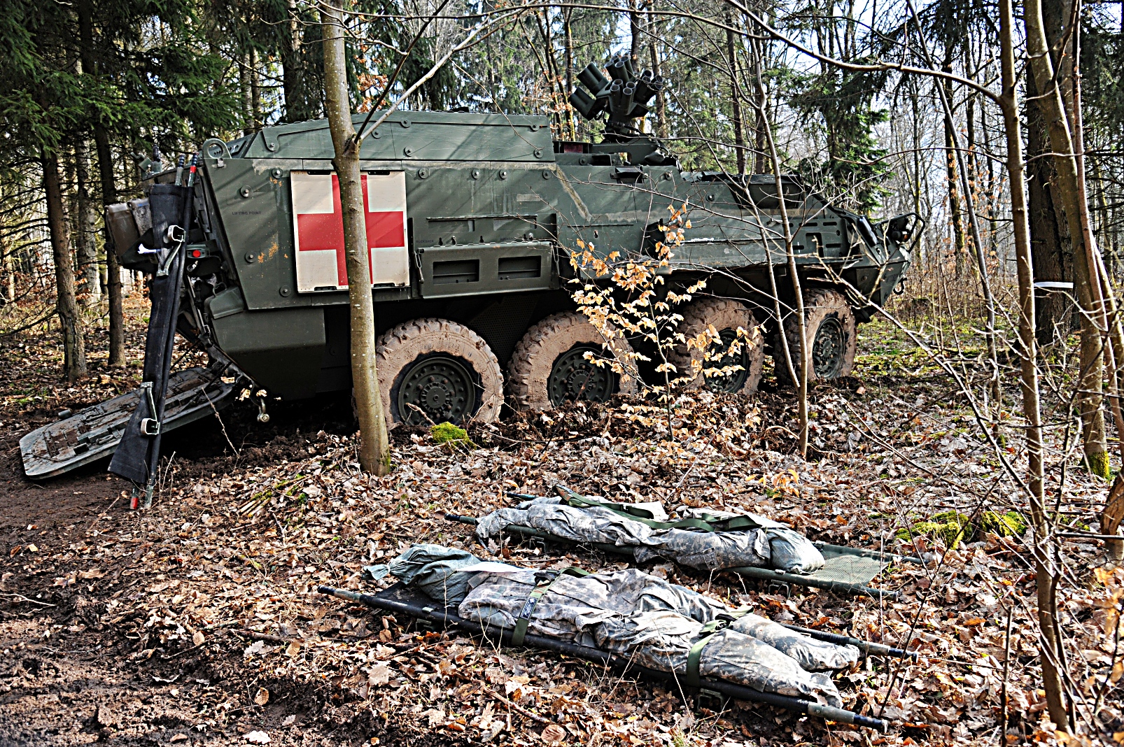 미군 제2기병연대 4대대 신속타격중대 소속 병사들이 2024년 3월 21일 독일 Grafenwoehr 훈련장에서 실시된 M1134 TOW 대전차 미사일 체계 탑재 Stryker 장갑차의 실사격 훈련 중 M1133 의무후송장갑차를 기동시키고 있다. 제2기병연대는 나토 동맹을 수호하기 위해 유럽 전역에 신속하게 배치될 수 있는 전투력을 갖춘 전력을 미군 최전방 배치군인 제5군단에 제공한다.