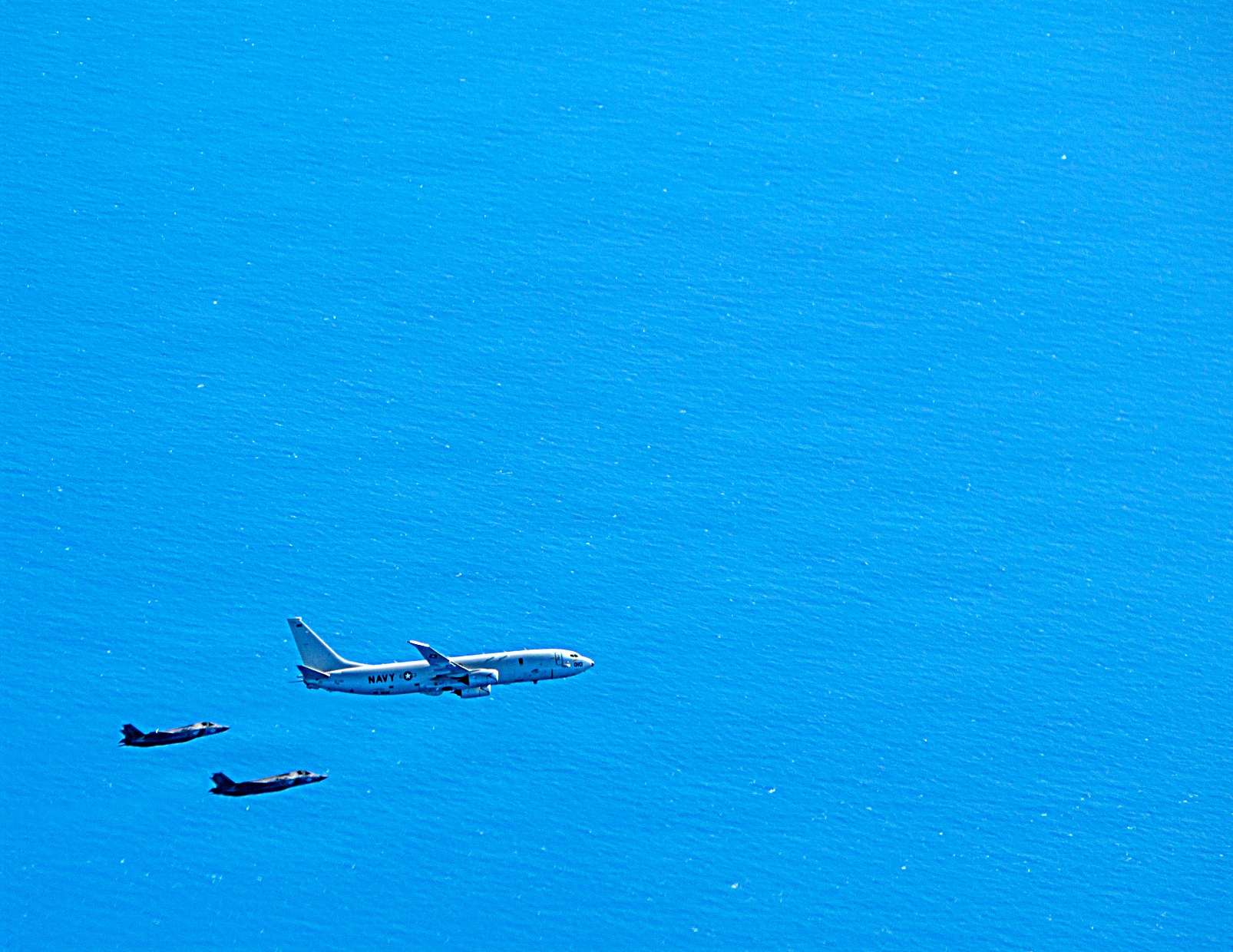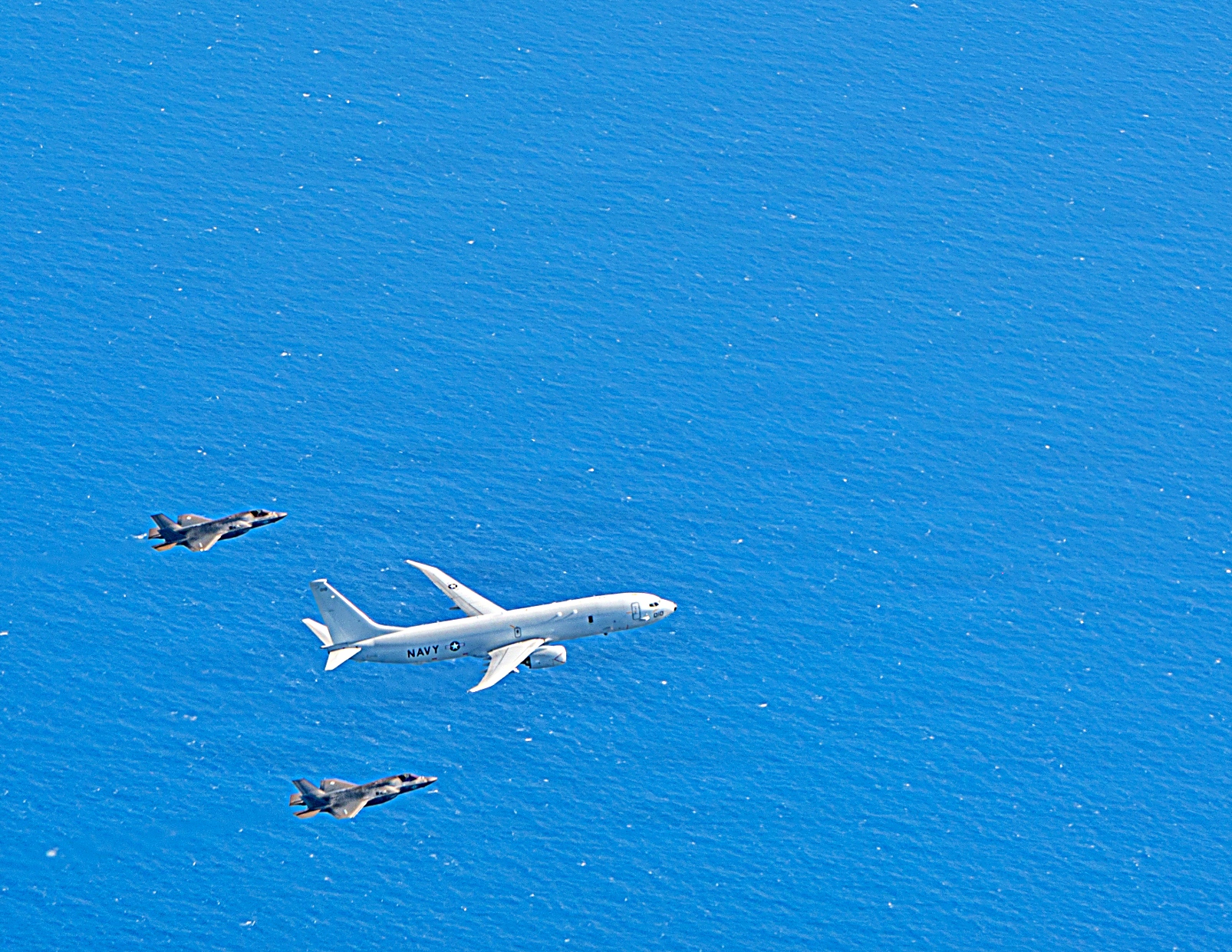2026년 3월 6일, 미 해병대 F-35B Lightning II 공격기 2대와 미 해군 P-8A Poseidon 해상초계기 1대가 베네수엘라 인근 하늘에서 합동 공중전력 연안 순찰 훈련을 실시하고 있다. 미군은 미 남부사령부 임무, 전쟁부 지시 작전, 그리고 불법 마약 거래 차단 및 본토 안보라는 대통령의 주요 정책 목표를 지원하기 위해 카리브해 지역에 배치되어 있다.