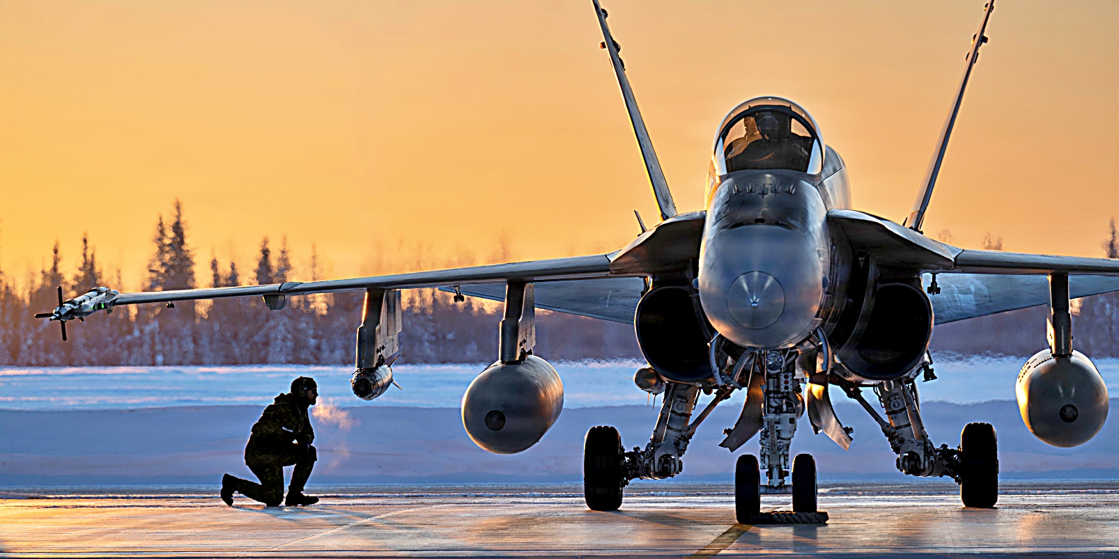 알래스카주 에일슨 공군기지에서 열린 Arctic Edge 26 훈련 중, 캐나다 공군 소속 CF-188 Hornet 전투기가 눈 덮인 산을 배경으로 북극의 겨울 날씨 속에서 활주로를 이륙하고 있다. Arctic Edge 26(AE26)은 북미항공우주방위사령부(NORAD)와 미국 북부사령부가 주도하는 본토방위 훈련으로, 북극 지역에서의 준비태세를 향상시키고, 역량을 시연하며, 연합군 및 동맹군의 상호운용성을 강화하기 위해 설계됐다.
