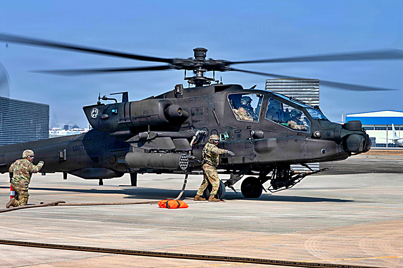 한미연합 Freedom Shield 26 훈련에 참가한 미 육군 제2보병사단/한미연합사단 제2전투항공여단 제602항공지원대대 소속 장병들이 2026년 3월 10일, 포항공항의 미해병대 기지에서 실시된 Talon Reach 훈련 중 여러 개의 전방 급유 및 무장 보급소(FARP Forward Arming and Refueling Points)를 설치하고 있다. FARP는 한반도 전역에 걸쳐 항공 전력의 신속한 재급유 및 비행 작전 지속을 위한 필수적인 연료 지원을 제공하며, 1,100마일(약 1,777km) 이상의 공중 이동을 지원하고 미군이 언제든 전투에 나설 수 있도록 준비 태세를 갖추도록 한다.