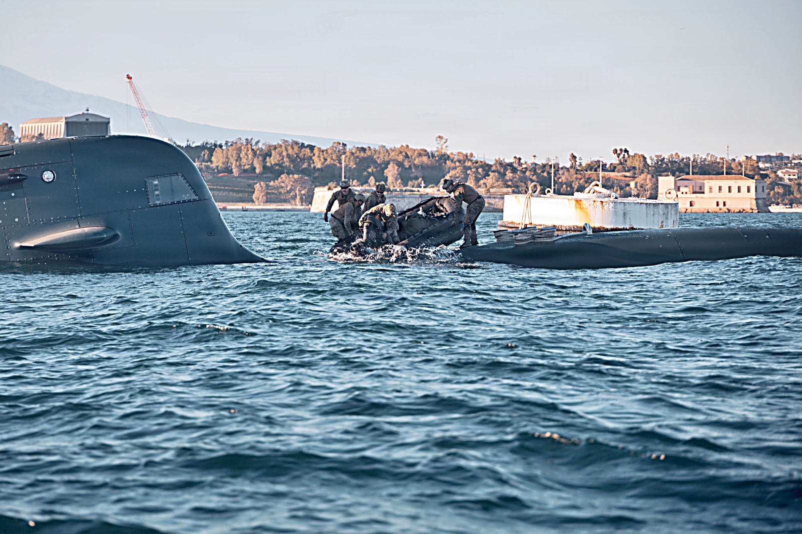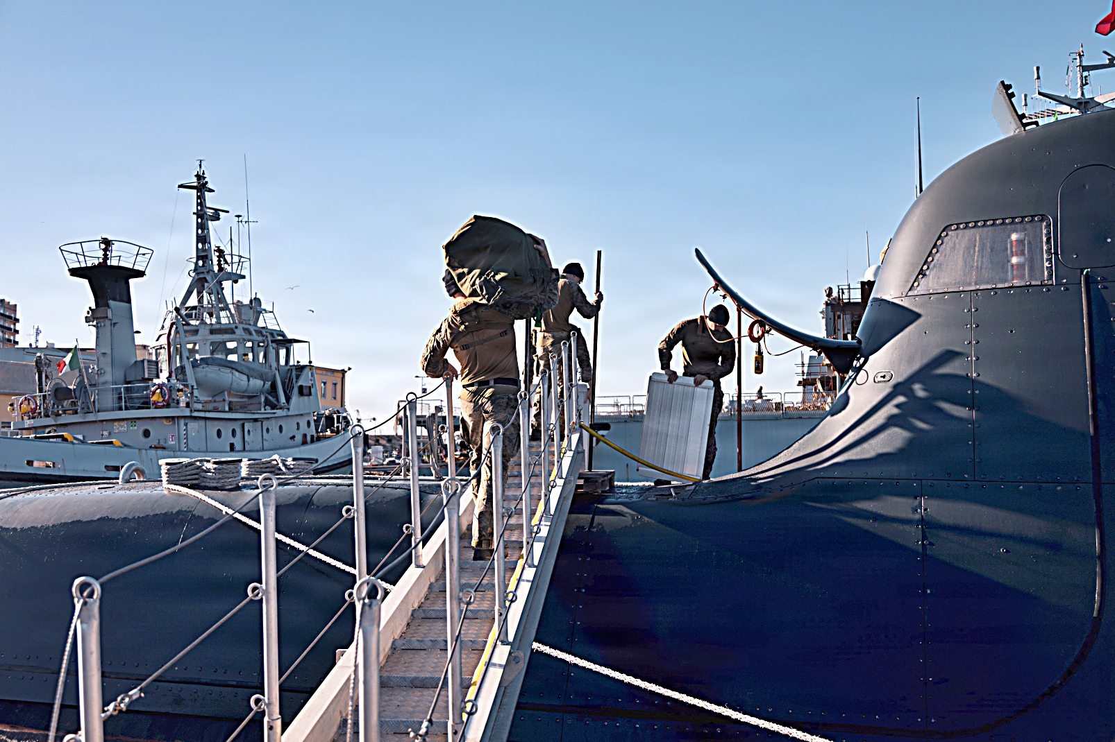 2026년 2월 22일, 이탈리아 Augusta에서 미 해병대 제2해병사단 제2정찰대대 제2수색중대 소속 해병대원과 해군 장병들이 잠수함에서 Combat Rubber Raiding Craft를 진수하고 있다. 이들은 나토 주도 훈련인 Dynamic Manta 26의 일환으로 이 훈련을 실시했다. Dynamic Manta는 모든 참가국에 복잡하고 도전적인 전쟁 훈련을 제공하여 대잠 및 대수상전 분야에서 상호 운용성과 숙련도를 향상시키는 것을 목표로 하는 훈련이다.