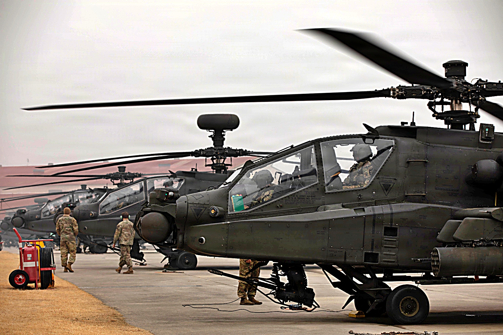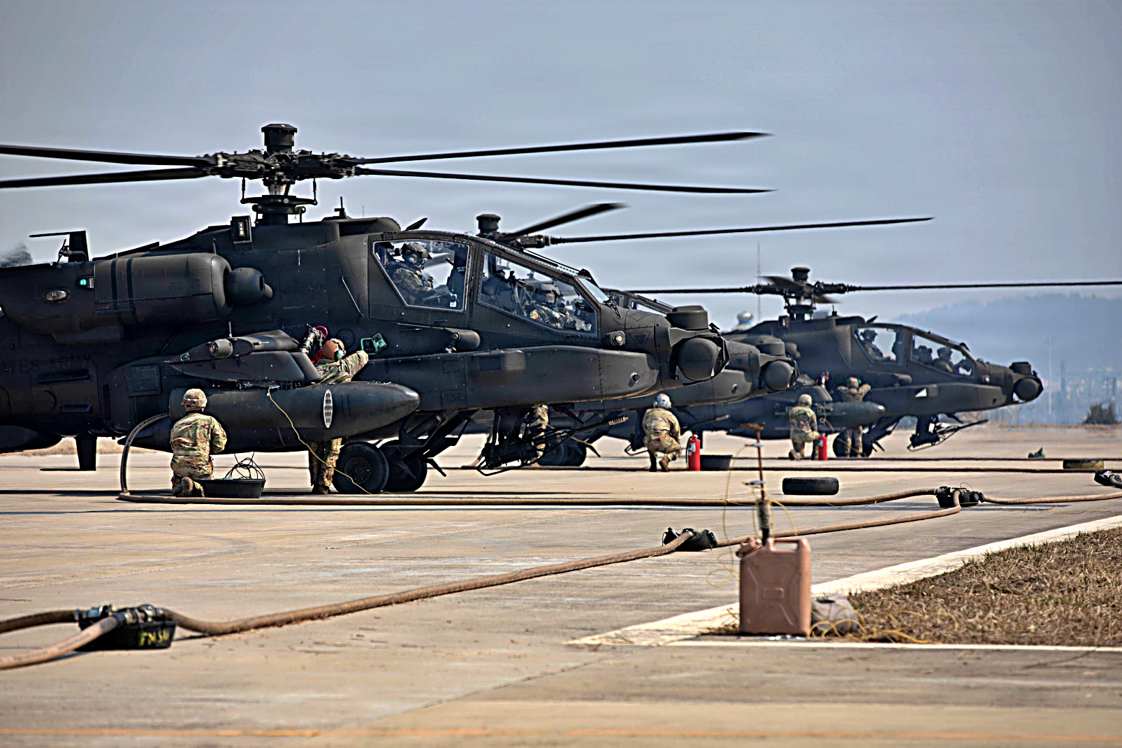 미 육군 제2보병사단/한미연합사단 제2전투항공여단 제2항공연대 제4대대 소속 장병들이 2026년 3월 12일, 비공개 장소의 전방무장급유지(FARP)에서 AH-64 아파치 헬리콥터에 재급유를 하고 있다. 무인항공기 시스템을 이용한 정찰 후, 아파치 헬리콥터들은 모의 적 목표물에 대한 공격 항공 작전을 수행하기 위해 이륙했으며, 이는 한반도 전역에서 연합 작전을 지원하기 위한 여단의 신속한 공중급유, 재배치 및 전투력 운용 능력을 시연하는 것이었다.