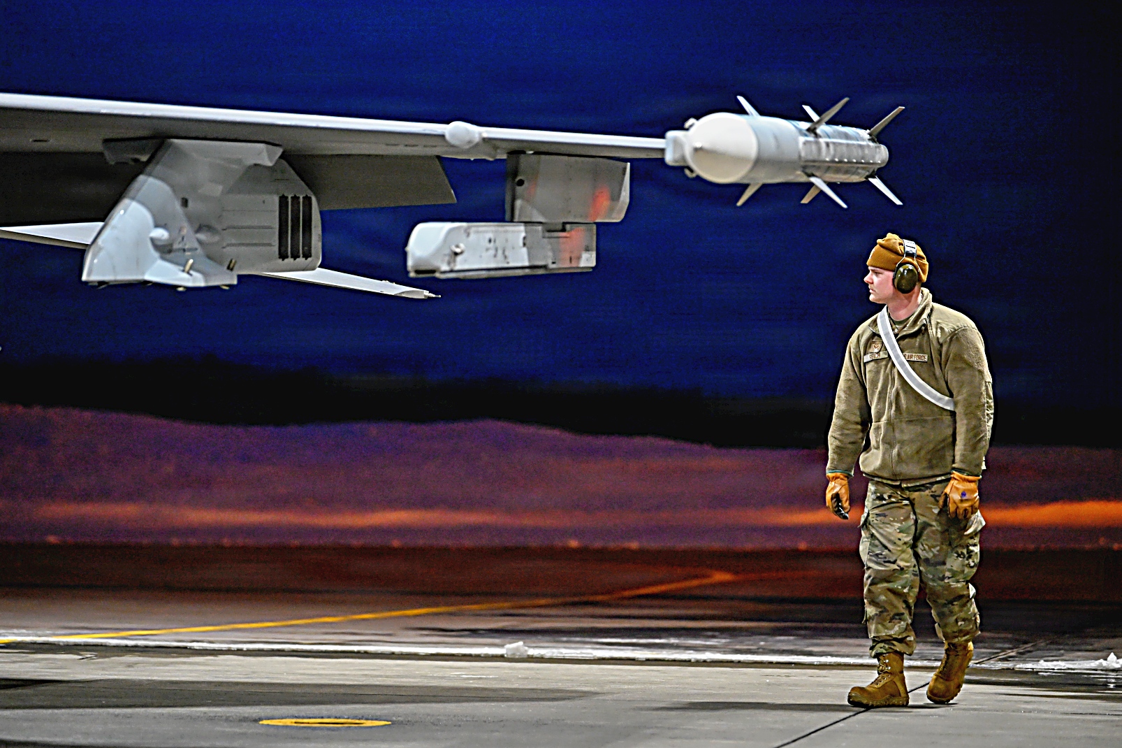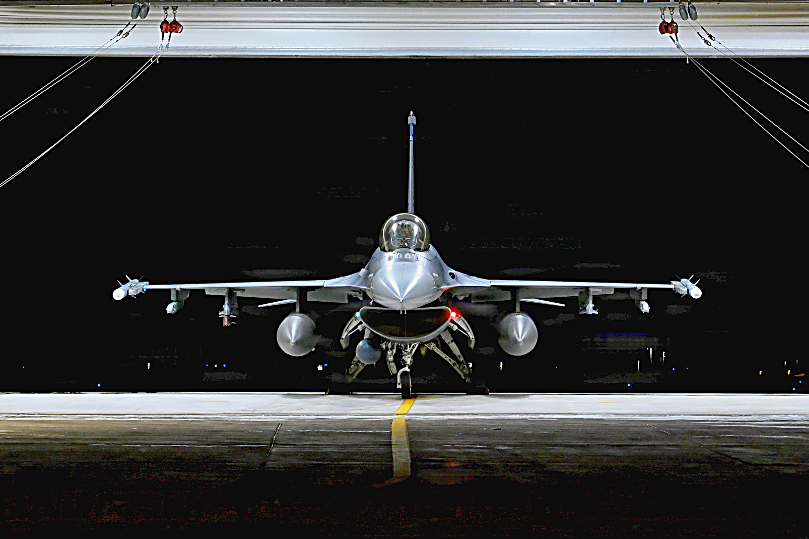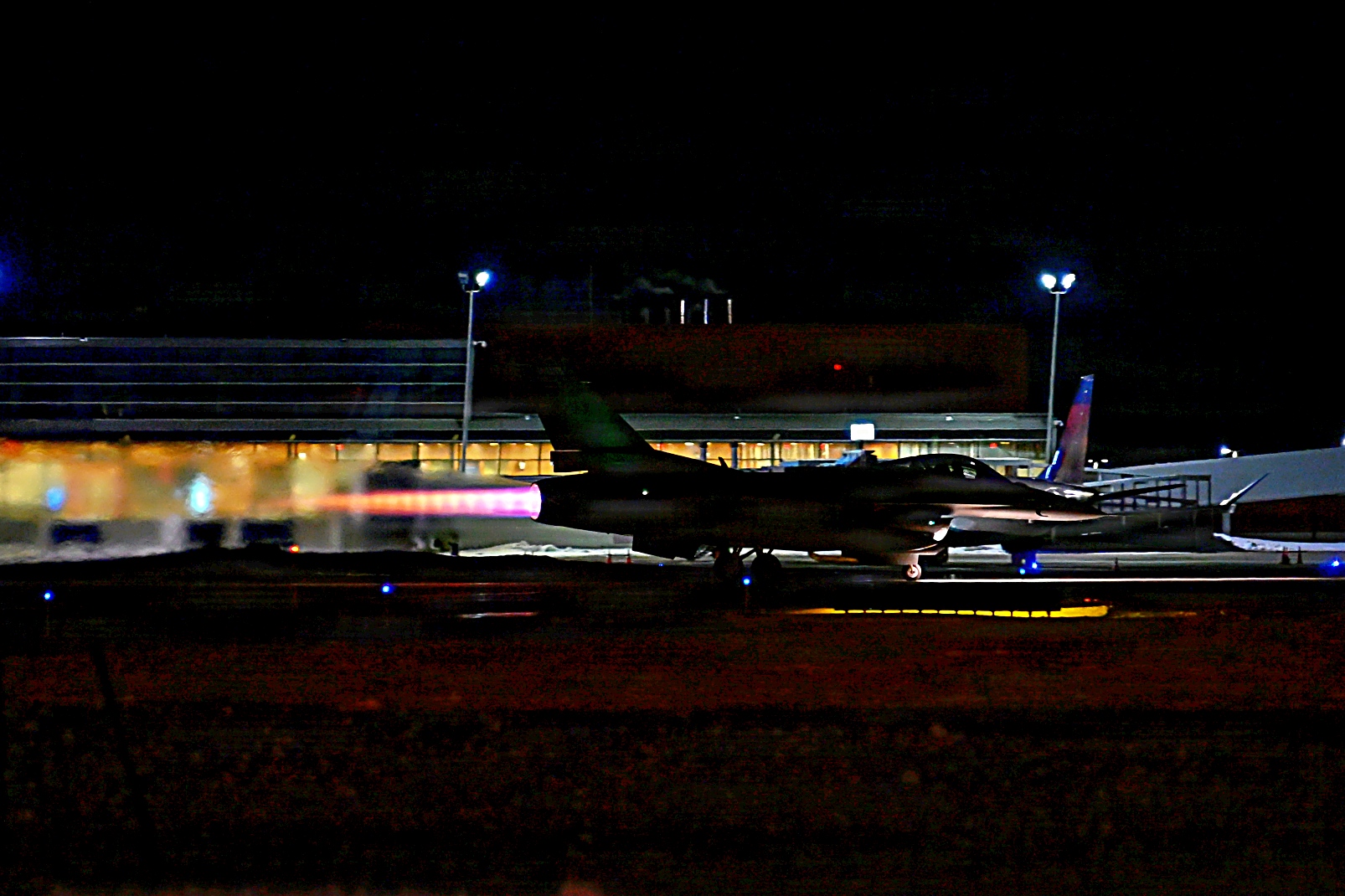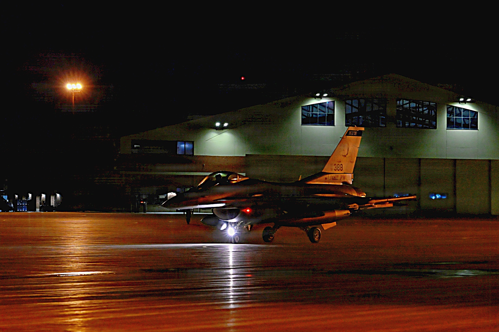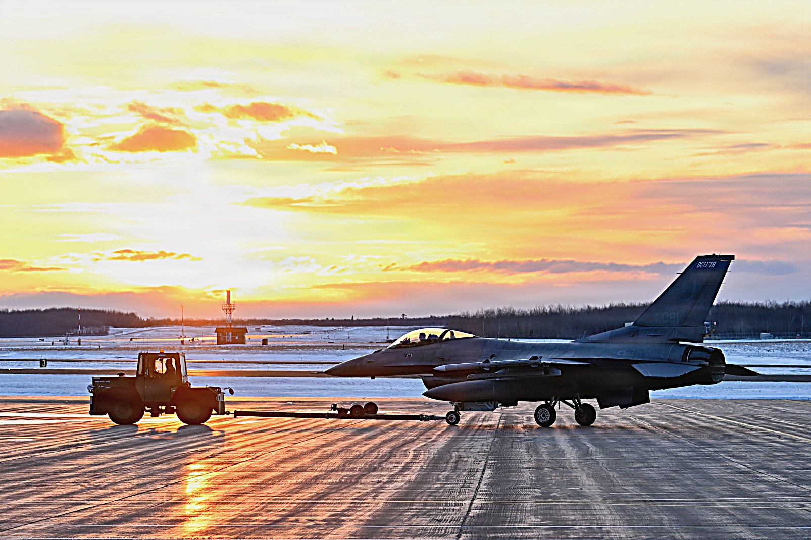 2026년 3월 11일, 미네소타주 Duluth 국제공항에서 미네소타 주방위군 제148전투비행단 제179전투비행대대 소속 F-16 Fighting Falcon 전투기가 야간 비행 훈련 중 이륙하고 있다. 야간 비행 훈련은 조종사의 기량을 향상시키고 모든 조건에서 임무 수행 준비 태세를 확보하는 데 도움이 되며 다양한 시야 및 기상 조건에서 안전하게 임무를 수행할 수 있도록 준비시키는 훈련이다.