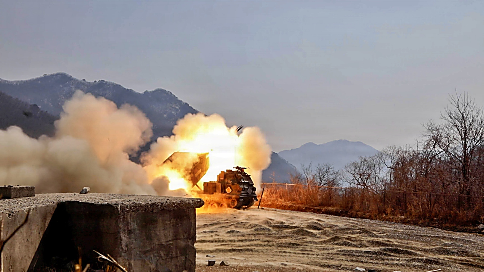 2026년 3월 17일, Freedom Shield 26 훈련중 주한 미 육군 제210 야전포병여단 제37야전포병연대 제6대대 예하 Apocalypse 포대는 3월 17일 경기도 포천의 Rocket Valley 실사격훈련장에서 M270A1 다연장 로켓 시스템이 로켓을 발사하고 있다.