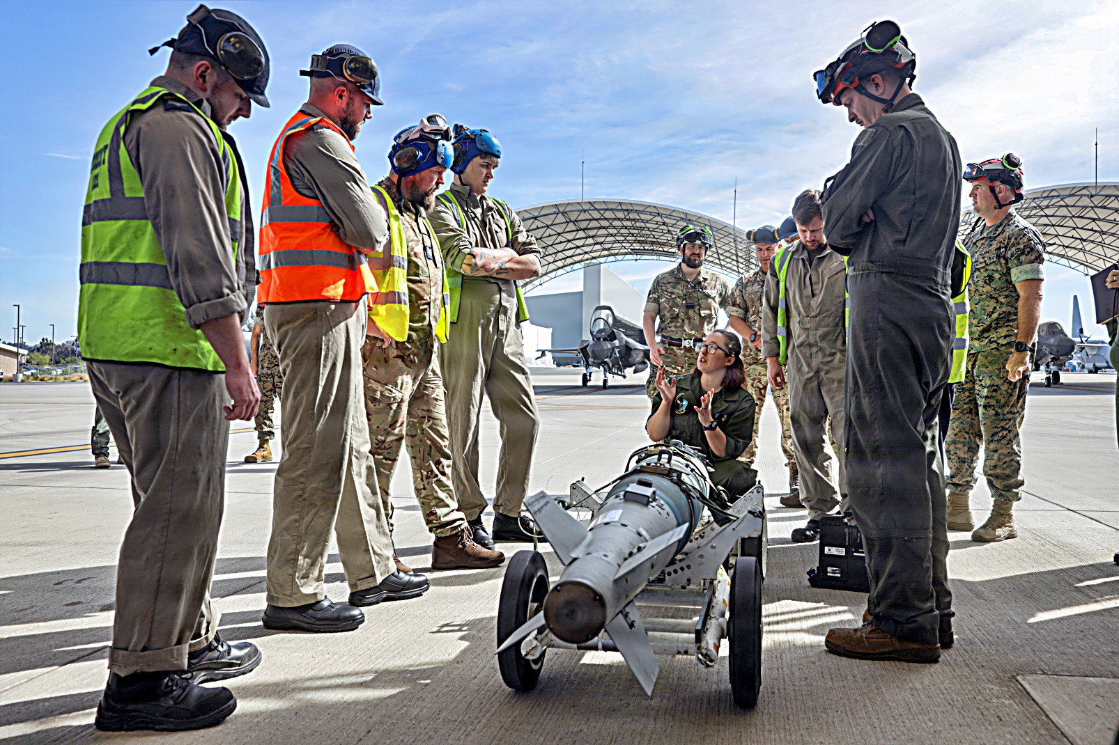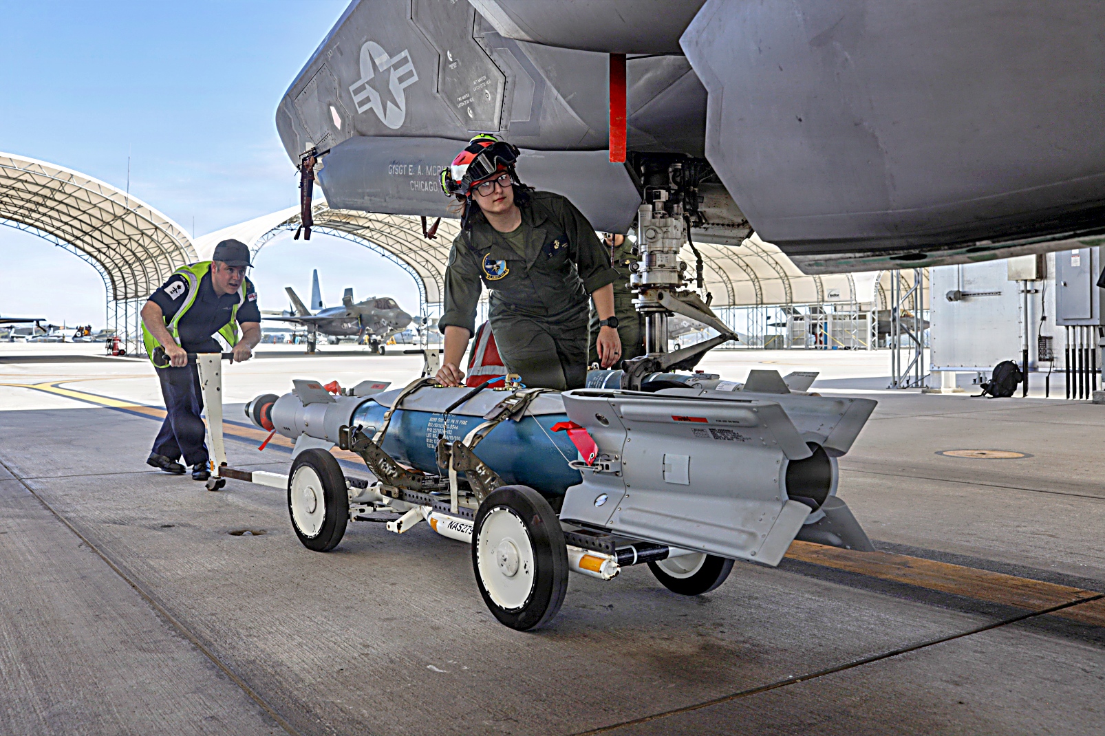 미 해병대 제3해병항공단 제11해병항공군 VMFAT 502 해병전투공격훈련대대소속 무장병들이 2026년 3월 17일 캘리포니아주 Miramar 해병항공기지에서 영국 공군 및 해군과의 연합 양자 훈련 중 F-35B Lightning II 공격기에 GBU-12 Paveway II 레이저 유도 폭탄을 장착하는 교육을 실시했다.