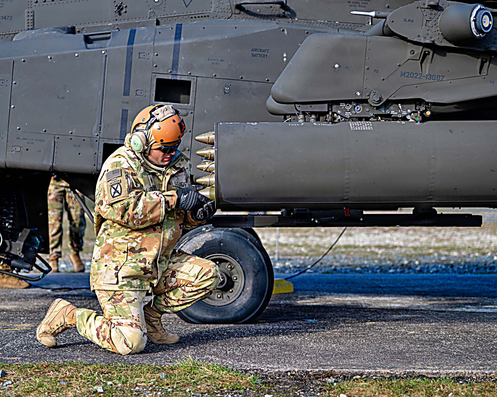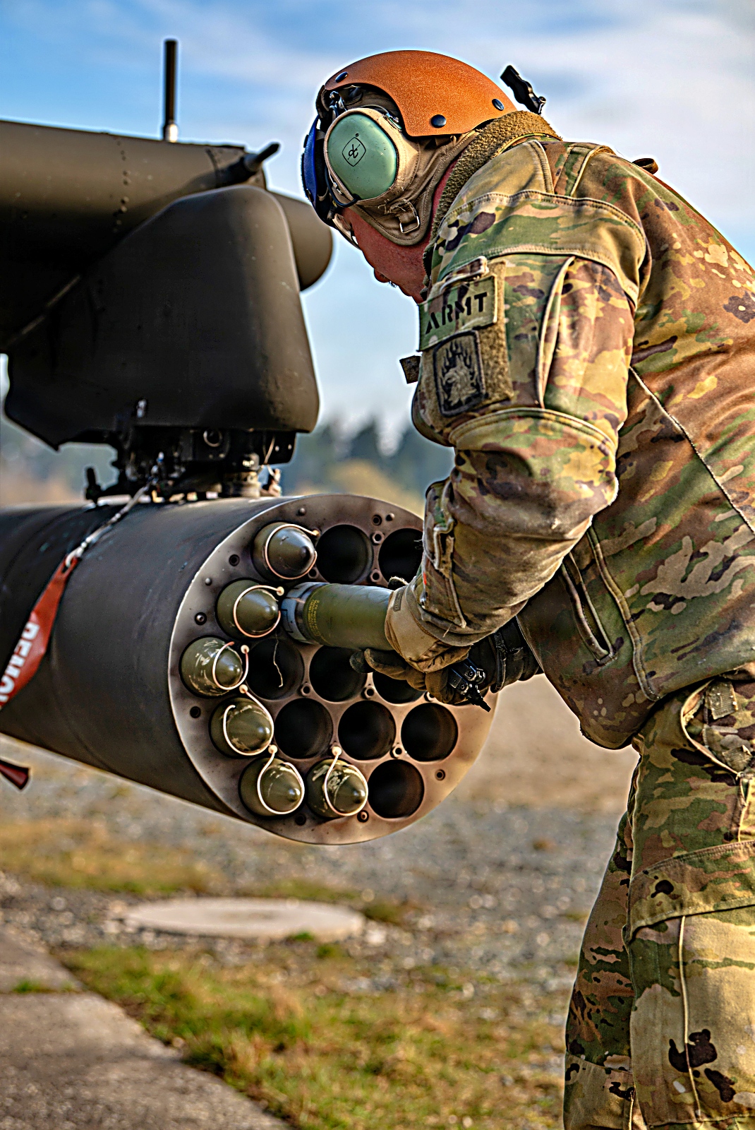 미 육군 제159공격대대 제2대대 델타 중대 소속 AH-64E Apache 공격헬리콥터 정비병들이 2026년 3월 19일 독일 Grafenwoehr 훈련장에서 실시된 Operation Skyfall 중 AH-64E 아파치에 장착할 M255 A1 Flechette 로켓을 집어 들고 있다. 스카이폴 작전은 AH-64E 아파치의 무인항공기 대응 능력을 시연함으로써 동부 전선 억제 구상(EFDI)을 진전시키기 위해 설계된 훈련이다.