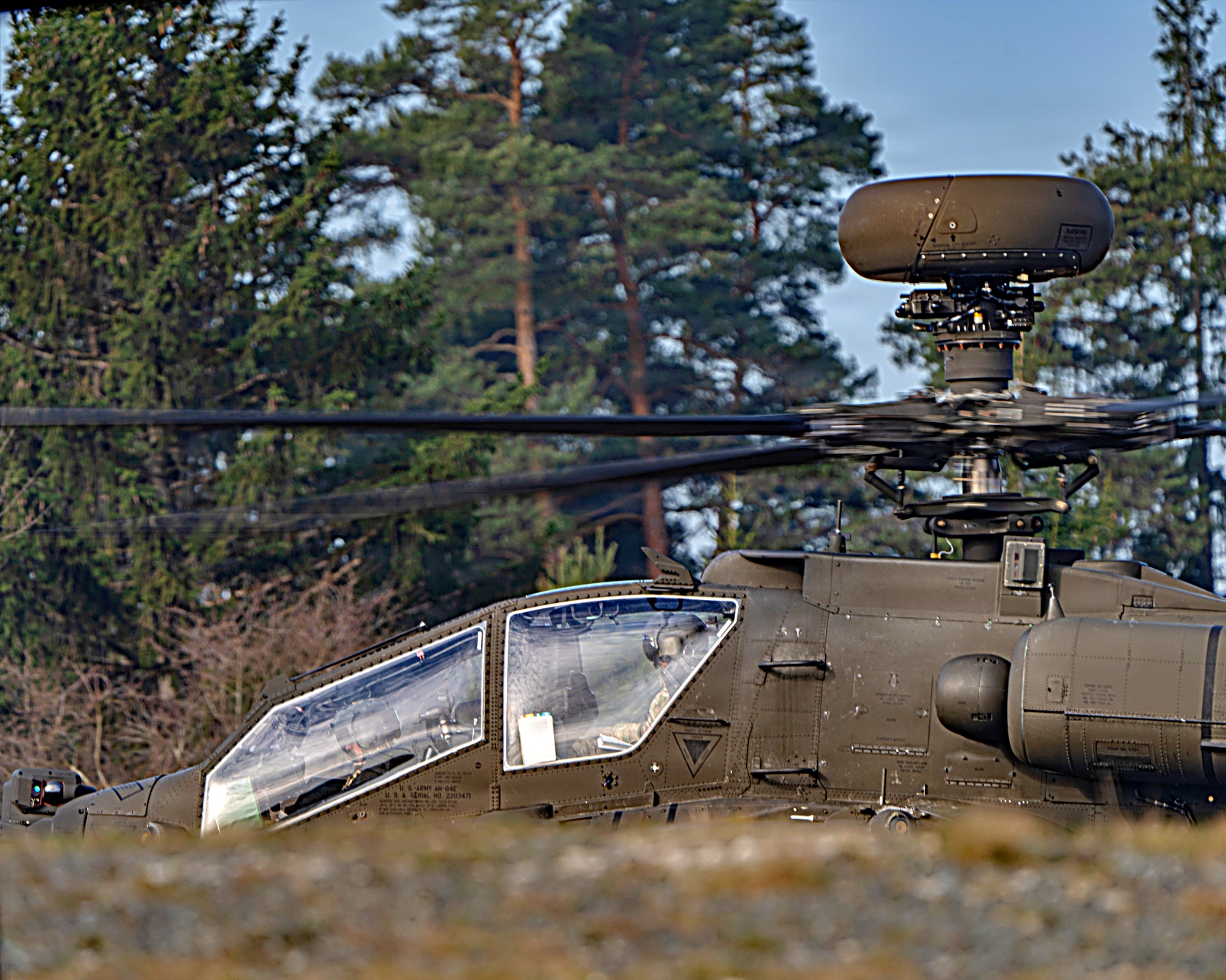 미 육군 제12전투항공여단 제159항공연대 2대대 소속 AH‑64E Apache Guardian 헬리콥터가 2026년 3월 18일 독일 Grafenwoehr 훈련장에서 실시된 Operation Skyfall 의 일환으로 APKWS 로켓을 이용한 정밀 공중전 훈