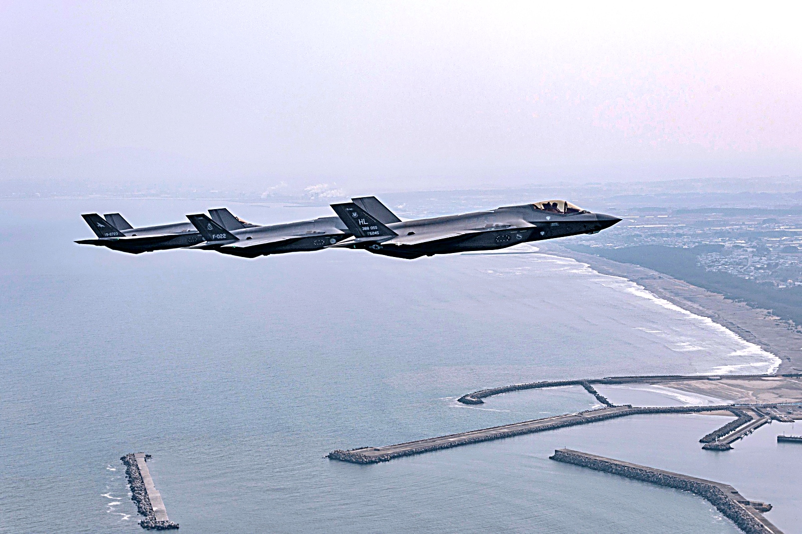 3월 26일 일본 Misawa 공군기지에서 네덜란드 공군 F-35A가 미 공군 F-35A와 F-16C 및 일본 항공자위대 F-35A 및 E-2C 조기경보기 등과 Kazagaruma Guardian 26 훈련중 임무 비행을 수행하고 있다.