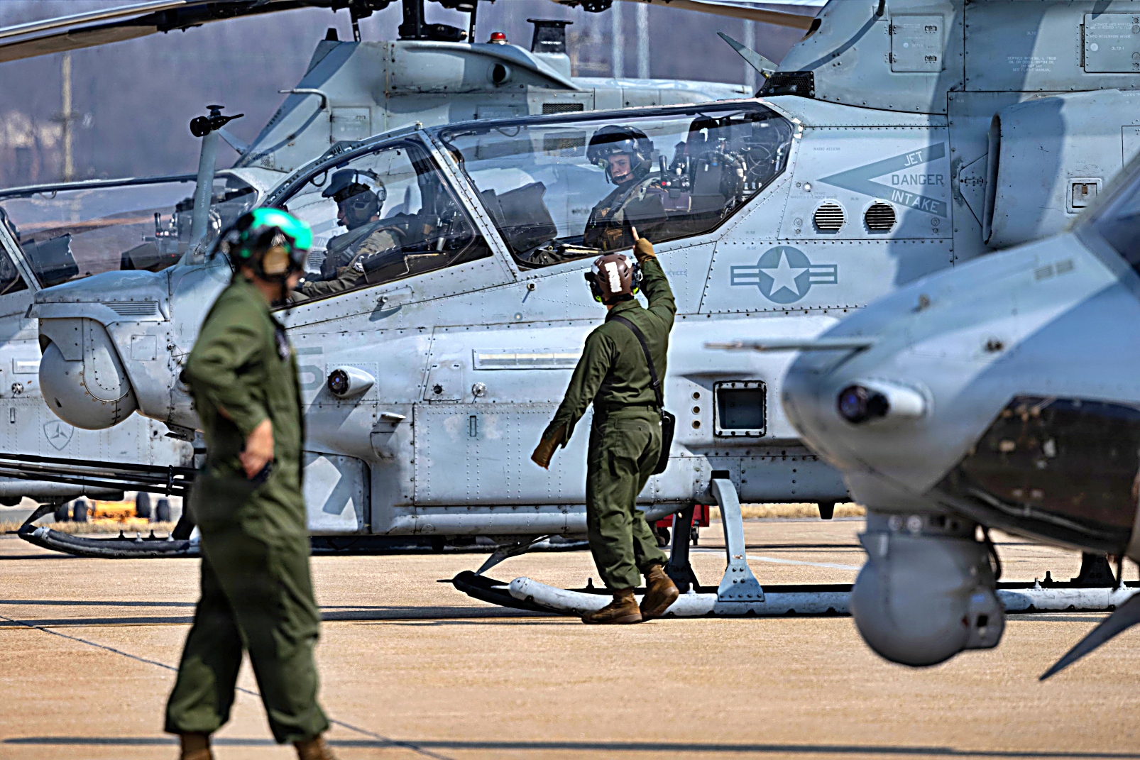 2026년 3월 25일, 한미해병교류 프로그램 (Korean Marine Exchange Program) 26.1의 일환으로 실시된 근접공중지원 훈련을 위해 경기도 오산 공군기지 상공에서 미 해병대 제1해병항공비행단 제36항공군 HMLA-369 경공격헬기비행대대 소속 AH-1Z Viper 공격헬기가 비행하고 있다. 한국해병교류 프로그램은 한국 해병대와 미 해병대 부대가 함께 훈련하며 한반도의 위협을 억제하고 평화를 유지하는 연합 능력을 향상시키는 것을 목표로 하는 반기별 훈련이다.
