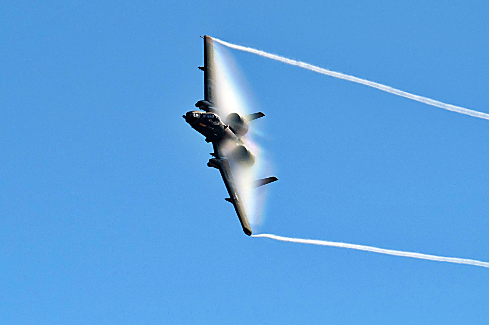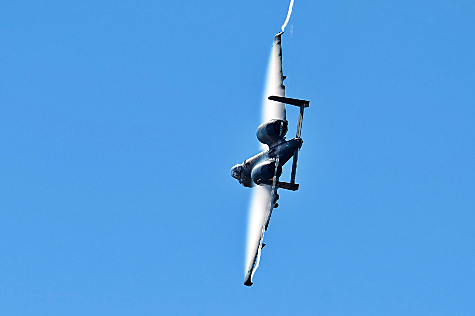 2024년 9월 20일 캘리포니아 주 Santa Maria에서 열린 Central Coast Airfest에서 A-10C Thunderbolt II 공격기가 시범비행을 펼치는 가운데 수증기 응축 현상이 발생하며 멋진 모습을 보여주고 있다.
